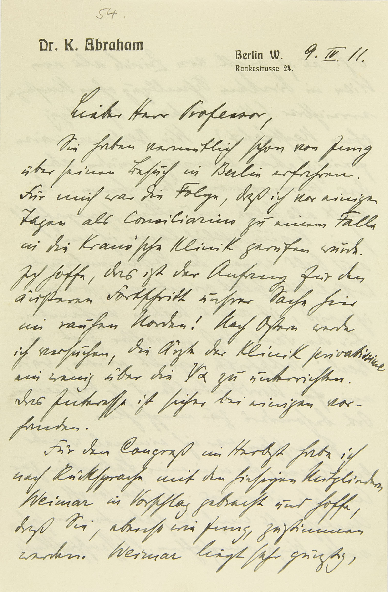 Sie haben vermutlich schon von Jung über seinen Besuch in Berlin erfahren. Für mich war die Folge, daß ich vor einigen Tagen als Konsiliarius zu einem Falle in die Kraussche Klinik gerufen wurde. Ich hoffe, das ist der Anfang für den äußeren Fortschritt unsrer Sache hier im rauhen Norden! Nach Ostern werde ich versuchen, die Ärzte der Klinik privatissime ein wenig über die Psychoanalyse zu unterrichten. Das Interesse ist sicher bei einigen vorhanden. Für den Kongreß im Herbst habe ich nach Rücksprache mit den hiesigen Mitgliedern Weimar in Vorschlag gebracht und hoffe, daß Sie, ebenso wie Jung, zustimmen werden. Weimar liegt sehr günstig,