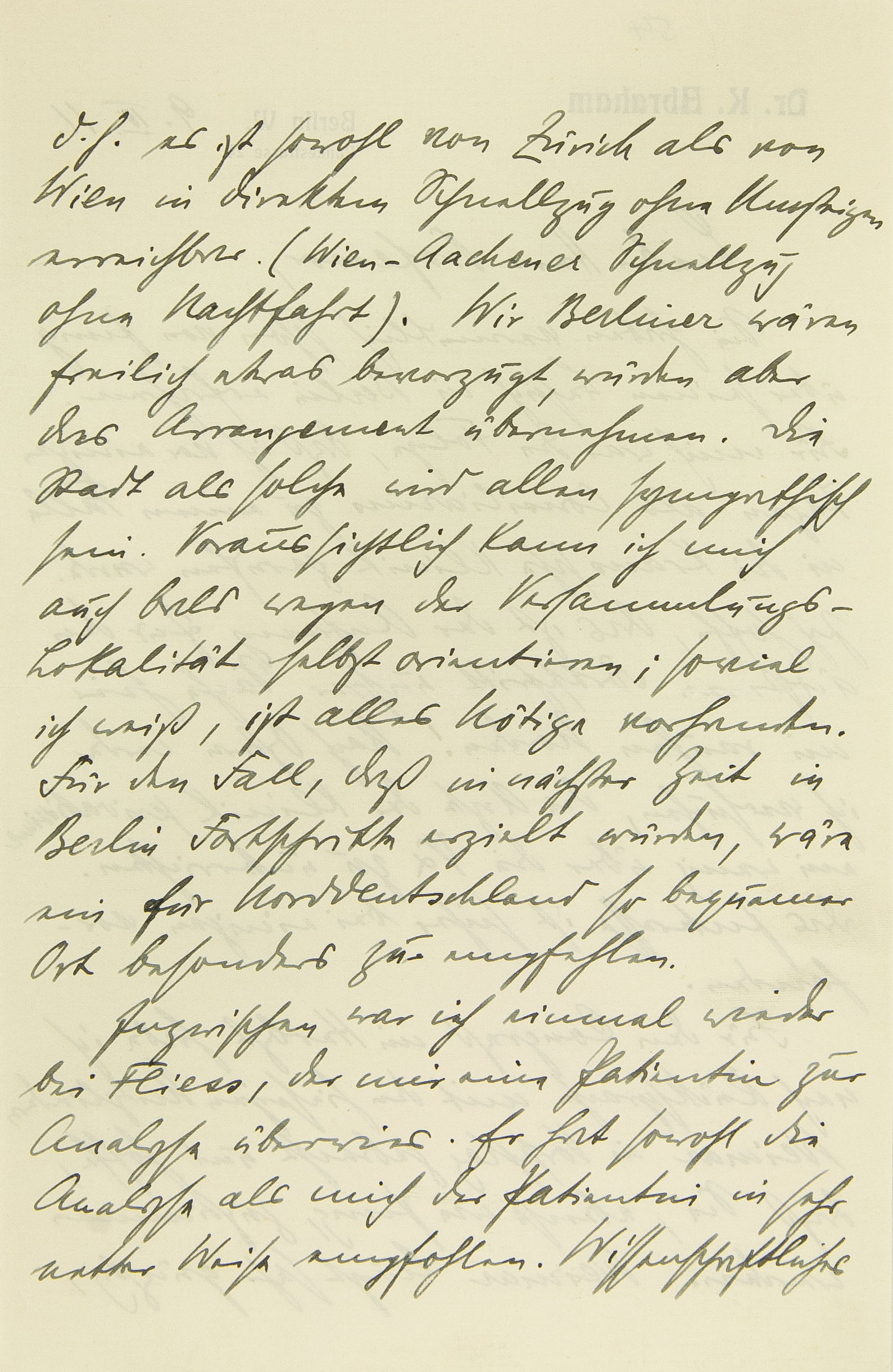 d.h. es ist sowohl von Zürich als von Wien im direkten Schnellzug ohne Umsteigen erreichbar. (Wien-Aachener Schnellzug ohne Nachtfahrt.) Wir Berliner wären freilich etwas bevorzugt, würden aber das Arrangement übernehmen. Die Stadt als solche wird allen sympathisch sein. Voraussichtlich kann ich mich auch bald wegen der Versammlungs-Lokalität selbst orientieren; soviel ich weiß, ist alles Nötige vorhanden. Für den Fall, daß in nächster Zeit in Berlin Fortschritte erzielt würden, wäre ein für Norddeutschland so bequemer Ort besonders zu empfehlen. Inzwischen war ich einmal wieder bei Fließ, der mir eine Patientin zur Analyse überwies. Er hat sowohl die Analyse als mich der Patientin in sehr netter Weise empfohlen. Wissenschaftliches