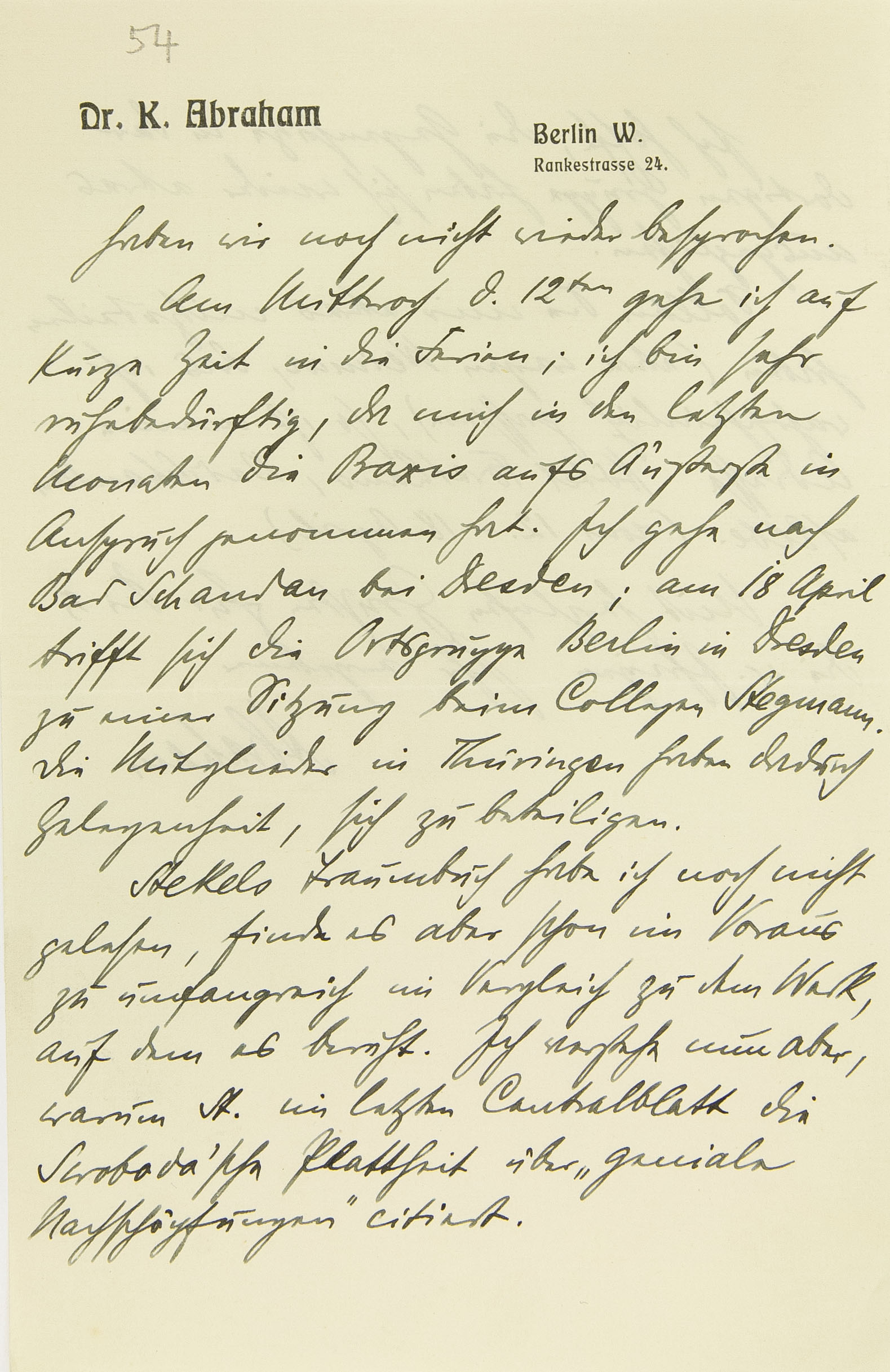 haben wir noch nicht wieder besprochen. Am Mittwoch, den 12. gehe ich auf kurze Zeit in die Ferien; ich bin sehr ruhebedürftig, da mich in den letzten Monaten die Praxis aufs äußerste in Anspruch genommen hat. Ich gehe nach Bad Schandau bei Dresden; am 18. April trifft sich die Ortsgruppe Berlin in Dresden zu einer Sitzung beim Kollegen Stegmann. Die Mitglieder in Thüringen haben dadurch Gelegenheit, sich zu beteiligen. Stekels Traumbuch habe ich noch nicht gelesen, finde es aber schon im voraus zu umfangreich im Vergleich zu dem Werk, auf dem es beruht. Ich verstehe nun aber, warum St. im letzten Zentralblatt die Swobodasche Plattheit über »geniale Nachschöpfungen« zitiert.