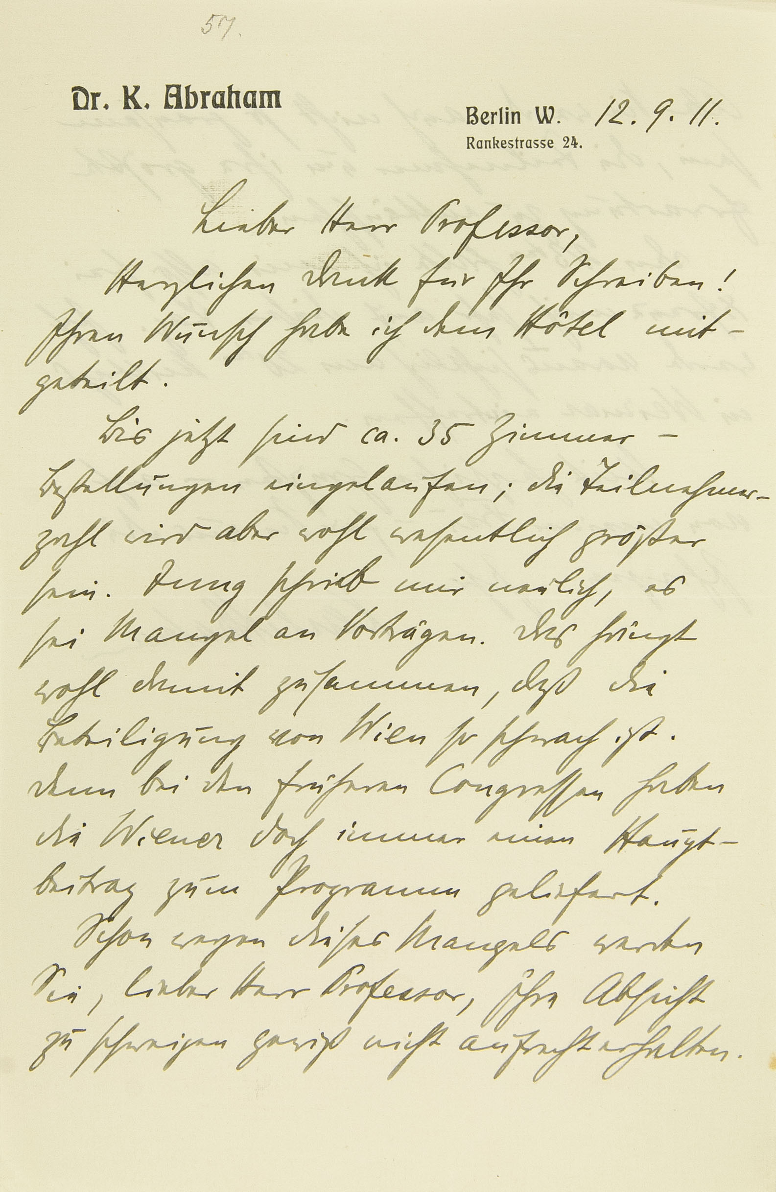 Herzlichen Dank für Ihr Schreiben! Ihren Wunsch habe ich dem Hotel mitgeteilt. Bis jetzt sind ca. 35 Zimmer-Bestellungen eingelaufen; die Teilnehmerzahl wird aber wohl wesentlich größer sein. Jung schrieb mir neulich, es sei Mangel an Vorträgen. Das hängt wohl damit zusammen, daß die Beteiligung von Wien so schwach ist. Denn bei den früheren Kongressen haben die Wiener doch immer einen Hauptbeitrag zum Programm geliefert. Schon wegen dieses Mangels werden Sie, lieber Herr Professor, Ihre Absicht zu schweigen gewiß nicht aufrechterhalten.