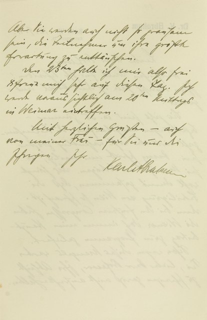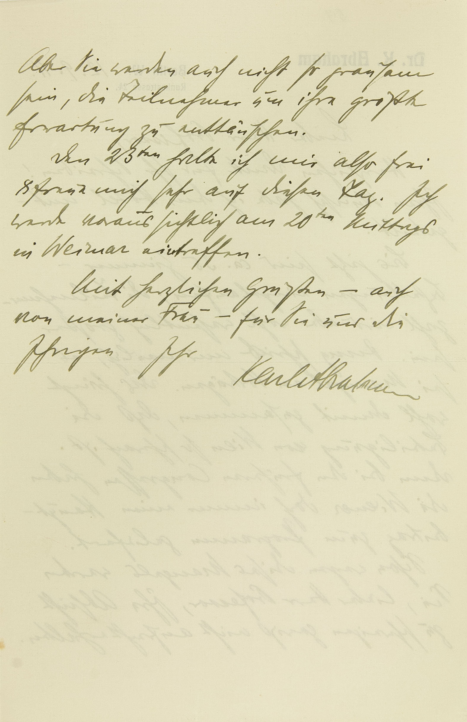 Aber Sie werden auch nicht so grausam sein, die Teilnehmer um ihre größte Erwartung zu enttäuschen. Den 23. halte ich mir also frei und freue mich sehr auf diesen Tag. Ich werde voraussichtlich am 20. mittags in Weimar eintreffen. Mit herzlichen Grüßen – auch von meiner Frau – für Sie und die Ihrigen Ihr Karl Abraham