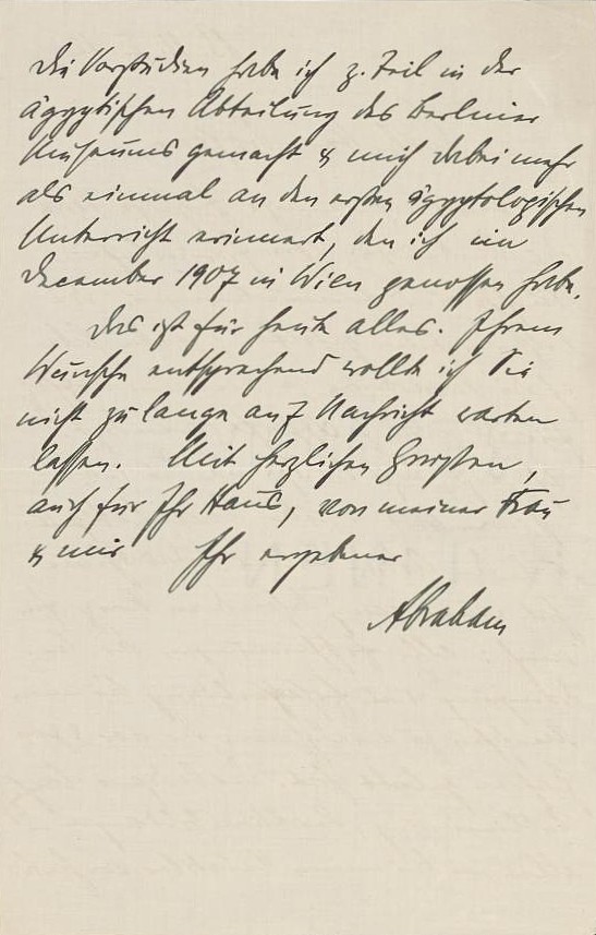 Die Vorstudien habe ich zum Teil in der ägyptischen Abteilung des Berliner Museums gemacht und mich dabei mehr als einmal an den ersten ägyptologischen Unterricht erinnert, den ich im Dezember 1907 in Wien genossen habe. Das ist für heute alles. Ihrem Wunsche entsprechend wollte ich Sie nicht zu lange auf Nachricht warten lassen. Mit herzlichen Grüßen, auch für Ihr Haus, von meiner Frau und mir Ihr ergebener Abraham