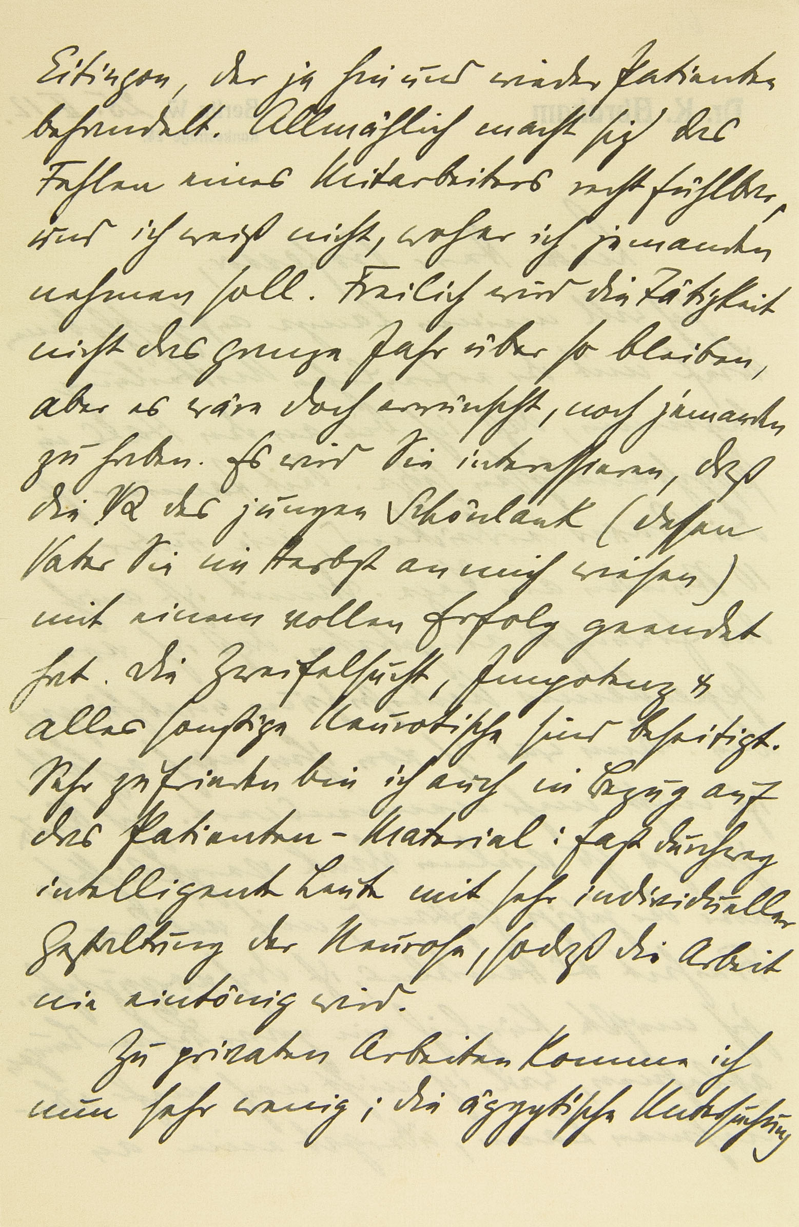 Eitingon, der ja hin und wieder Patienten behandelt. Allmählich macht sich das Fehlen eines Mitarbeiters recht fühlbar, und ich weiß nicht, woher ich jemanden nehmen soll. Freilich wird die Tätigkeit nicht das ganze Jahr über so bleiben, aber es wäre doch erwünscht, noch jemanden zu haben. Es wird Sie interessieren, daß die Psychoanalyse des jungen Schönlank (dessen Vater Sie im Herbst an mich wiesen) mit einem vollen Erfolg geendet hat. Die Zweifelsucht, Impotenz und alles sonstige Neurotische sind beseitigt. Sehr zufrieden bin ich auch in bezug auf das Patienten-Material: fast durchweg intelligente Leute mit sehr individueller Gestaltung der Neurose, sodaß die Arbeit nie eintönig wird. Zu privaten Arbeiten komme ich nun sehr wenig; die ägyptische Untersuchung