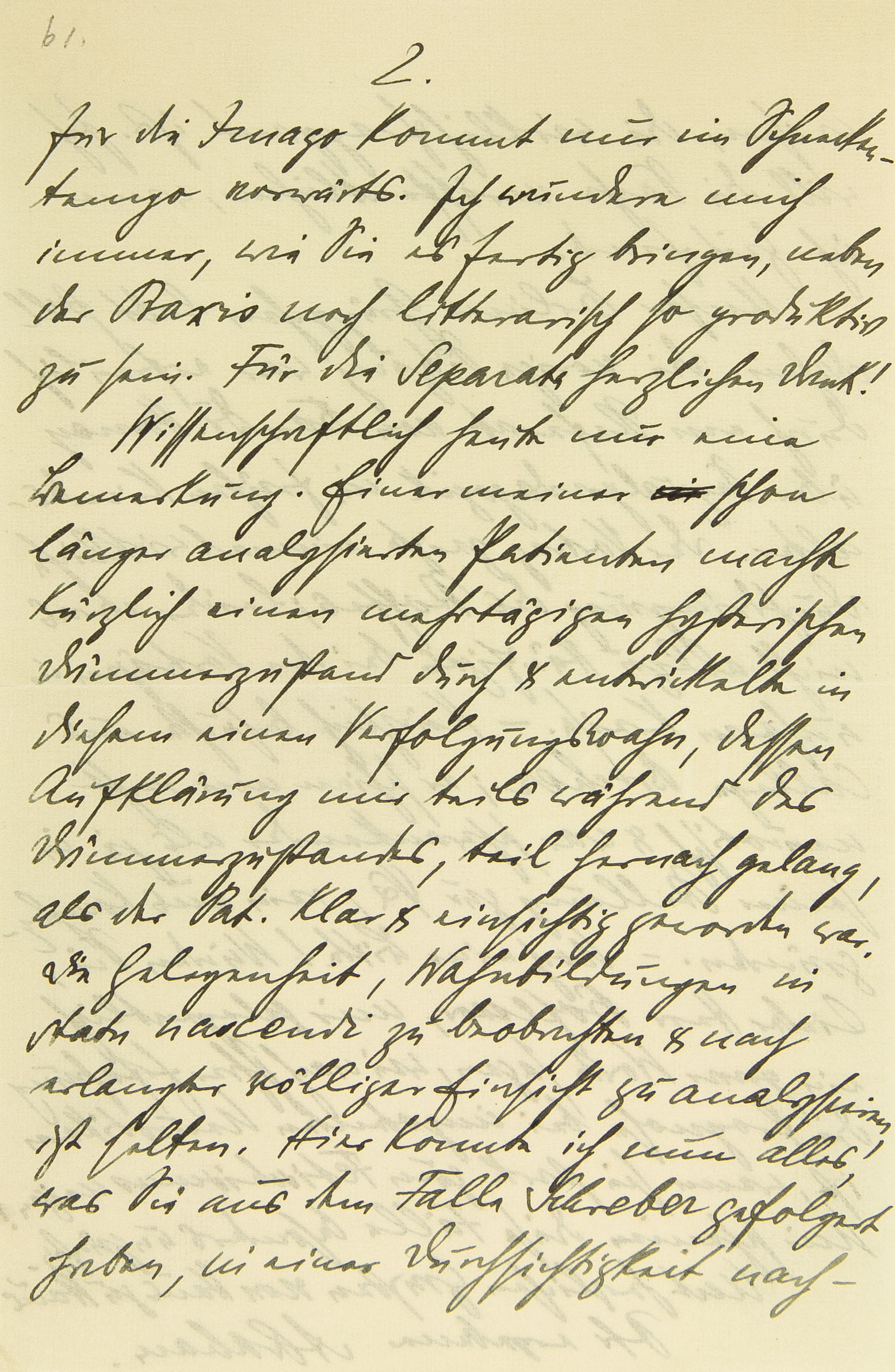 für die Imago kommt nur im Schneckentempo vorwärts. Ich wundere mich immer, wie Sie es fertig bringen, neben der Praxis noch literarisch so produktiv zu sein. Für die Separata herzlichen Dank! Wissenschaftlich heute nur eine Bemerkung. Einer meiner Aschon länger analysierten Patienten machte kürzlich einen mehrtägigen hysterischen Dämmerzustand durch und entwickelte in diesem einen Verfolgungswahn, dessen Aufklärung mir teils während des Dämmerzustandes, teils hernach gelang, als der Pat. klar und einsichtig geworden war. Die Gelegenheit, Wahnbildungen in statu nascendi zu beobachten und nach erlangter völliger Einsicht zu analysieren, ist selten. Hier konnte ich nun alles, was Sie aus dem Falle Schreber gefolgert haben, in einer Durchsichtigkeit nach-