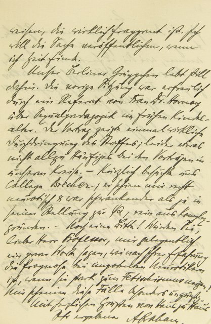 weisen, die wirklich frappant ist. Ich will die Sache veröffentlichen, wenn ich Zeit finde. Unser Berliner Grüppchen lebt still dahin. Die vorige Sitzung war erfreulich durch ein Referat von Frau Dr. Horney über Sexualpädagogik im frühen Kindesalter. Der Vortrag zeigte einmal wirkliche Durchdringung des Stoffes; leider etwas nicht allzu Häufiges bei den Vorträgen in unserem Kreise. – Kürzlich besuchte uns Kollege Brecher; er schien mir recht neurotisch und war schwankender als je in seiner Stellung zur Psychoanalyse, rein aus Komplexgründen. – Noch eine Bitte! Würden Sie, lieber Herr Professor, mir gelegentlich ein paar Worte sagen, wie nach Ihrer Erfahrung die Prognose bei impotenten Neurotikern ist, wenn sie stark zum Fetischismus neigen? Mir scheinen diese Fälle besonders ungünstig. Mit herzlichen Grüßen von Haus zu Haus Ihr ergebener Abraham