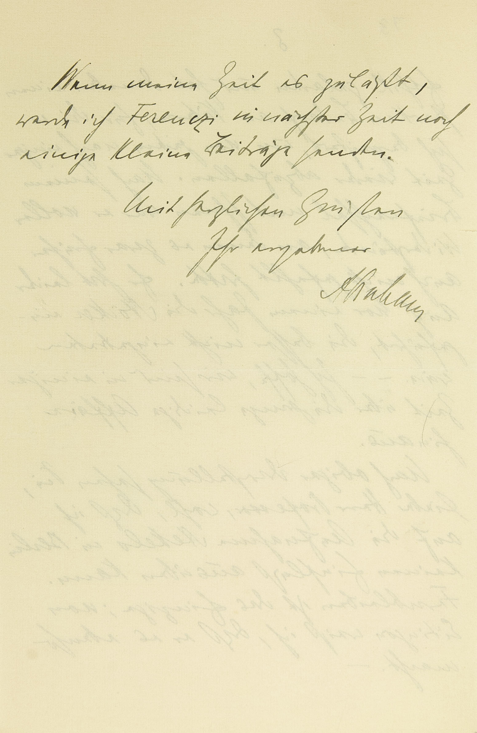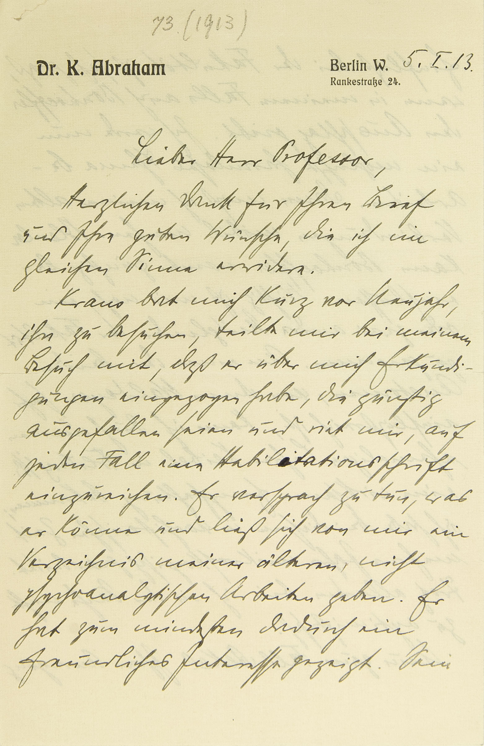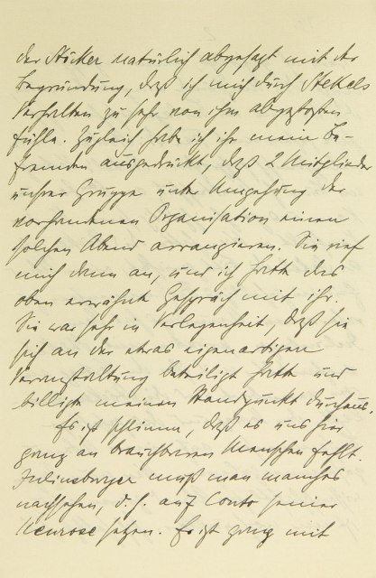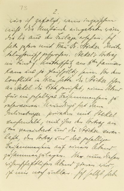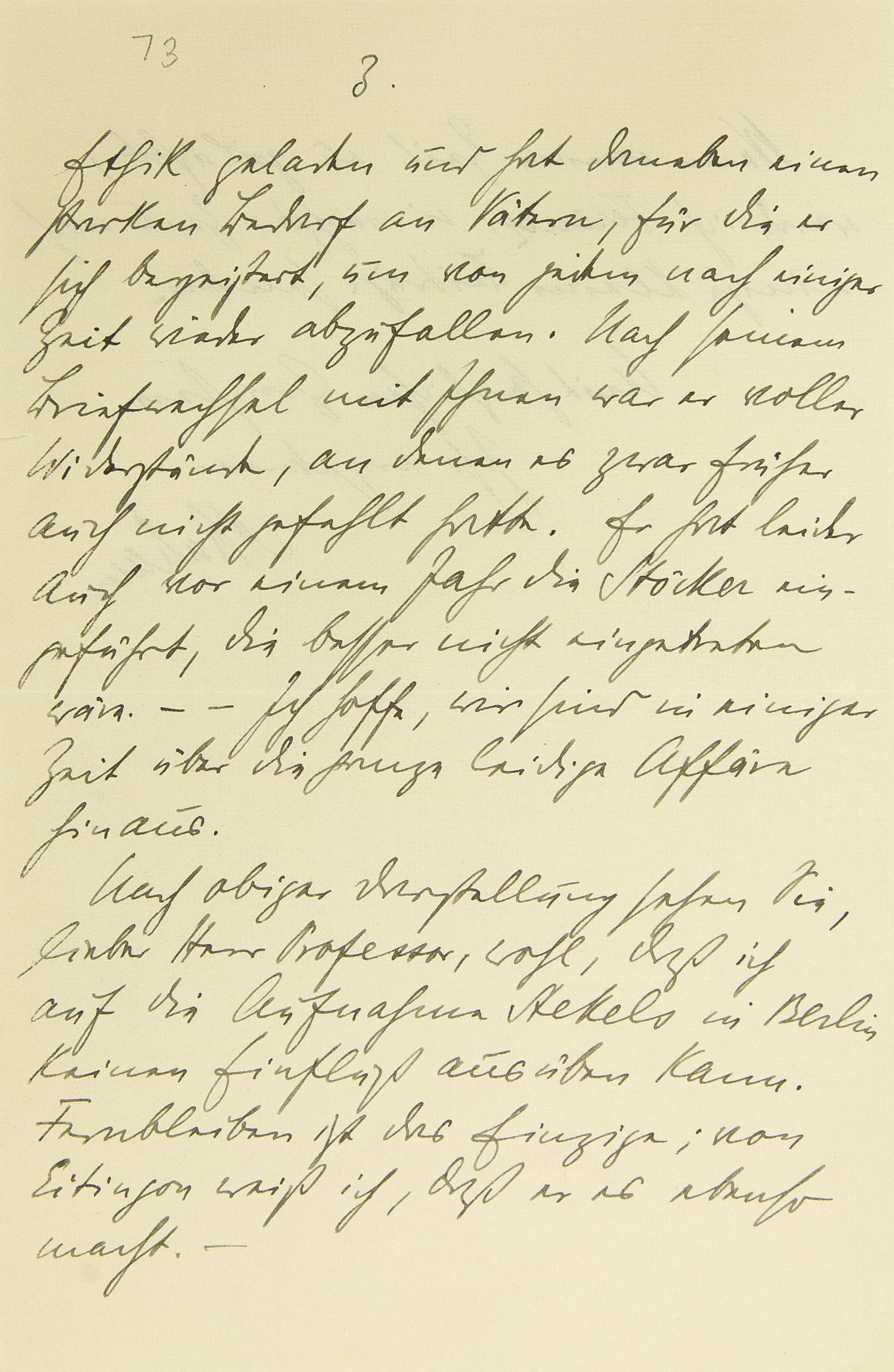 Ethik geladen und hat daneben einen starken Bedarf an Vätern, für die er sich begeistert, um von jedem nach einiger Zeit wieder abzufallen. Nach seinem Briefwechsel mit Ihnen war er voller Widerstände, an denen es zwar früher auch nicht gefehlt hatte. Er hat leider auch vor einem Jahr die Stöcker eingeführt, die besser nicht eingetreten wäre. – – Ich hoffe, wir sind in einiger Zeit über die ganze leidige Affäre hinaus. Nach obiger Darstellung sehen Sie, lieber Herr Professor, wohl, daß ich auf die Aufnahme Stekels in Berlin keinen Einfluß ausüben kann. Fernbleiben ist das einzige; von Eitingon weiß ich, daß er es ebenso macht. –