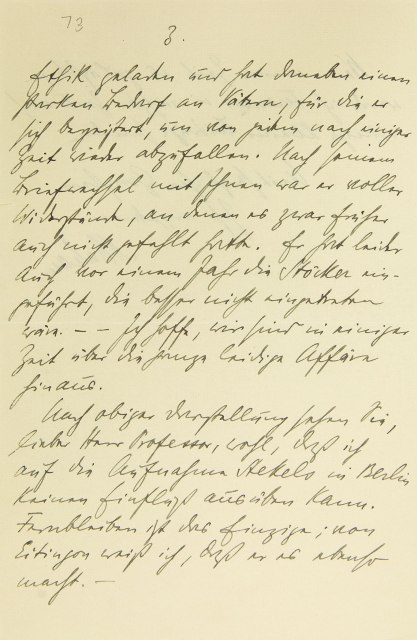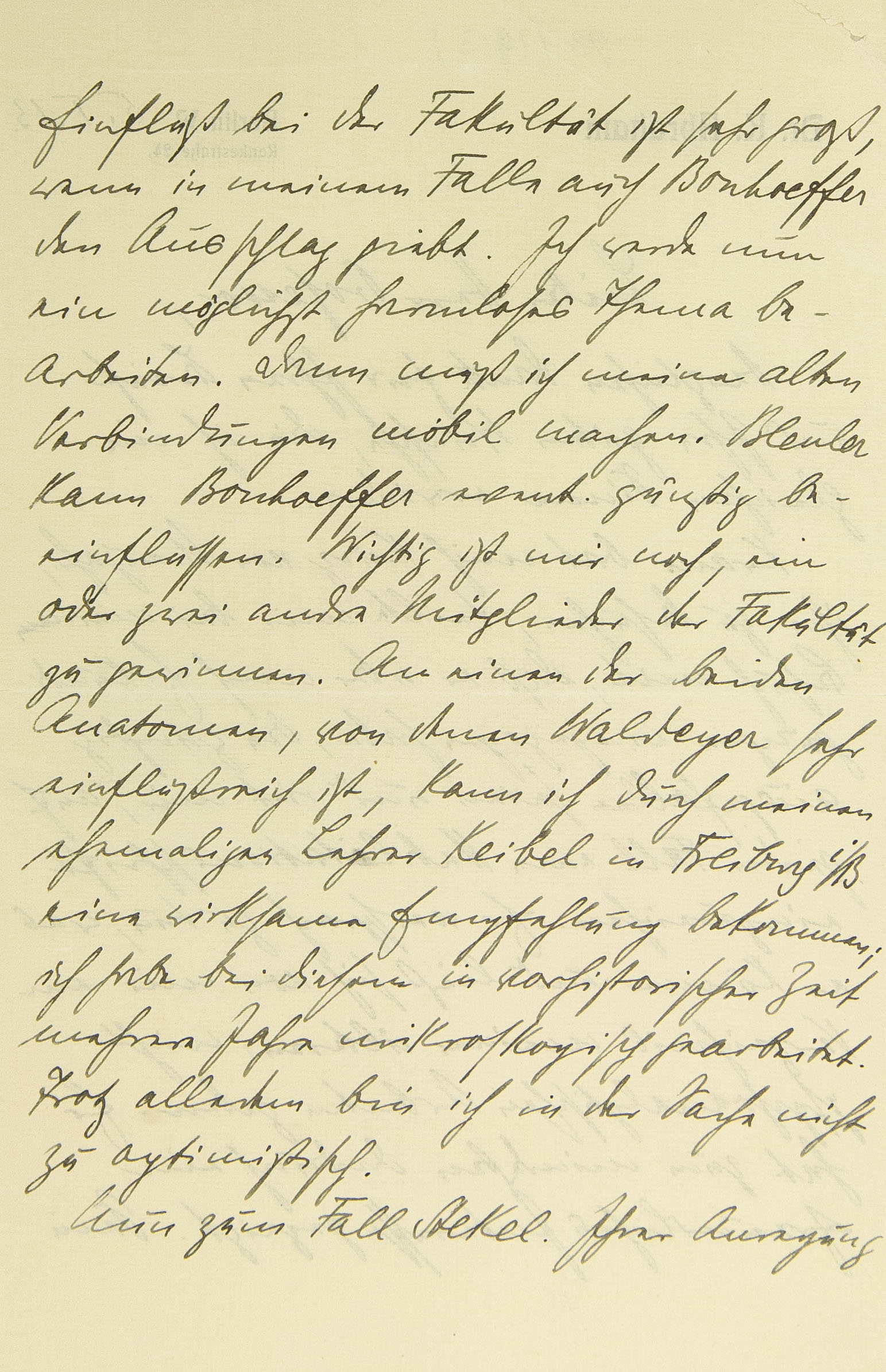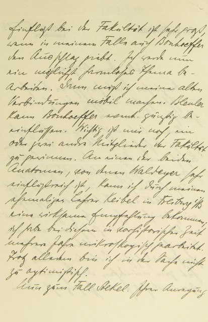 Einfluß bei der Fakultät ist sehr groß, wenn in meinem Fall auch Bonhoeffer den Ausschlag gibt. Ich werde nun ein möglichst harmloses Thema bearbeiten. Dann muß ich meine alten Verbindungen mobil machen. Bleuler kann Bonhoeffer eventuell günstig beeinflussen. Wichtig ist mir noch, ein oder zwei andere Mitglieder der Fakultät zu gewinnen. An einen der beiden Anatomen, von denen Waldeyer sehr einflußreich ist, kann ich durch meinen ehemaligen Lehrer Keibel in Freiburg i. B. eine wirksame Empfehlung bekommen; ich habe bei diesem in vorhistorischer Zeit mehrere Jahre mikroskopisch gearbeitet. Trotz alledem bin ich in der Sache nicht zu optimistisch. Nun zum Fall Stekel. Ihrer Anregung