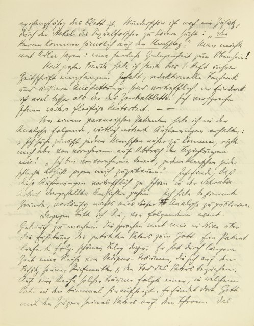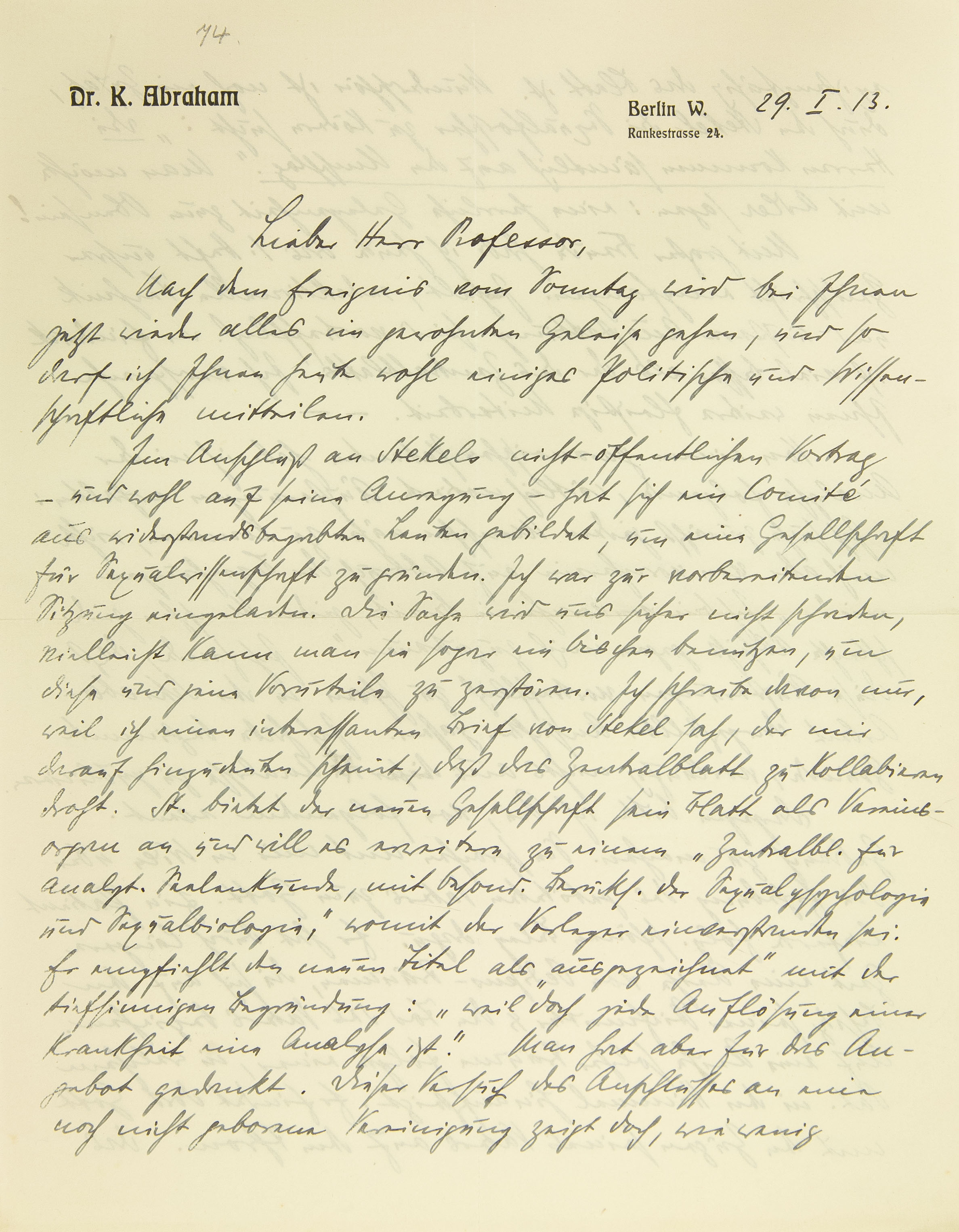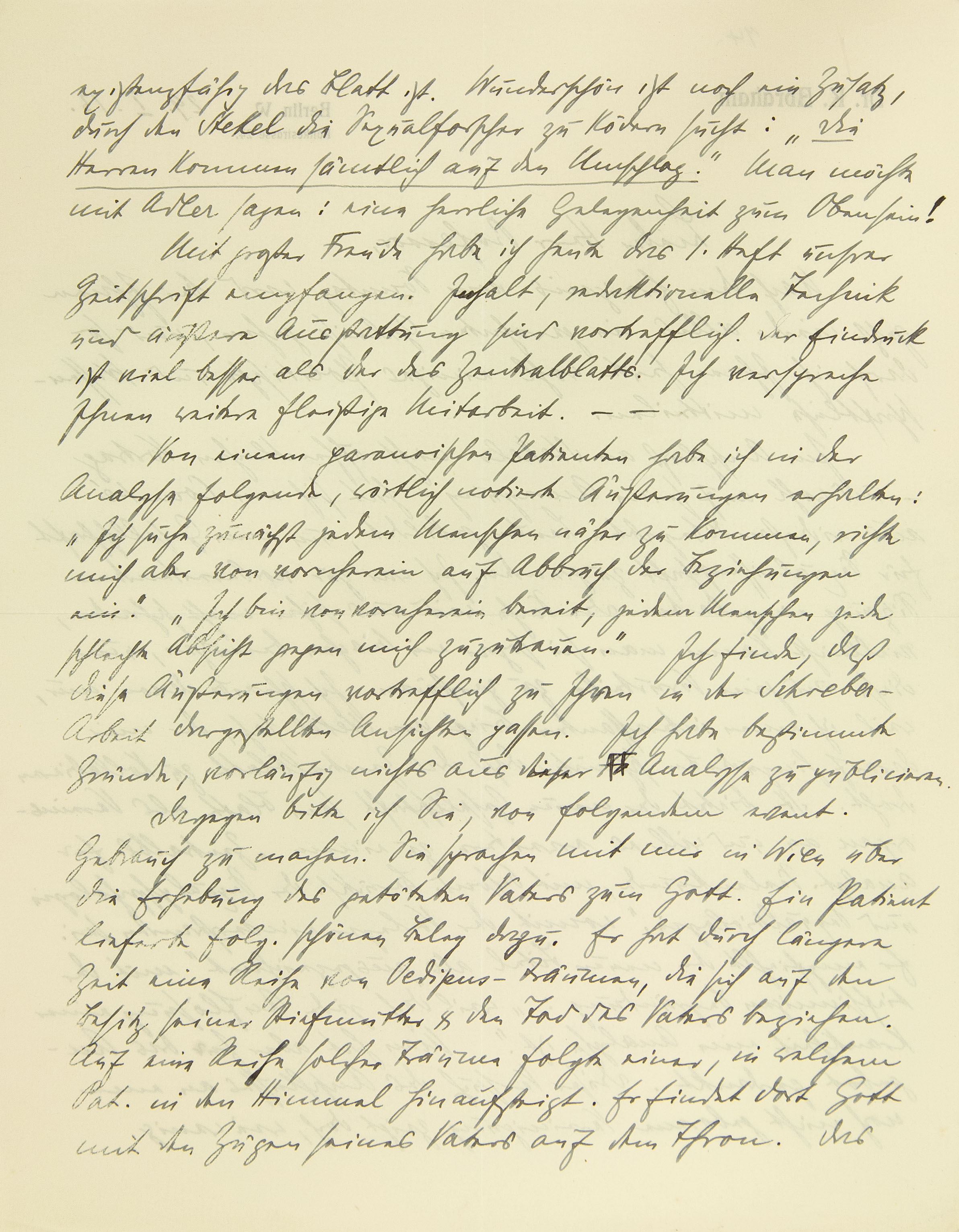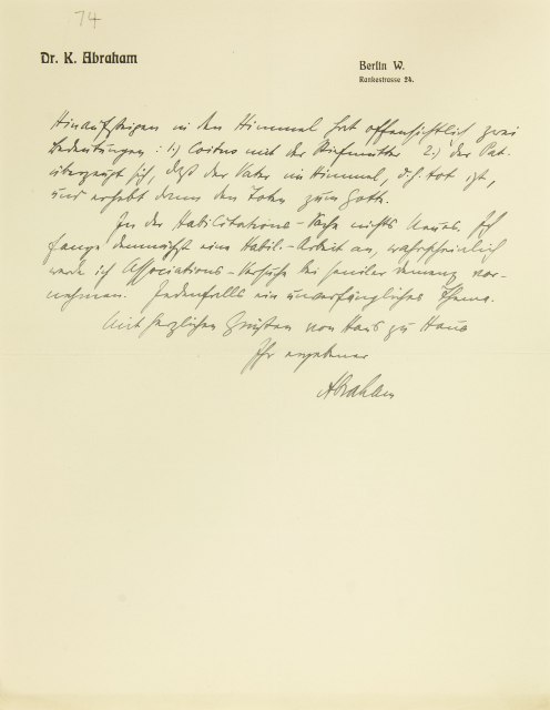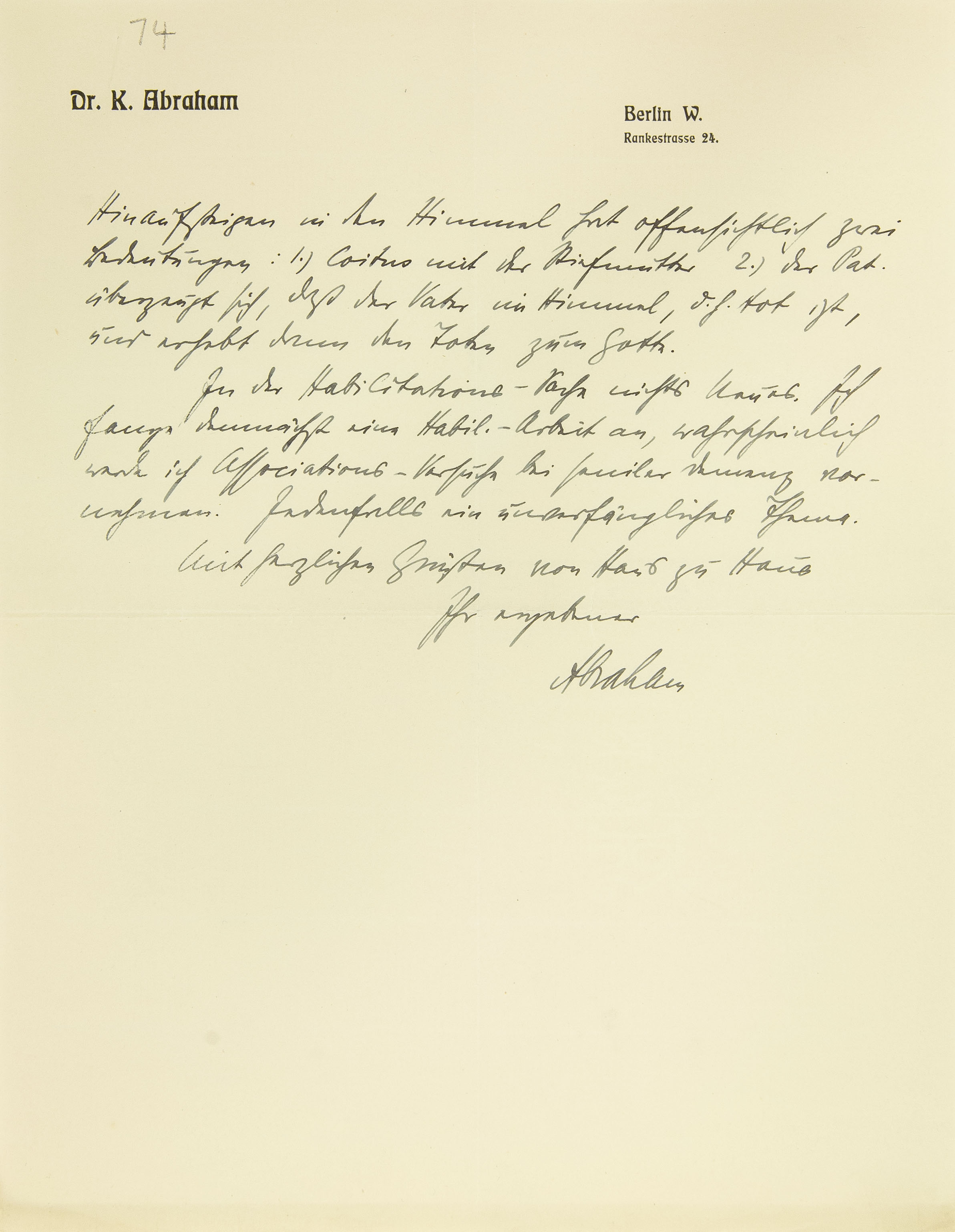 Hinaufsteigen in den Himmel hat offensichtlich zwei Bedeutungen: 1.) Koitus mit der Stiefmutter, 2.) der Pat. überzeugt sich, daß der Vater im Himmel, d.h. tot ist, und erhebt dann den Toten zum Gotte. In der Habilitations-Sache nichts Neues. Ich fange demnächst eine Habilitations-Arbeit an, wahrscheinlich werde ich Assoziations-Versuche bei seniler Demenz vornehmen. Jedenfalls ein unverfängliches Thema. Mit herzlichen Grüßen von Haus zu Haus Ihr ergebener Abraham