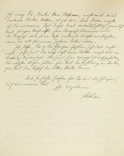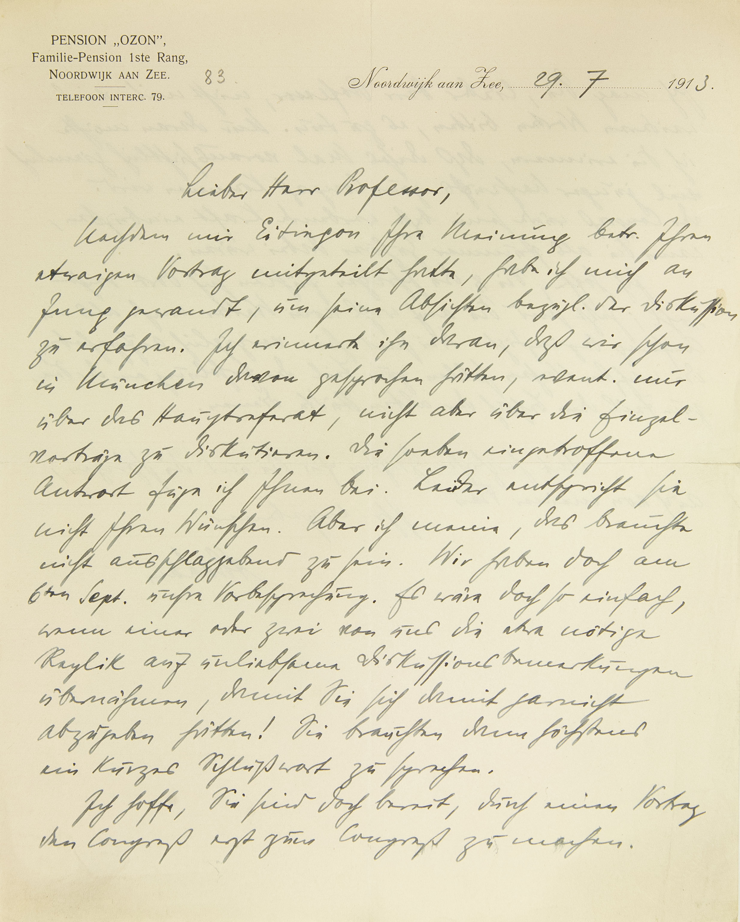 Ich mag Sie, lieber Herr Professor, nicht mit viel weiteren Worten bitten, es zu tun. Nur daran möchte ich Sie erinnern, daß dieses Mal voraussichtlich ziemlich viel junger Nachwuchs zum Kongreß kommen wird. Der Kongreß würde seine beste werbende Kraft einbüßen, wenn Sie als stummer Zuhörer dabei wären. Ich hoffe, Sie und die Ihrigen fühlen sich dort recht wohl; jetzt sind Sie auch wohl vom Wetter mehr als im Anfang begünstigt. Wir sind hier vorzüglich aufgehoben; die nächsten Wochen sollen zum Teil der Erholung an der See, zum Teil dem Besuch der alten Städte dienen.