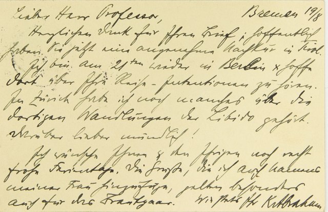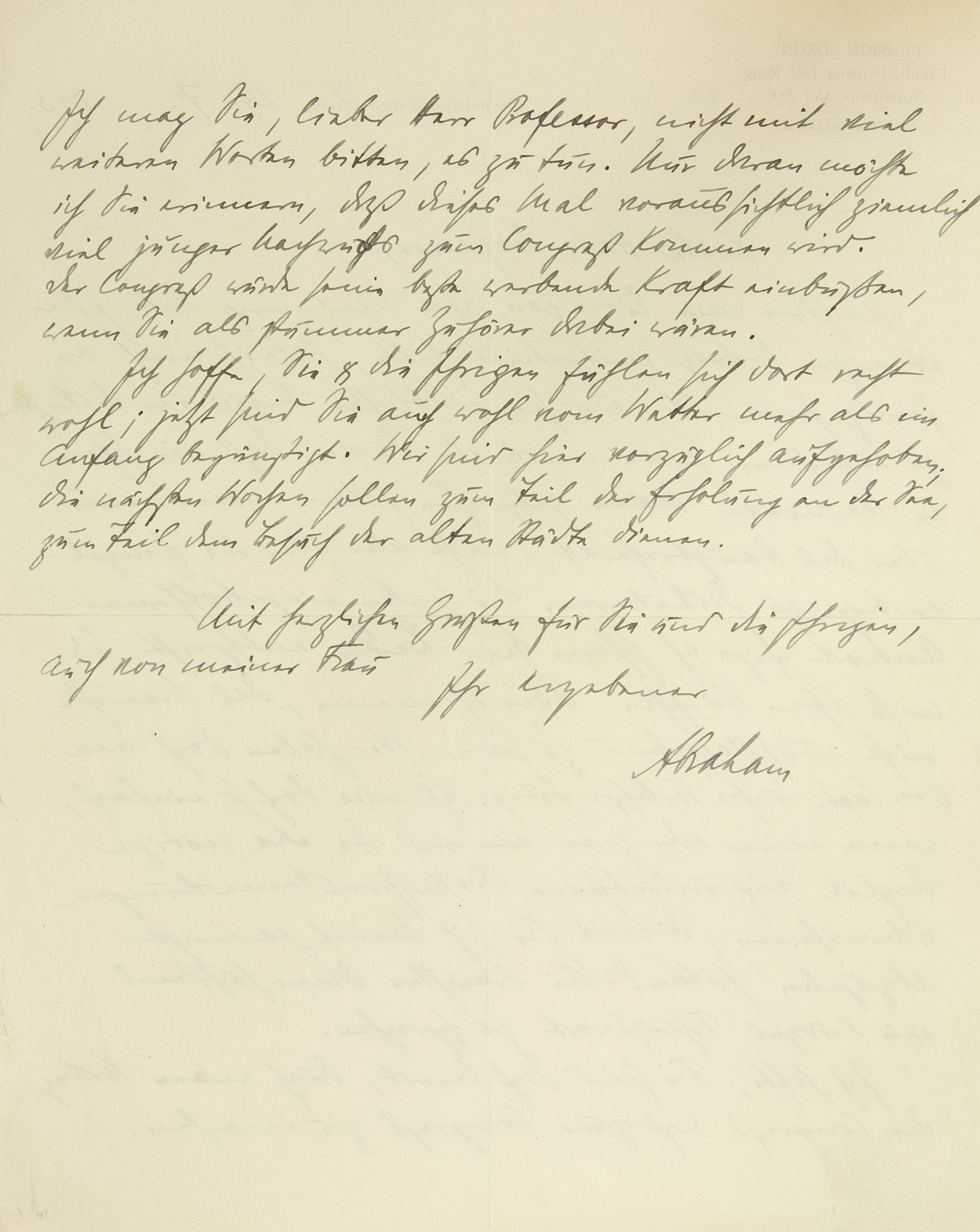 Sehr geehrter Herr Kollege! Ich habe Kenntnis genommen von der Anmeldung Ihres Vortrages über »Neurotische Einschränkungen etc.« Ich möchte die Redezeit für den Vortrag auf 25 Minuten Maximum einsetzen. Wenn irgend möglich, soll auch bei den einzelnen Vorträgen diskutiert werden, nicht nur bei den Referaten. Das bloße Anhören von Vorträgen ist zu leer. Es wird Sache des Präsidenten und des guten Willens der Versammlung sein, die Diskussionen nicht übermäßig auszudehnen, sodaß die ganze Sache behandelt werden kann. Mit kollegialen Grüssen