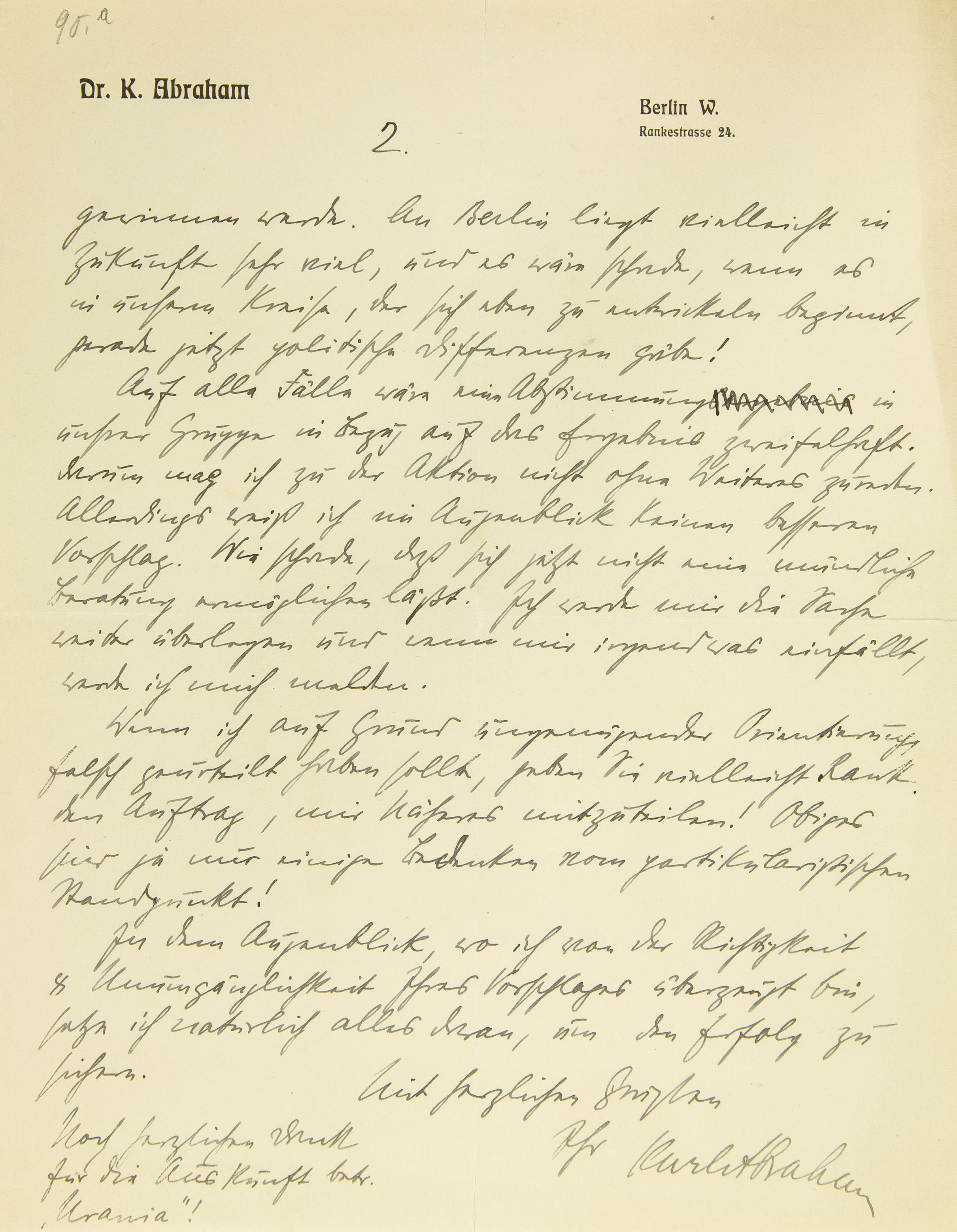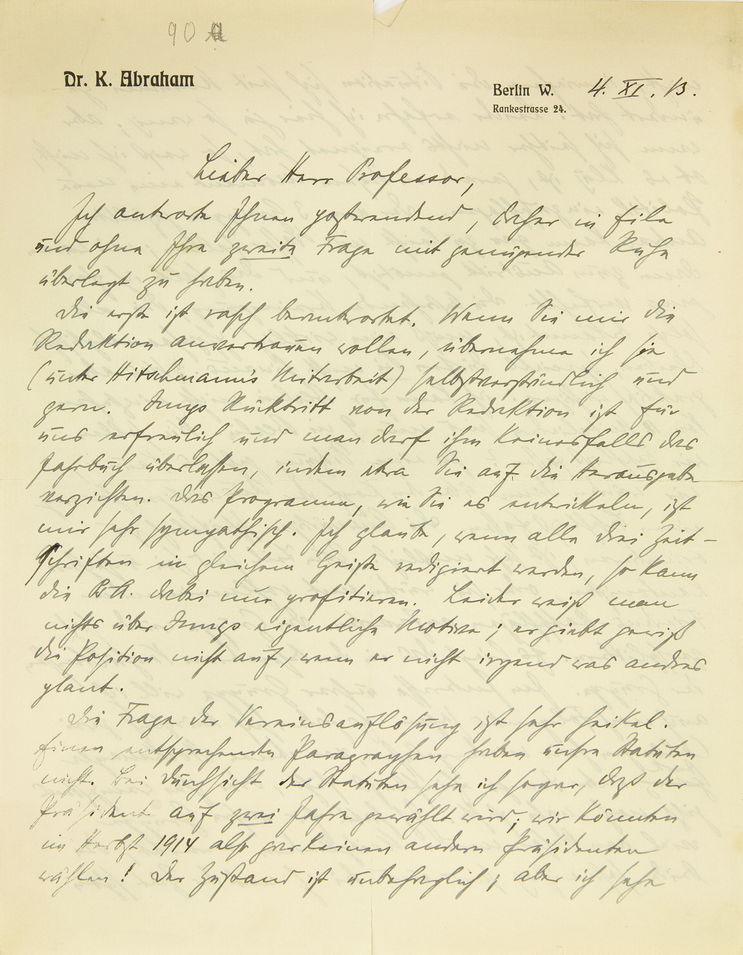 Ich antworte Ihnen postwendend, daher in Eile und ohne Ihre zweite Frage mit genügender Ruhe überlegt zu haben. Die erste ist rasch beantwortet. Wenn Sie mir die Redaktion anvertrauen wollen, übernehme ich sie (unter Hitschmanns Mitarbeit) selbstverständlich und gern. Jungs Rücktritt von der Redaktion ist für uns erfreulich, und man darf ihm keinesfalls das Jahrbuch überlassen, indem etwa Sie auf die Herausgabe verzichten. Das Programm, wie Sie es entwickeln, ist mir sehr sympathisch. Ich glaube, wenn alle drei Zeitschriften in gleichem Geiste redigiert werden, so kann die Psychoanalyse dabei nur profitieren. Leider weiß man nichts über Jungs eigentliche Motive; er gibt gewiß die Position nicht auf, wenn er nicht irgendwas andres plant. Die Frage der Vereinsauflösung ist sehr heikel. Einen entsprechenden Paragraphen haben unsre Statuten nicht. Bei Durchsicht der Statuten sehe ich sogar, daß der Präsident auf zwei Jahre gewählt wird; wir könnten im Herbst 1914 also gar keinen andern Präsidenten wählen! Der Zustand ist unbehaglich; aber ich sehe