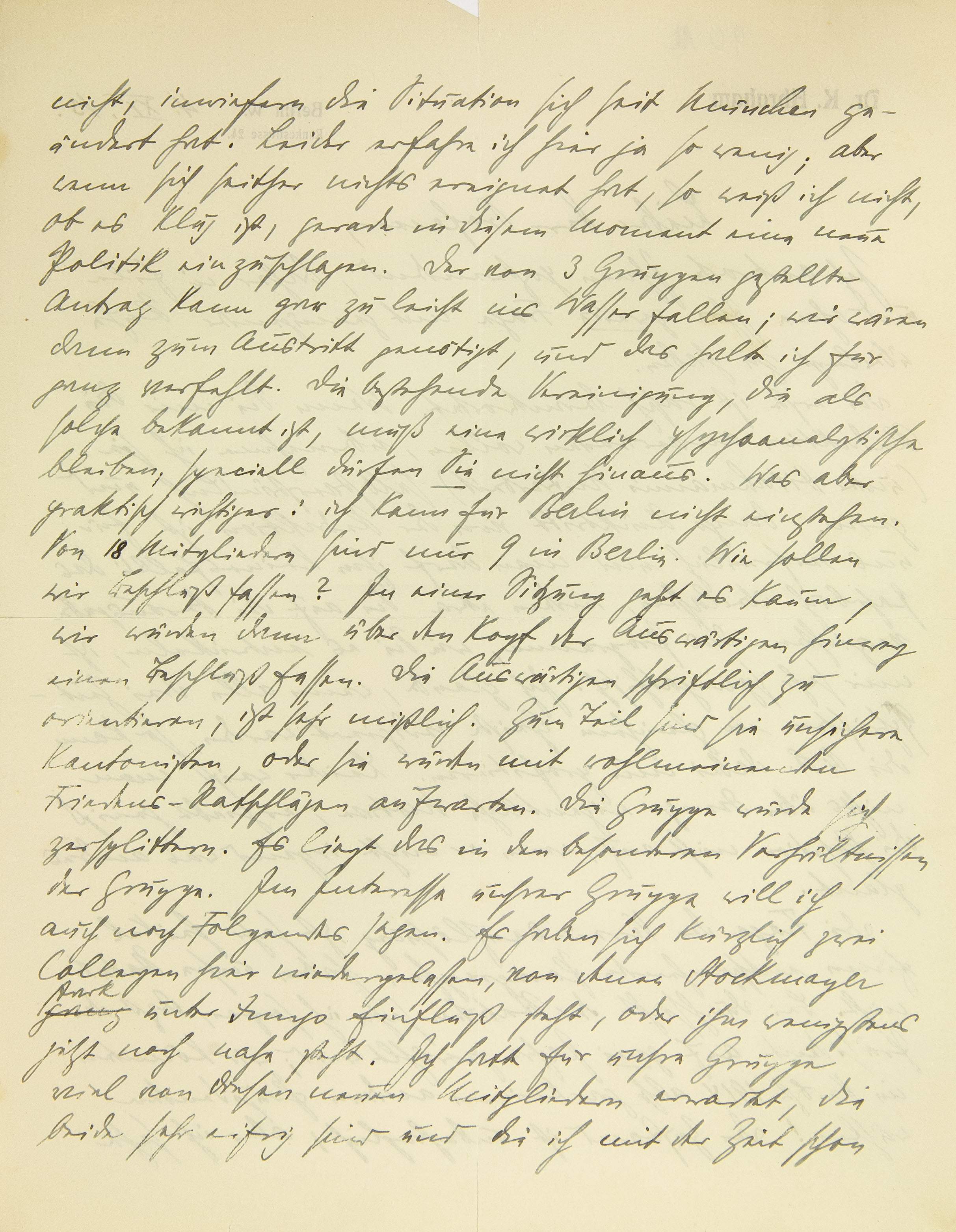 nicht, inwiefern sich die Situation seit München geändert hat. Leider erfahre ich hier ja so wenig; aber wenn sich seither nichts ereignet hat, so weiß ich nicht, ob es klug ist, gerade in diesem Moment eine neue Politik einzuschlagen. Der von drei Gruppen gestellte Antrag kann gar zu leicht ins Wasser fallen; wir wären dann zum Austritt genötigt, und das halte ich für ganz verfehlt. Die bestehende Vereinigung, die als solche bekannt ist, muß eine wirklich psychoanalytische bleiben; speziell dürfen Sie nicht hinaus. Was aber praktisch wichtiger: ich kann für Berlin nicht einstehen. Von 18 Mitgliedern sind nur neun in Berlin. Wie sollen wir Beschluß fassen? In einer Sitzung geht es kaum, wir würden dann über den Kopf der Auswärtigen hinweg einen Beschluß fassen. Die Auswärtigen schriftlich zu orientieren, ist sehr mißlich. Zum Teil sind sie unsichere Kantonisten, oder sie würden mit wohlmeinenden Friedens-Ratschlägen aufwarten. Die Gruppe würde sich zersplittern. Es liegt das in den besonderen Verhältnissen der Gruppe. Im Interesse unsrer Gruppe will ich auch noch folgendes sagen. Es haben sich kürzlich zwei Kollegen hier niedergelassen, von denen Stockmayer stark unter Jungs Einfluß steht, oder ihm wenigstens jetzt noch nahe steht. Ich hatte für unsre Gruppe viel von diesen Mitgliedern erwartet, die beide sehr eifrig sind und die ich mit der Zeit schon