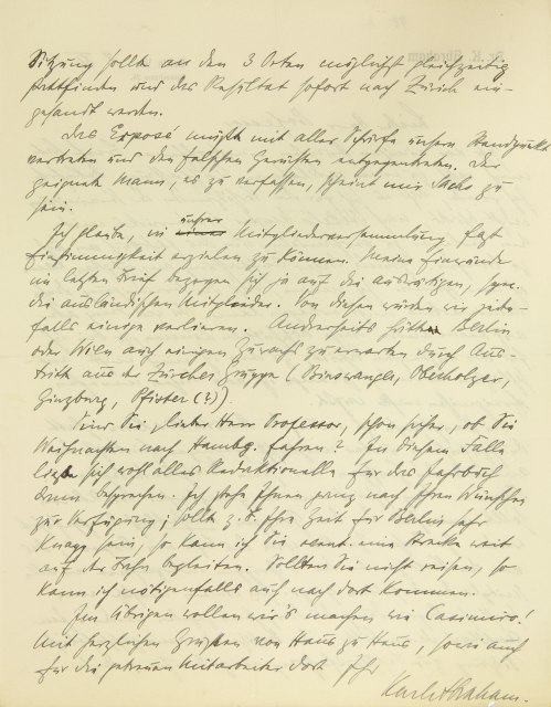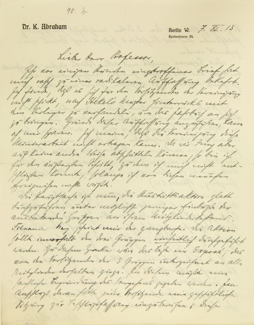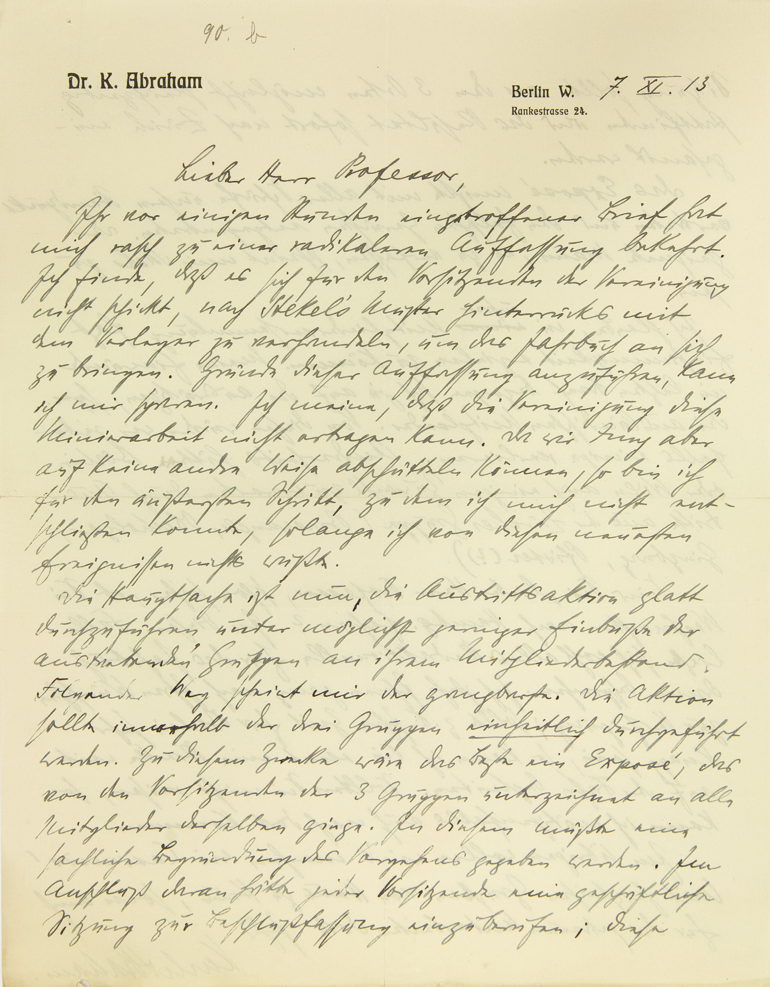 Sitzung sollte an den drei Orten möglichst gleichzeitig stattfinden und das Resultat sofort nach Zürich eingesandt werden. Das Exposé müßte mit aller Schärfe unsern Standpunkt vertreten und den falschen Gerüchten entgegentreten. Der geeignete Mann, es zu verfassen, scheint mir Sachs zu sein. Ich glaube, in unsrer Mitgliederversammlung fast Einstimmigkeit erzielen zu können. Meine Einwände im letzten Brief bezogen sich ja auf die auswärtigen, speziell die ausländischen Mitglieder. Von diesen würden wir jedenfalls einige verlieren. Andrerseits hätte Berlin oder Wien auch einigen Zuwachs zu erwarten durch Austritte aus der Zürcher Gruppe (Binswanger, Oberholzer, Ginzburg, Pfister (?)). Sind Sie, lieber Herr Professor, schon sicher, ob Sie Weihnachten nach Hamburg fahren? In diesem Falle ließe sich wohl alles Redaktionelle für das Jahrbuch dann besprechen. Ich stehe Ihnen ganz nach Ihren Wünschen zur Verfügung; sollte z.B. Ihre Zeit für Berlin sehr knapp sein, so kann ich Sie eventuell eine Strecke weit auf der Bahn begleiten. Sollten Sie nicht reisen, so kann ich nötigenfalls auch nach dort kommen. Im übrigen wollen wir’s machen wie Casimiro! Mit herzlichen Grüßen von Haus zu Haus, sowie auch für die getreuen Mitarbeiter dort Ihr Karl Abraham