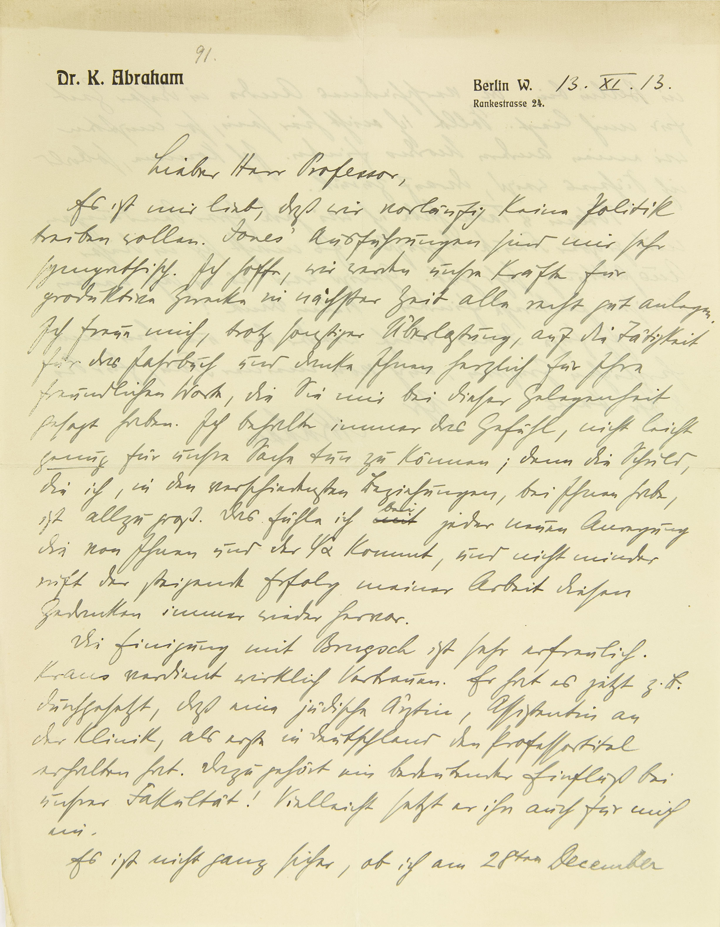 Es ist mir lieb, daß wir vorläufig keine Politik treiben wollen. Jones’ Ausführungen sind mir sehr sympathisch. Ich hoffe, wir werden unsre Kräfte für produktive Zwecke in nächster Zeit alle recht gut anlegen. Ich freue mich, trotz sonstiger Überlastung, auf die Tätigkeit für das Jahrbuch, und danke Ihnen herzlich für Ihre freundlichen Worte, die Sie mir bei dieser Gelegenheit gesagt haben. Ich behalte immer das Gefühl, nicht leicht genug für unsre Sache tun zu können; denn die Schuld, die ich, in den verschiedensten Beziehungen, bei Ihnen habe, ist allzu groß. Das fühle ich bei jeder neuen Anregung, die von Ihnen und der Psychoanalyse kommt, und nicht minder ruft der steigende Erfolg meiner Arbeit diesen Gedanken immer wieder hervor. Die Einigung mit Brugsch ist sehr erfreulich. Kraus verdient wirklich Vertrauen. Er hat es jetzt z.B. durchgesetzt, daß eine jüdische Ärztin, Assistentin an der Klinik, als erste in Deutschland den Professortitel erhalten hat. Dazu gehört ein bedeutender Einfluß bei unsrer Fakultät! Vielleicht setzt er ihn auch für mich ein. Es ist nicht ganz sicher, ob ich am 28. Dezember