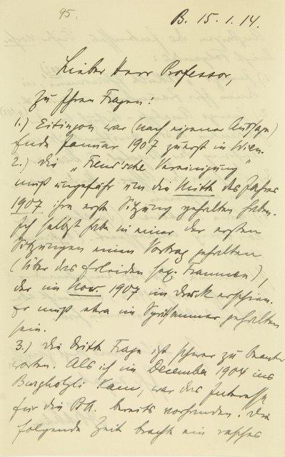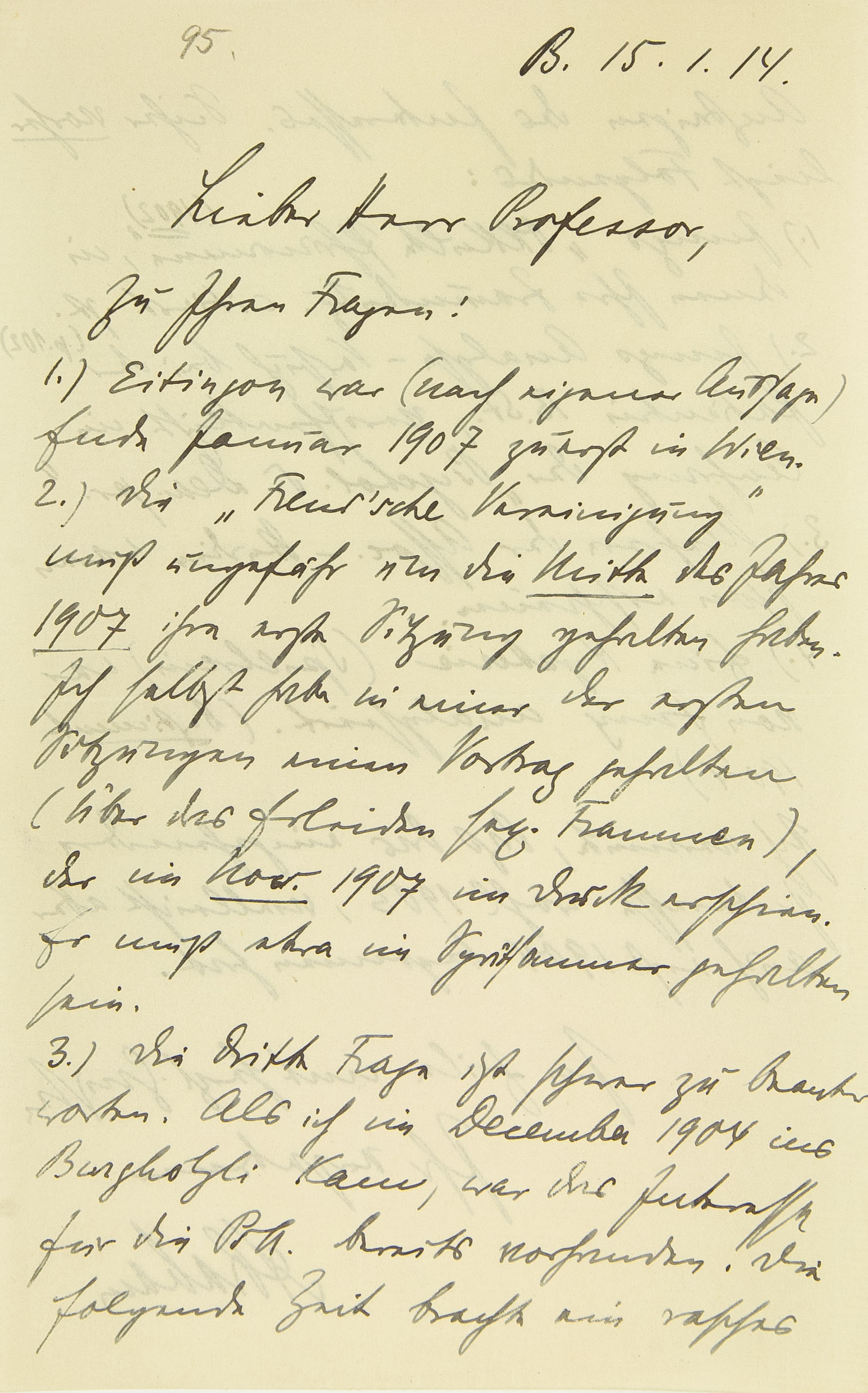 Berlin, 15. 1. 14. Lieber Herr Professor, Zu Ihren Fragen: 1.) Eitingon war (nach eigener Aussage) Ende Januar 1907 zuerst in Wien. 2.) Die »Freudsche Vereinigung« muß ungefähr um die Mitte des Jahres 1907 ihre erste Sitzung abgehalten haben. Ich selbst habe in einer der ersten Sitzungen einen Vortrag gehalten (Über das Erleiden sexueller Traumen), der im November 1907 im Druck erschien. Er muß etwa im Spätsommer gehalten sein. 3.) Die dritte Frage ist schwer zu beantworten. Als ich im De- zember 1904 ins Burghölzli kam, war das Interesse für die Psy- choanalyse bereits vorhanden. Die folgende Zeit brachte ein ra- sches