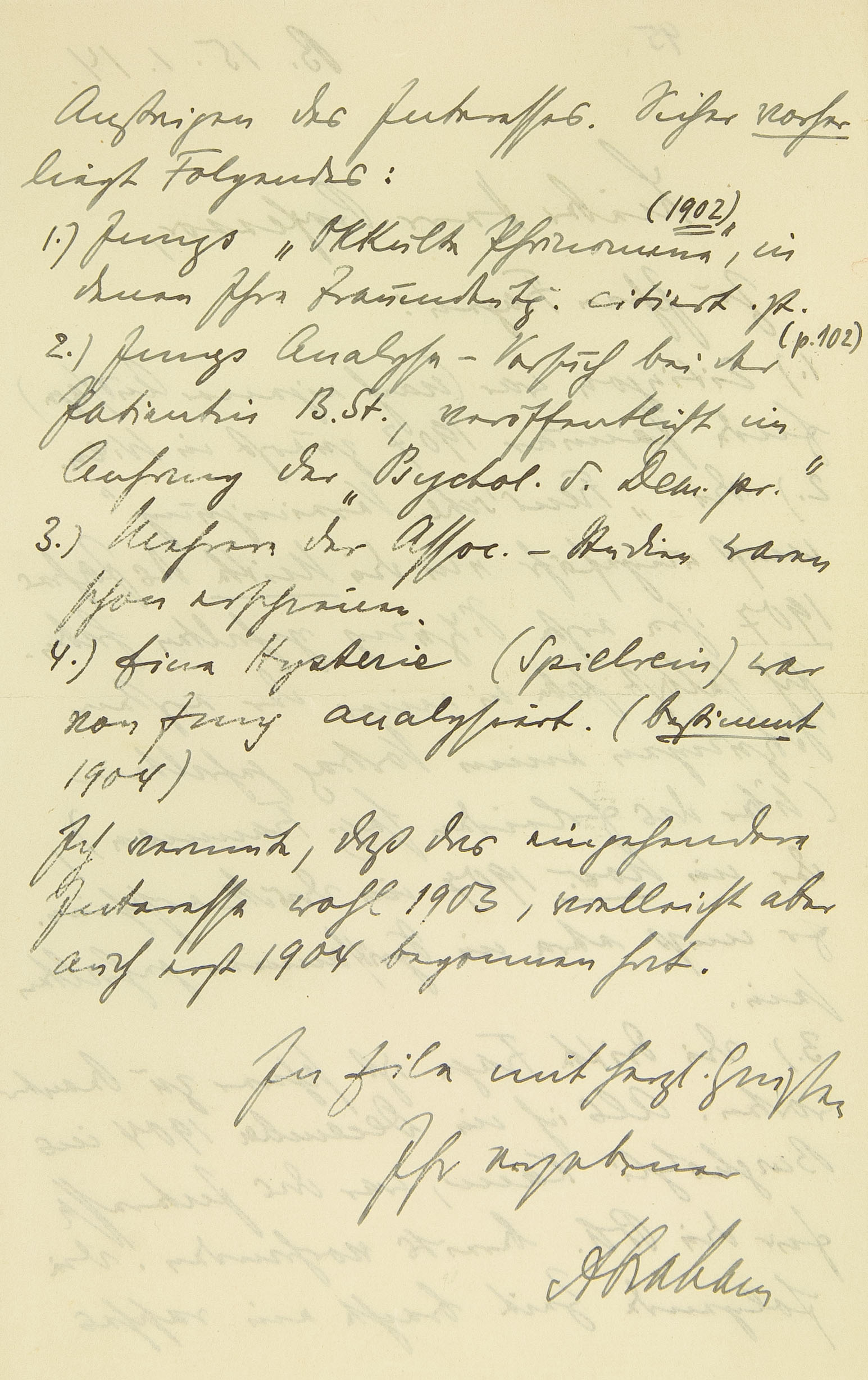 Ansteigen des Interesses. Sicher vorher liegt folgendes: 1.) Jungs »Okkulte Phänomene« (1902), in denen Ihre Traumdeutung zitiert ist. (p. 102) 2.Jungs Analyse-Versuch bei der Patientin B. St., veröffent- licht im Anhang der »Psychologie der Dementia praecox«. 3.) Mehrere der Assoziations-Studien waren schon erschienen. 4.) Eine Hysterie (Spielrein) war von Jung analysiert (be- stimmt 1904). Ich vermute, daß das eingehendere Interesse wohl 1903, vielleicht aber auch erst 1904 begonnen hat. In Eile mit herzlichen Grüßen Ihr ergebener Abraham