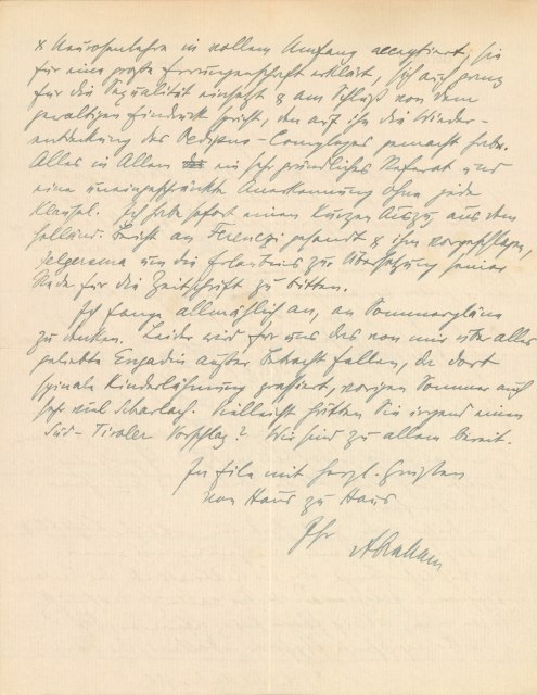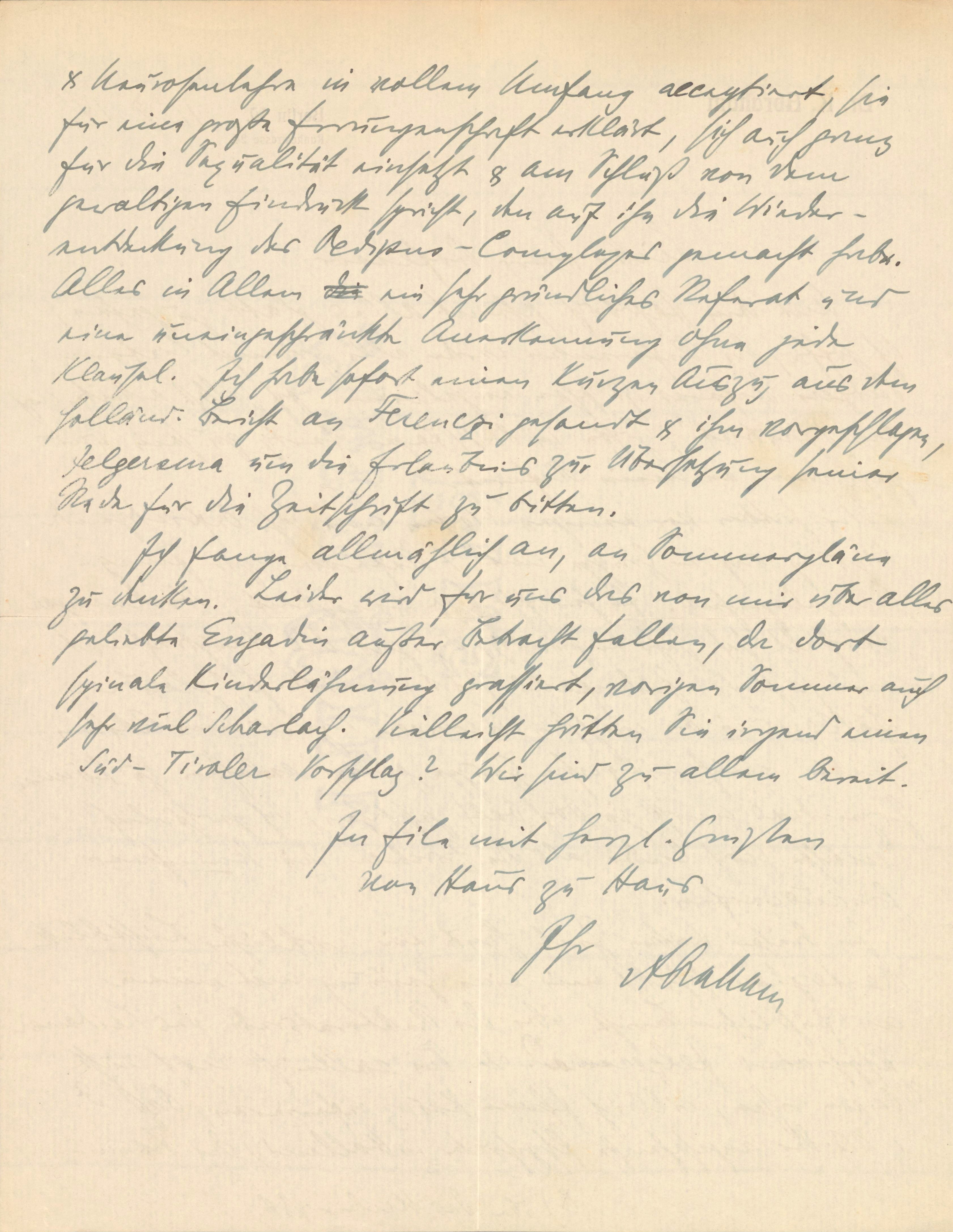 und Neurosenlehre in vollem Umfang akzeptiert, sie für eine große Errungenschaft erklärt, sich auch ganz für die Sexualität einsetzt und am Schluß von dem gewaltigen Eindruck spricht, den auf ihn die Wiederentdeckung des Ödipus-Komplexes gemacht habe. Alles in allem ein sehr gründliches Referat und eine uneingeschränkte Anerkennung ohne jede Klausel. Ich habe sofort einen kurzen Auszug aus dem holländischen Bericht an Ferenczi gesandt und ihm vorgeschlagen, Jelgersma um die Erlaubnis zur Übersetzung seiner Rede für die Zeitschrift zu bitten. Ich fange allmählich an, an Sommerpläne zu denken. Leider wird für uns das von mir über alles geliebte Engadin außer Betracht fallen, da dort spinale Kinderlähmung grassiert, vorigen Sommer auch sehr viel Scharlach. Vielleicht hätten Sie irgendei- nen Süd-Tiroler Vorschlag? Wir sind zu allem bereit. In Eile mit herzlichen Grüßen von Haus zu Haus Ihr Abraham