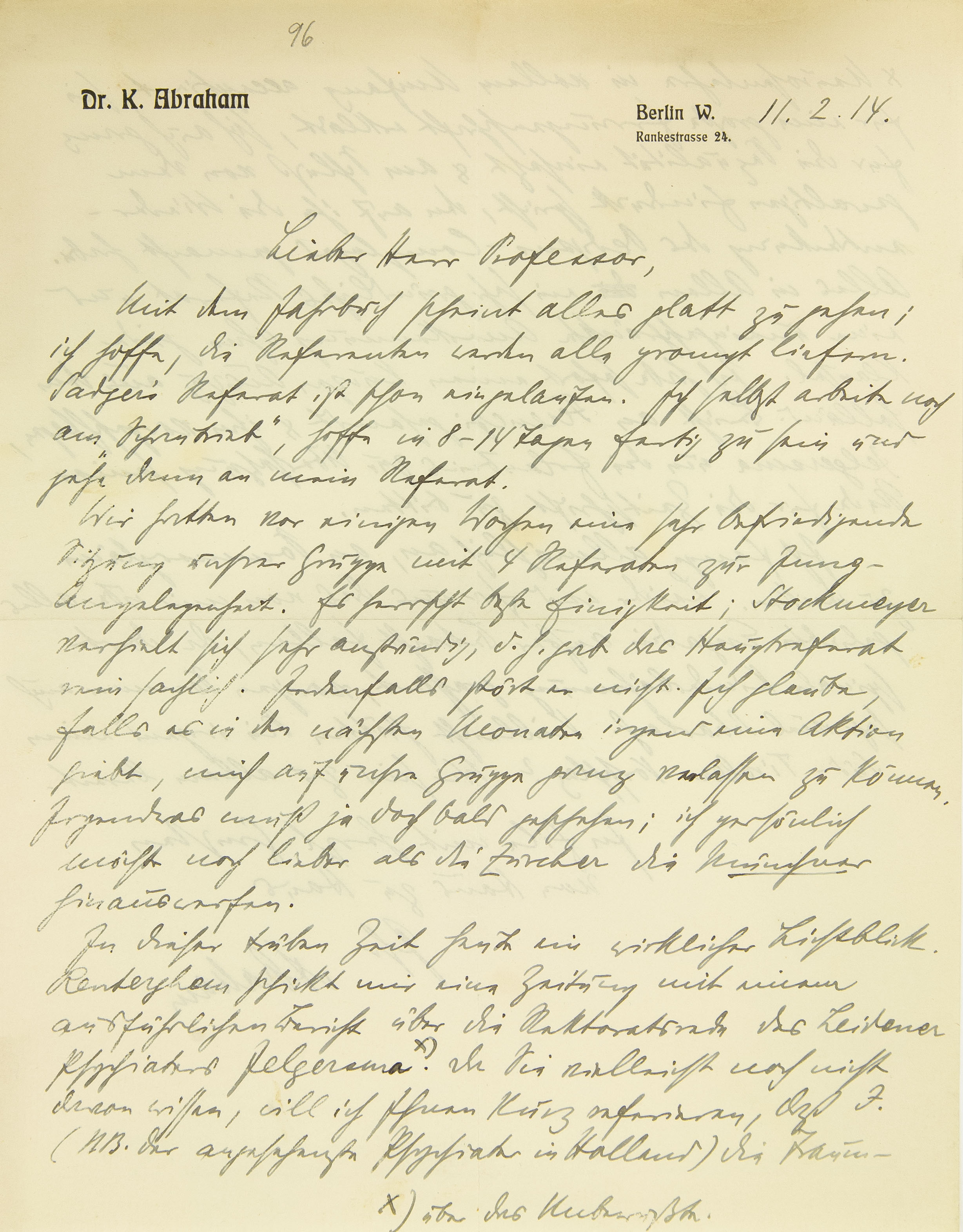 [Briefkopf III Berlin] 11. 2. 14. Lieber Herr Professor, Mit dem Jahrbuch scheint alles glatt zu gehen; ich hoffe, die Referenten werden alle prompt liefern. Sadgers Referat ist schon eingelaufen. Ich selbst arbeite noch am »Schautrieb«, hoffe in acht bis 14 Tagen fertig zu sein und gehe dann an mein Referat. Wir hatten vor einigen Wochen eine sehr befriedigende Sitzung unsrer Gruppe mit vier Referaten zur Jung-Angelegenheit. Es herrscht beste Einigkeit; Stockmayer verhielt sich sehr anständig, d.h. gab das Hauptreferat rein sachlich. Jedenfalls stört er nicht. Ich glaube, falls es in den nächsten Monaten irgendeine Aktion gibt, mich auf unsre Gruppe ganz verlassen zu können. Irgendwas muß ja doch bald geschehen; ich persönlich möchte noch lieber als die Zürcher die Münchner hinauswerfen. In dieser trüben Zeit heute ein wirklicher Lichtblick. Renterghem schickt mir eine Zeitung mit einem ausführlichen Bericht über die Rektoratsrede des Leidener Psychiaters Jelgersma. Da Sie vielleicht noch nicht davon wissen, will ich Ihnen kurz referieren, daß J. (NB. der angesehenste Psychiater in Holland) die Traum-