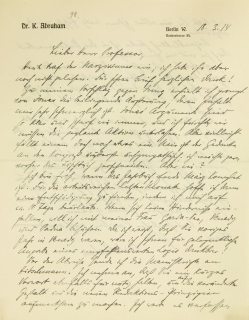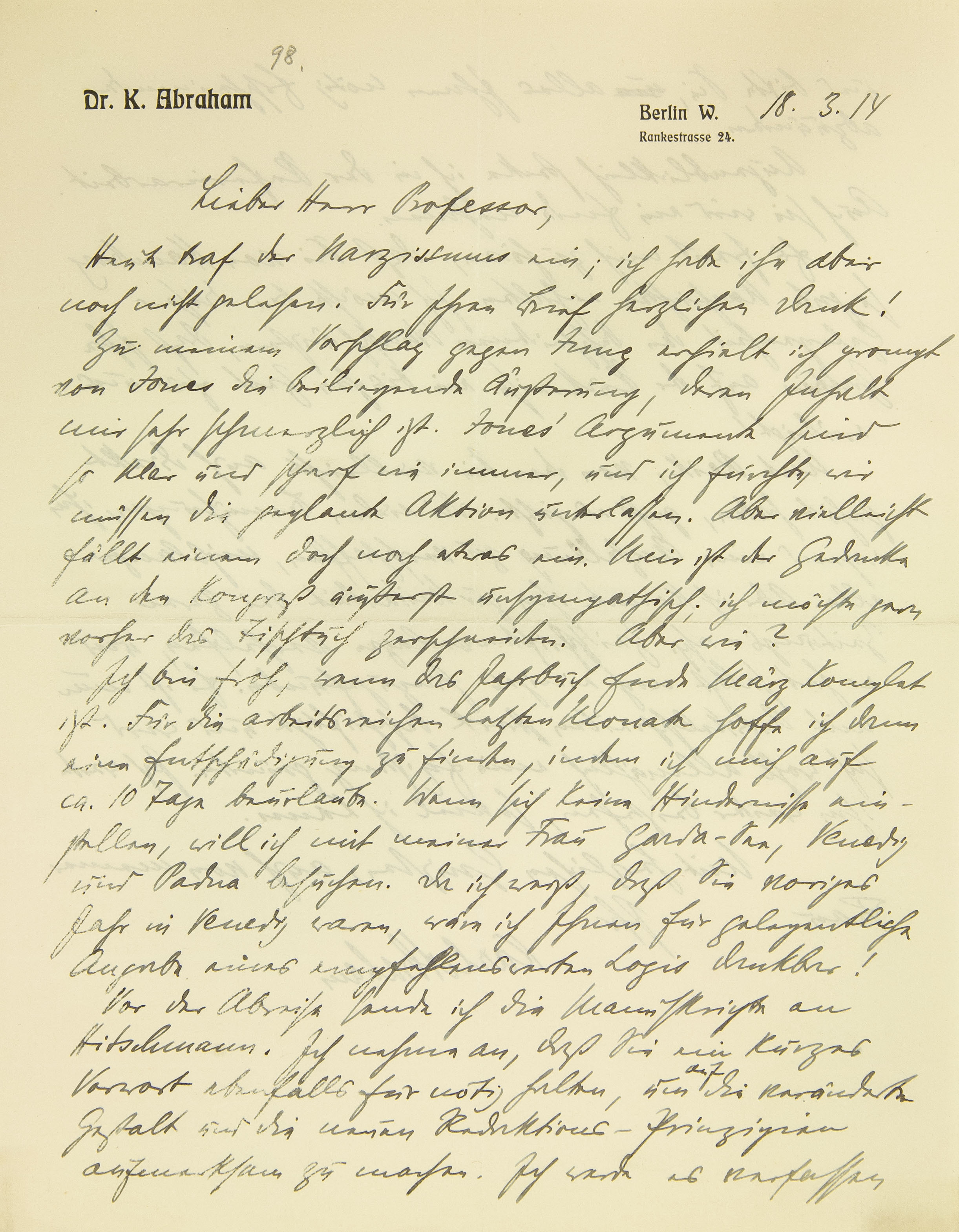 [Briefkopf III Berlin] 18. 3. 14 Lieber Herr Professor, Heute traf der Narzißmus ein; ich habe ihn aber noch nicht gelesen. Für Ihren Brief herzlichen Dank! Zu meinem Vorschlag gegen Jung erhielt ich prompt von Jones die beiliegende Äußerung, deren Inhalt mir sehr schmerzlich ist. Jones’ Argumente sind so klar und scharf wie immer, und ich fürchte, wir müssen die geplante Aktion unterlassen. Aber vielleicht fällt einem doch noch etwas ein. Mir ist der Gedanke an den Kongreß äußerst unsympathisch; ich möchte gern vorher das Tischtuch zerschneiden. Aber wie? Ich bin froh, wenn das Jahrbuch Ende März komplett ist. Für die arbeitsreichen letzten Monate hoffe ich dann eine Entschädigung zu finden, indem ich mich auf ca. zehn Tage beurlaube. Wenn sich keine Hindernisse einstellen, will ich mit meiner Frau Garda-See, Venedig und Padua besuchen. Da ich weiß, daß Sie voriges Jahr in Venedig waren, wäre ich Ihnen für gelegentliche Angabe eines empfehlenswerten Logis dankbar! Vor der Abreise sende ich die Manuskripte an Hitschmann. Ich nehme an, daß Sie ein kurzes Vorwort ebenfalls für nötig halten, um auf die veränderte Gestalt und die neuen Redaktions- Prinzipien aufmerksam zu machen. Ich werde es verfassen