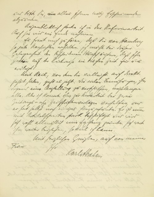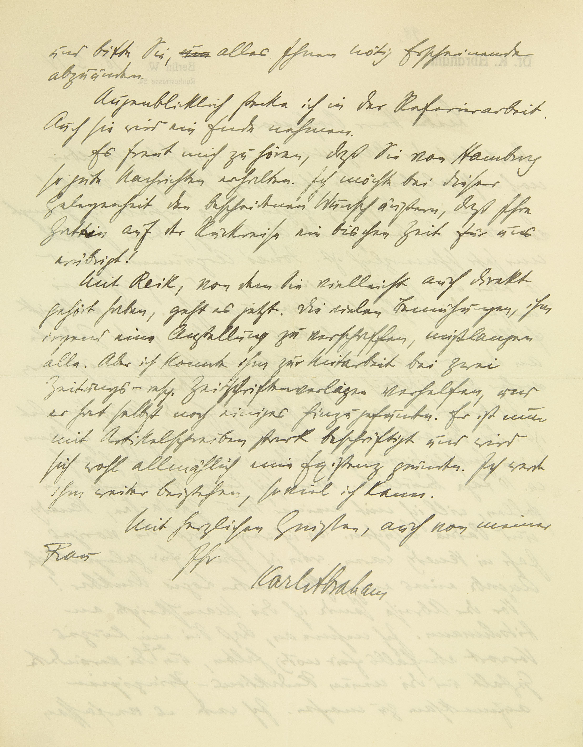 und bitte Sie, alles Ihnen nötig Erscheinende abzuändern. Augenblicklich stecke ich in der Referierarbeit. Auch sie wird ein Ende nehmen. Es freut mich zu hören, daß Sie von Hamburg so gute Nachrichten erhalten. Ich möchte bei dieser Gelegenheit den bescheidenen Wunsch äußern, daß Ihre Gattin auf der Rückreise ein bißchen Zeit für uns erübrigt! Mit Reik, von dem Sie vielleicht auch direkt gehört haben, geht es jetzt. Die vielen Bemühungen, ihm irgendeine Anstellung zu verschaffen, mißlangen alle. Aber ich konnte ihm zur Mitar- beit bei zwei Zeitungs- resp. Zeitschriftenverlagen verhelfen, und er hat selbst noch einiges hinzugefunden. Er ist nun mit Artikel- schreiben stark beschäftigt und wird sich wohl allmählich eine Existenz gründen. Ich werde ihm weiter beistehen, soviel ich kann. Mit herzlichen Grüßen, auch von meiner Frau Ihr Karl Abraham