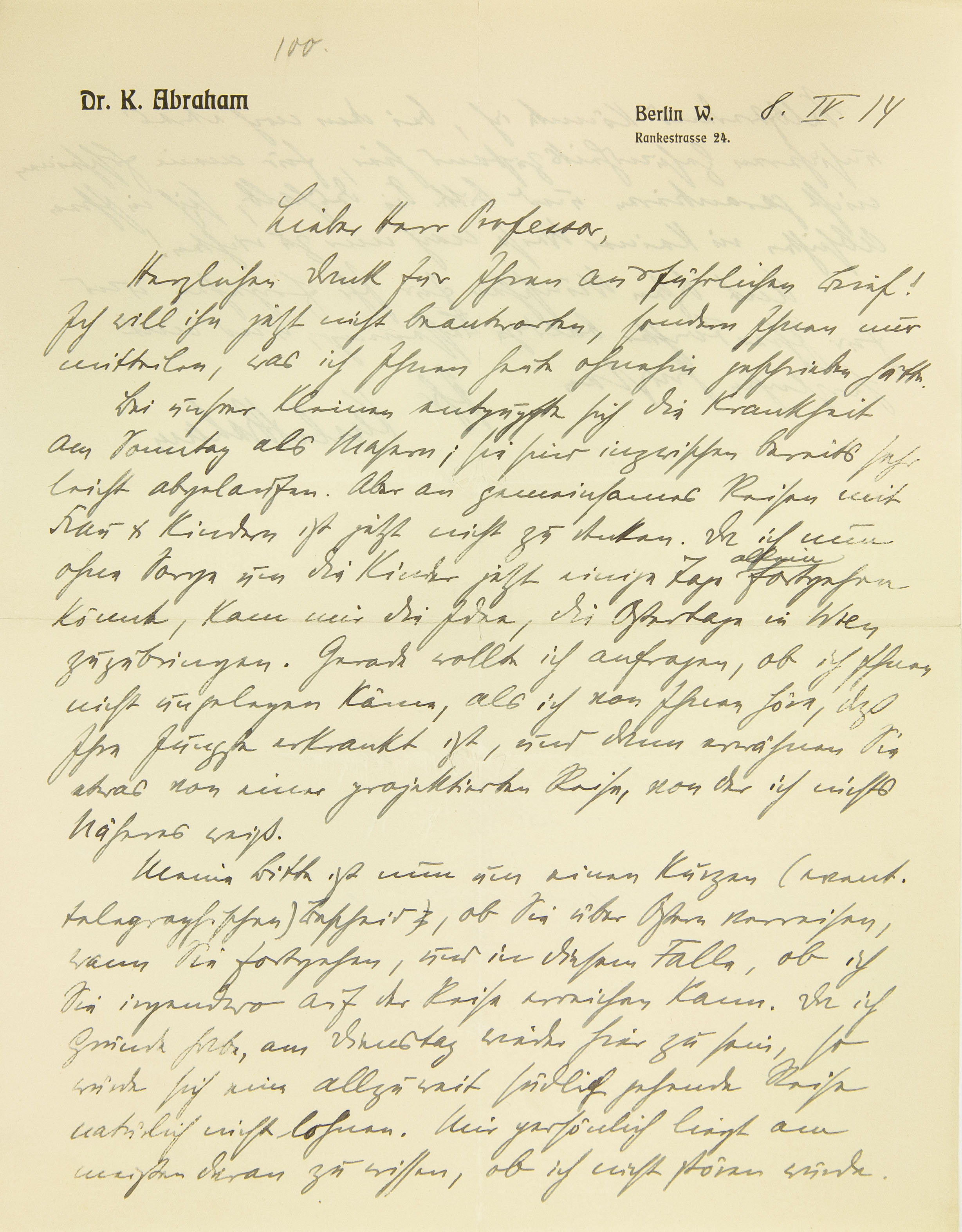 [Briefkopf III Berlin] 8. IV. 14 Lieber Herr Professor, Herzlichen Dank für Ihren ausführlichen Brief! Ich will ihn jetzt nicht beantworten, sondern Ihnen nur mitteilen, was ich Ihnen heute ohnehin geschrieben hätte. Bei unsrer Kleinen entpuppte sich die Krankheit am Sonntag als Masern; sie sind inzwischen bereits sehr leicht abgelaufen. Aber an gemeinsames Reisen mit Frau und Kindern ist jetzt nicht zu denken. Da ich nun ohne Sorgen um die Kinder jetzt einige Tage allein fortgehen könnte, kam mir die Idee, die Ostertage in Wien zuzubringen. Gerade wollte ich anfragen, ob ich Ihnen nicht ungelegen käme, als ich von Ihnen höre, daß Ihre Jüngste erkrankt ist, und dann erwähnen Sie etwas von einer projektierten Reise, von der ich nichts Näheres weiß. Meine Bitte ist nun um einen kurzen (eventuell telegraphischen) Bescheid, ob Sie über Ostern verreisen, wann Sie fortgehen, und in diesem Falle, ob ich Sie irgendwo auf der Reise errei- chen kann. Da ich Gründe habe, am Dienstag wieder hier zu sein, so würde sich eine allzuweit südlich gehende Reise natürlich nicht lohnen. Mir persönlich liegt am meisten daran zu wissen, ob ich nicht stören würde.