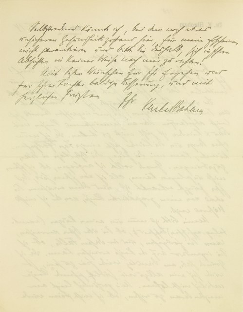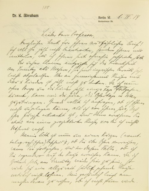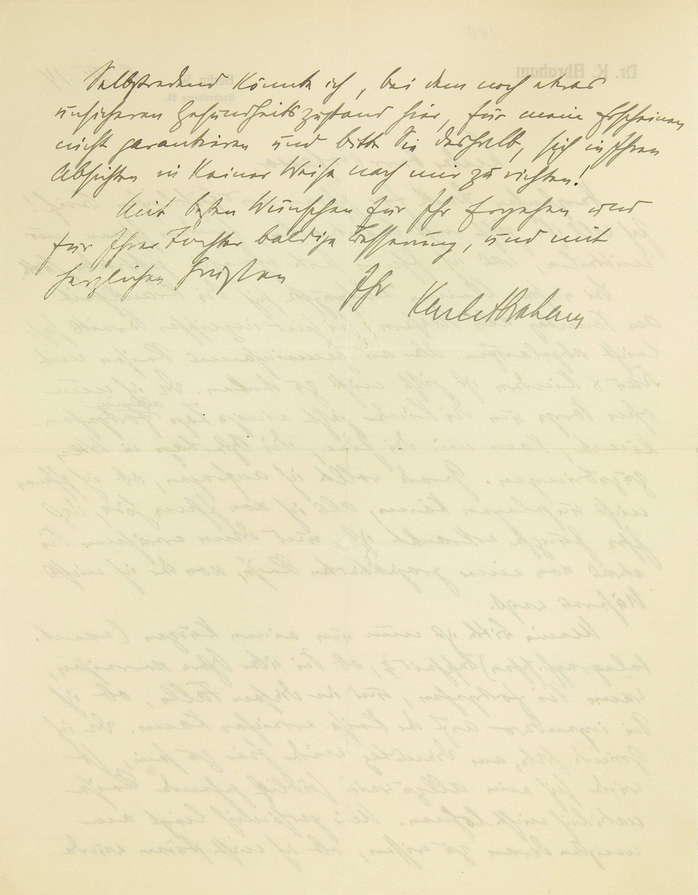 Selbstredend könnte ich, bei dem noch etwas unsicheren Gesundheitszustand hier, für mein Erscheinen nicht garantieren und bitte Sie deshalb, sich in Ihren Absichten in keiner Weise nach mir zu richten! Mit besten Wünschen für Ihr Ergehen und für Ihrer Tochter baldige Besserung, und mit herzlichen Grüßen Ihr Karl Abraham
