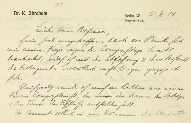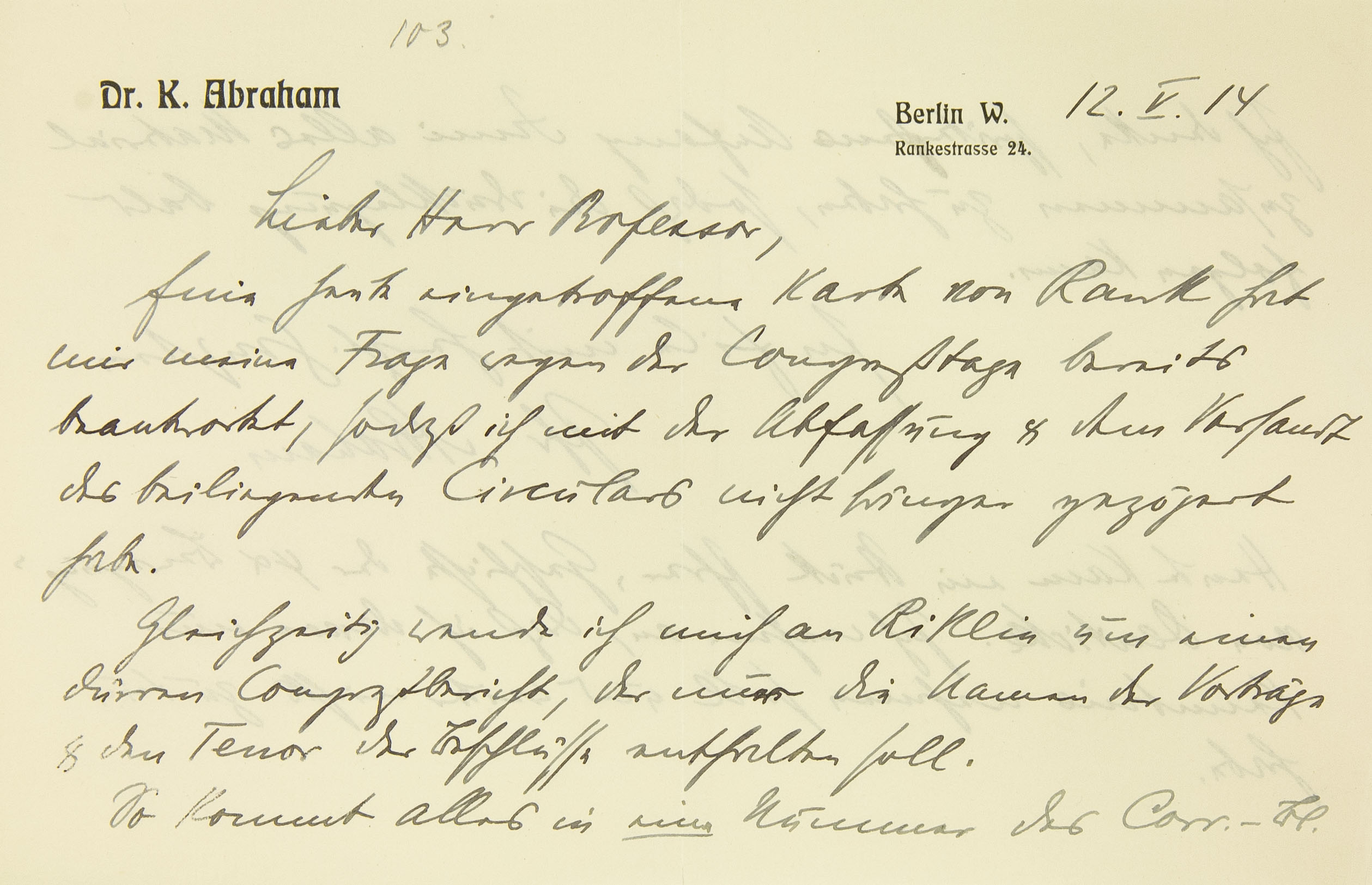 [Briefkopf III Berlin] 12. V. 14 Lieber Herr Professor, Eine heute eingetroffene Karte von Rank hat meine Frage wegen der Kongreßtage bereits beantwortet, sodaß ich mit der Abfassung und dem Versand des beiliegenden Zirkulars nicht länger gezögert habe. Gleichzeitig wende ich mich an Riklin um einen dürren Kongreßbericht, der nur die Namen der Vorträge und den Tenor der Beschlüsse enthalten soll. So kommt alles in eine Nummer des Korrespondenz-Blatts.