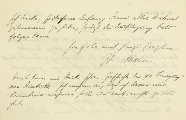 Ich denke, spätestens Anfang Juni alles Material zusammen zu haben, sodaß die Drucklegung bald folgen kann. In Eile mit herzlichen Grüßen Ihr Abraham Heute kam ein Stück Ihrer »Geschichte der psychoanalytischen Bewegung« von Deuticke. Ich nahm an, daß ich davon nur Kenntnis nehmen soll und weiter nichts zu tun habe.