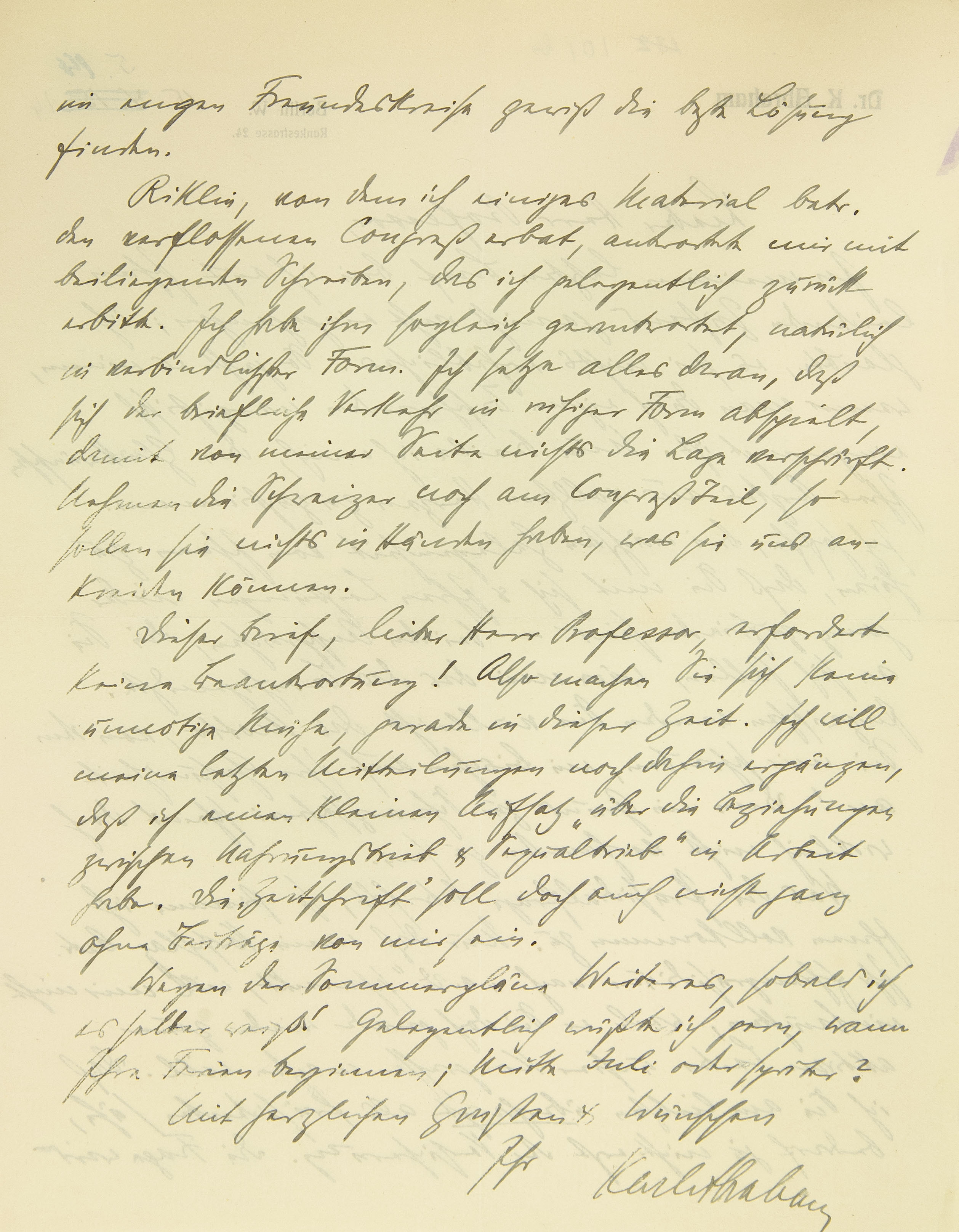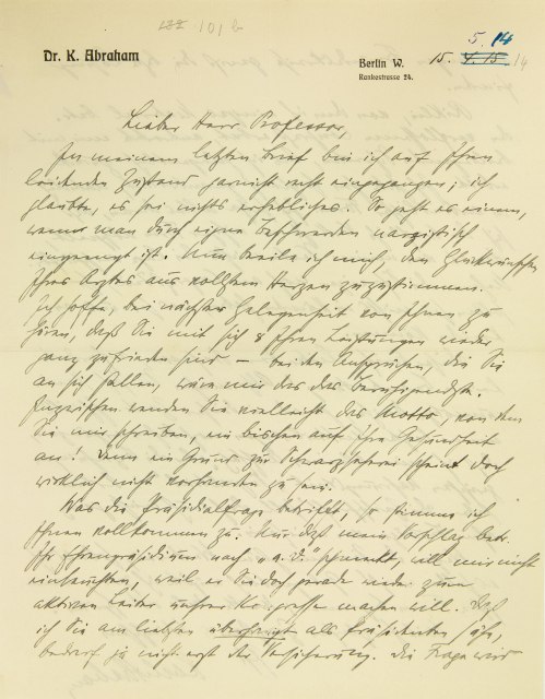 [Briefkopf III Berlin] 15. 5. 14 Lieber Herr Professor, In meinem letzten Brief bin ich auf Ihren leidenden Zustand gar nicht recht eingegangen; ich glaubte, es sei nichts Erhebliches. So geht es einem, wenn man durch eigne Beschwerden narzißtisch eingeengt ist. Nun beeile ich mich, den Glückwünschen Ihres Arztes aus vollstem Herzen zuzustimmen. Ich hoffe, bei nächster Gelegenheit von Ihnen zu hören, daß Sie mit sich und Ihren Leistungen wieder ganz zufrieden sind – bei den Ansprüchen, die Sie an sich stellen, wäre mir das das Beruhigendste. Inzwischen wenden Sie vielleicht das Motto, von dem Sie mir schreiben, ein bißchen auf Ihre Gesundheit an! Denn ein Grund zur Schwarzseherei scheint doch wirklich nicht vorhanden zu sein. Was die Präsidialfrage betrifft, so stimme ich Ihnen vollkommen zu. Nur daß mein Vorschlag betr. Ihr Ehrenpräsidium nach »a.D.« schmeckt, will mir nicht einleuchten, weil er Sie doch gerade wieder zum aktiven Leiter unsrer Kongresse machen will. Daß ich Sie am liebsten überhaupt als Präsidenten sähe, bedarf ja nicht erst der Versicherung. Die Frage wird
