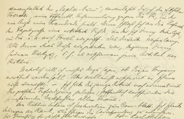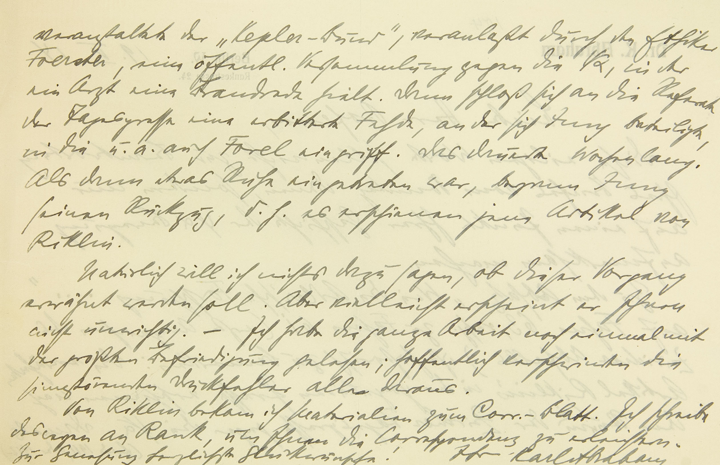 veranstaltete der »Kepler-Bund«, veranlaßt durch den Ethiker Foerster, eine öffentliche Versammlung gegen die Psychoanalyse, in der ein Arzt eine Brandrede hielt. Dann schloß sich an die Re- ferate der Tagespresse eine erbitterte Fehde, an der sich Jung beteiligte, in die u.a. auch Forel eingriff. Das dauerte wochenlang. Als dann etwas Ruhe eingetreten war, begann Jung seinen Rückzug, d.h. es erschienen jene Artikel von Riklin. Natürlich will ich nichts dazu sagen, ob dieser Vorgang erwähnt werden soll. Aber vielleicht erscheint er Ihnen nicht unwichtig. – Ich habe die ganze Arbeit noch einmal mit der größten Befriedigung gelesen; hoffentlich verschwinden die sinnstörenden Druckfehler alle daraus. Von Riklin bekam ich Materialien zum Korrespondenz-Blatt. Ich schreibe deswegen an Rank, um Ihnen die Korrespondenz zu erleichtern. Zur Genesung herzlichste Glückwünsche! Ihr Karl Abraham