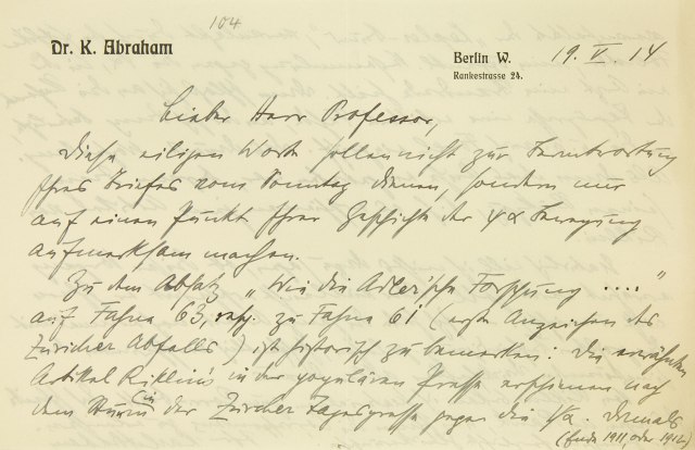 [Briefkopf III Berlin] 19. V. 14 Lieber Herr Professor, Diese eiligen Worte wollen nicht zur Beantwortung Ihres Briefes vom Sonntag dienen, sondern nur auf einen Punkt Ihrer Geschichte der psychoanalytischen Bewegung aufmerksam machen. Zu dem Absatz »Wie die Adlersche Forschung ....« auf Fahne 63. resp. zu Fahne 61 (erste Anzeichen des Züricher Abfalls) ist historisch zu bemerken: Die erwähnten Artikel Riklins in der po- pulären Presse erschienen nach dem Sturm in der Zürcher Tagespresse gegen die Psychoanalyse. Damals (Ende 1911, oder 1912)