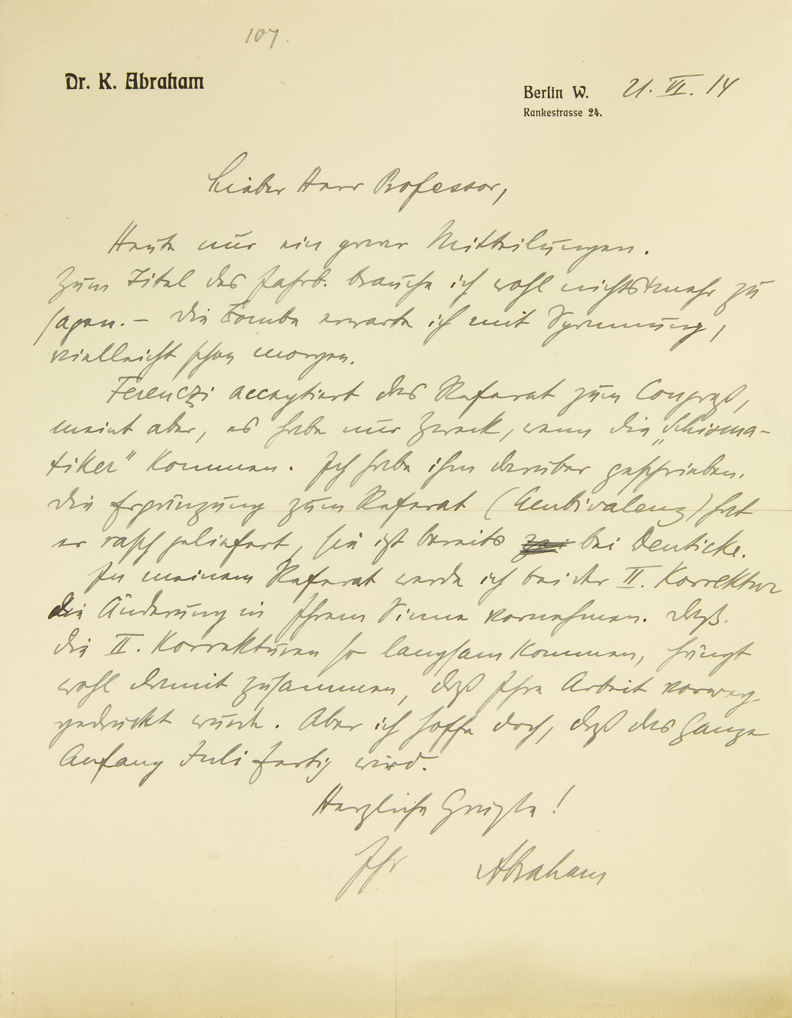 Ferenczi akzeptiert das Referat zum Kongreß, meint aber, es habe nur Zweck, wenn die »Schismatiker« kommen. Ich habe ihm darüber geschrieben. Die Ergänzung zum Referat (Ambiva- lenz) hat er rasch geliefert, sie ist bereits bei Deuticke.
