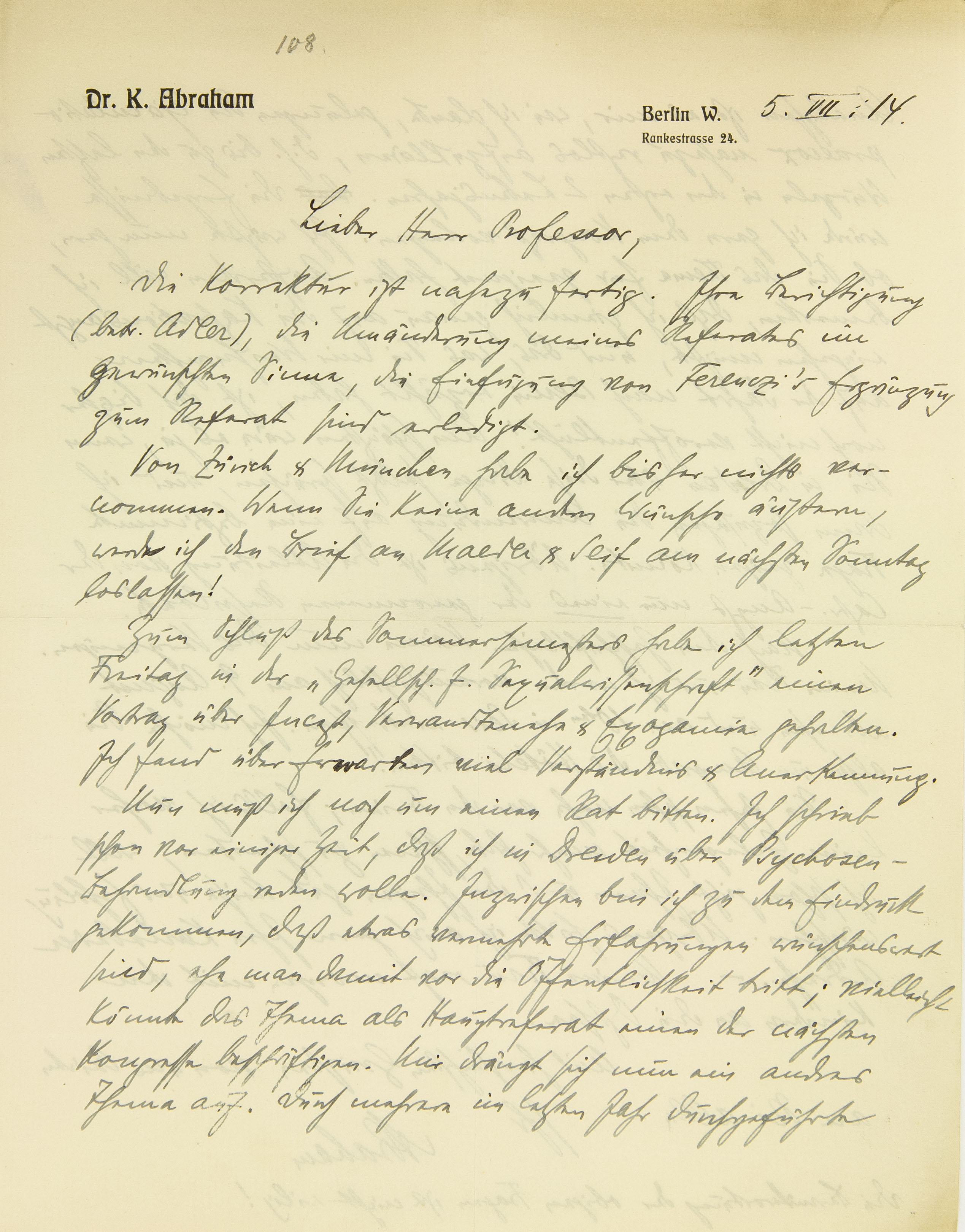 [Briefkopf III Berlin] 5. VII. 14. Lieber Herr Professor, Die Korrektur ist nahezu fertig. Ihre Berichtigung (betr. Adler), die Umänderung meines Referates im gewünschten Sinne, die Einfügung von Ferenczis Ergänzung zum Referat sind erle- digt. Von Zürich und München habe ich bisher nichts vernommen. Wenn Sie keine andern Wünsche äußern, werde ich den Brief an Maeder und Seif am nächsten Sonntag loslassen! Zum Schluß des Sommersemesters habe ich letzten Freitag in der »Gesellschaft für Sexualwissenschaft« einen Vortrag über Inzest, Verwandtenehe und Exogamie gehalten. Ich fand über Erwarten viel Verständnis und Anerkennung. Nun muß ich noch um einen Rat bitten. Ich schrieb schon vor einiger Zeit, daß ich in Dresden über Psychosen-Behandlung reden wolle. Inzwischen bin ich zu dem Eindruck gekommen, daß etwas vermehrte Erfahrungen wünschenswert sind, ehe man damit vor die Öffentlichkeit tritt; vielleicht könnte das Thema als Hauptreferat einen der nächsten Kongresse beschäftigen. Mir drängt sich nun ein andres Thema auf. Durch mehrere im letzten Jahr durchgeführte