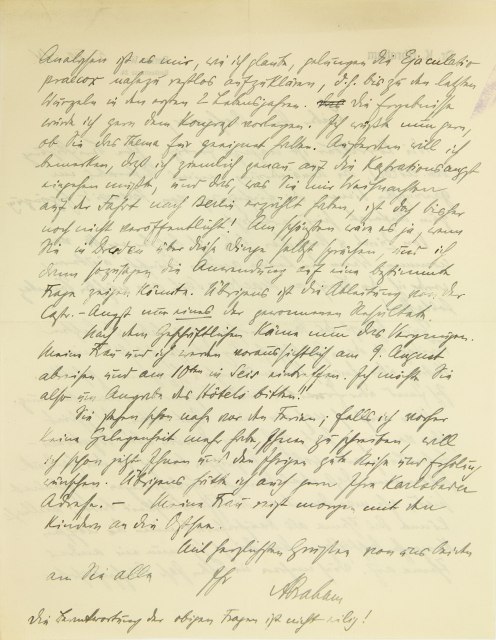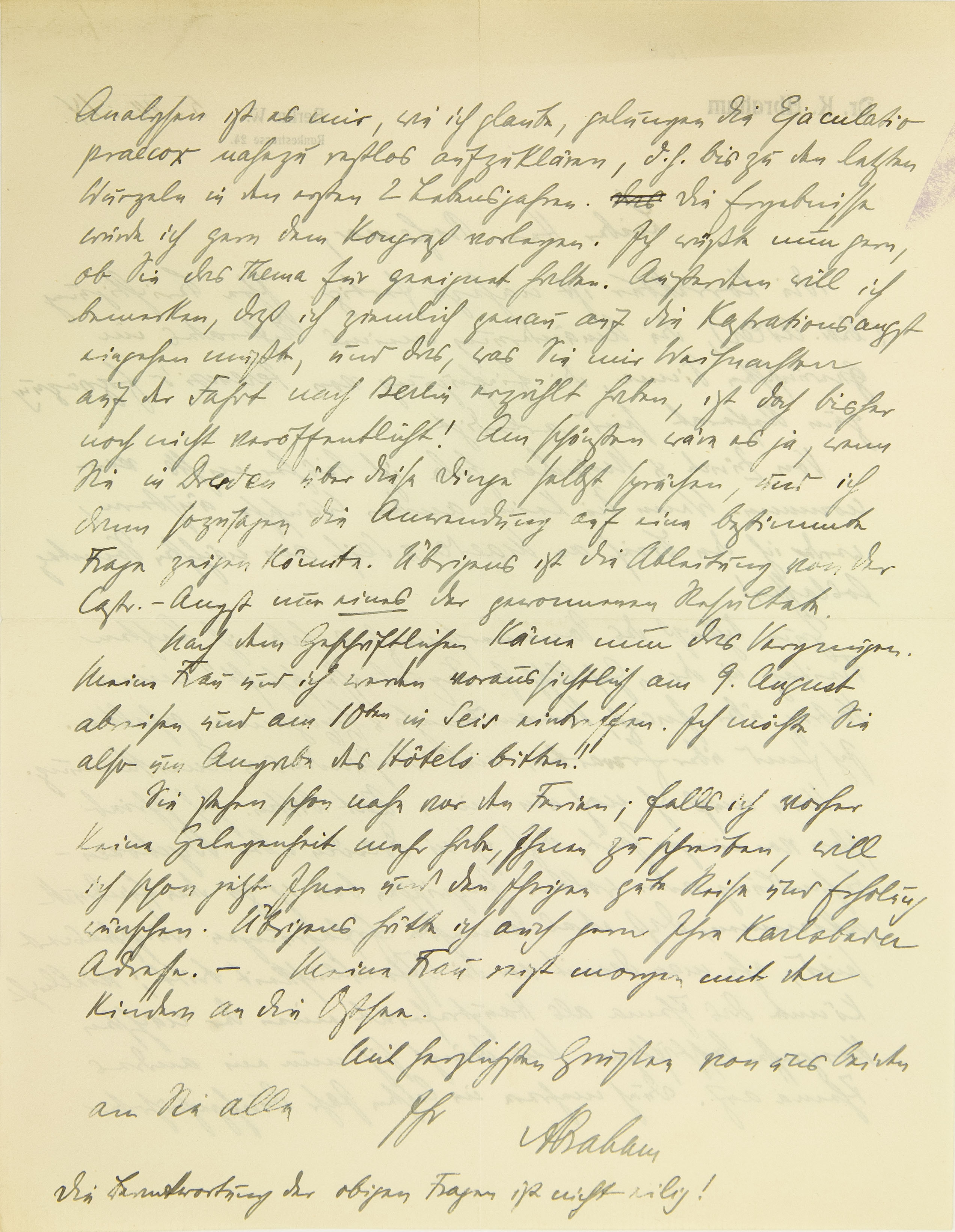 Analysen ist es mir, wie ich glaube, gelungen, die Ejaculatio praecox nahezu restlos aufzuklären, d.h. bis zu den letzten Wurzeln in den ersten zwei Lebensjahren. Die Ergebnisse würde ich gern dem Kongreß vorlegen. Ich wüßte nun gern, ob Sie das Thema für geeignet halten. Außerdem will ich bemerken, daß ich ziemlich genau auf die Kastrationsangst eingehen müßte, und das, was Sie mir Weihnachten auf der Fahrt nach Berlin erzählt haben, ist doch bisher noch nicht veröffentlicht! Am schönsten wäre es ja, wenn Sie in Dresden über diese Dinge selbst sprächen, und ich dann sozusagen die Anwendung auf eine bestimmte Frage zeigen könnte. Übrigens ist die Ableitung von der Kastrationsangst nur eines der gewonnenen Resultate. Nach dem Geschäftlichen käme nun das Vergnügen. Meine Frau und ich werden voraussichtlich am 9. August abreisen und am 10. in Seis eintreffen. Ich möchte Sie also um Angabe des Hotels bitten! Sie stehen schon nahe vor den Ferien; falls ich vorher keine Gelegenheit mehr habe, Ihnen zu schreiben, will ich schon jetzt Ihnen und den Ihrigen gute Reise und Erholung wünschen. Übrigens hätte ich auch gern Ihre Karlsbader Adresse. – Meine Frau reist morgen mit den Kindern an die Ostsee. Mit herzlichsten Grüßen von uns beiden an Sie alle Ihr Abraham Die Beantwortung der obigen Fragen ist nicht eilig!
