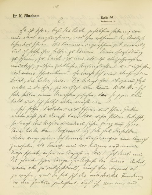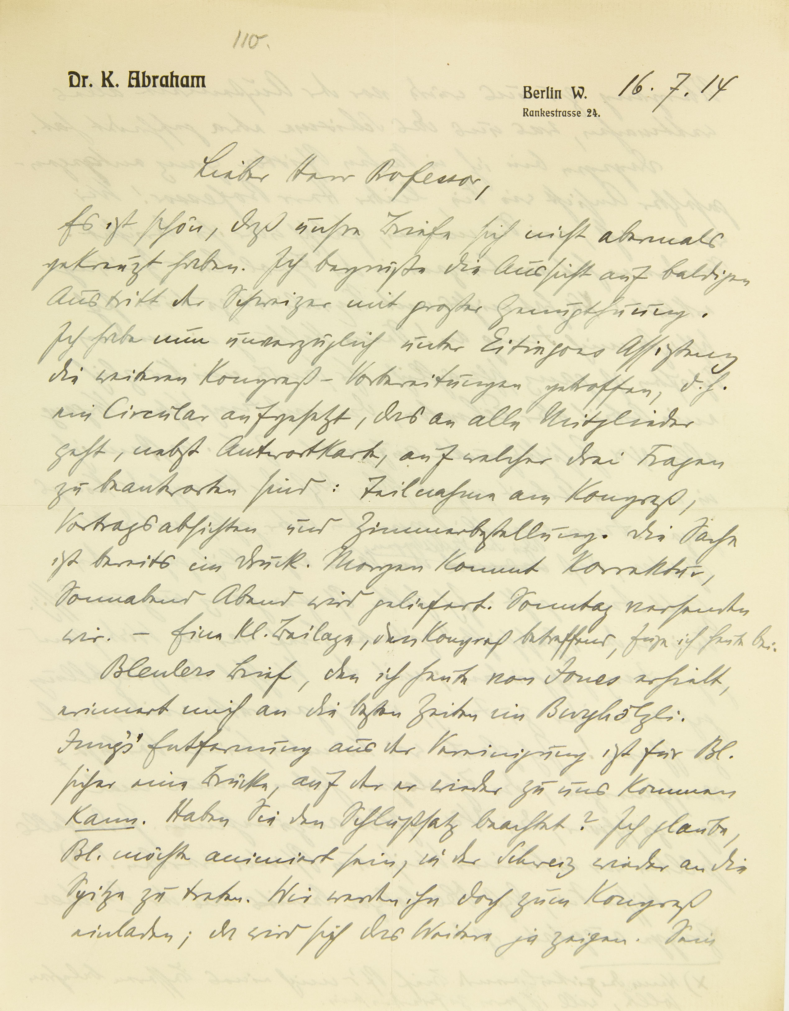 [Briefkopf III Berlin] 16. 7. 14 Lieber Herr Professor, Es ist schön, daß unsre Briefe sich nicht abermals gekreuzt haben. Ich begrüße die Aussicht auf baldigen Austritt der Schweizer mit großer Genugtuung. Ich habe nun unverzüglich unter Eitingons Assistenz die weiteren Kongreß-Vorbereitungen getroffen, d.h. ein Zirkular aufgesetzt, das an alle Mitglieder geht, nebst Antwortkarte, auf welcher drei Fragen zu beantworten sind: Teilnahme am Kongreß, Vortragsabsichten und Zimmerbestellung. Die Sache ist bereits im Druck. Morgen kommt Korrektur, Sonnabend Abend wird geliefert. Sonntag versenden wir. – Eine kleine Beilage, den Kongreß betreffend, füge ich heute bei. Bleulers Brief, den ich heute von Jones erhielt, erinnert mich an die besten Zeiten im Burghölzli. Jungs Entfernung aus der Vereinigung ist für Bl. sicher eine Brücke, auf der er wieder zu uns kommen kann. Haben Sie den Schlußsatz beachtet? Ich glaube, Bl. möchte animiert sein, in der Schweiz wieder an die Spitze zu treten. Wir werden ihn doch zum Kongreß einladen; da wird sich das weitere ja zeigen. Sein