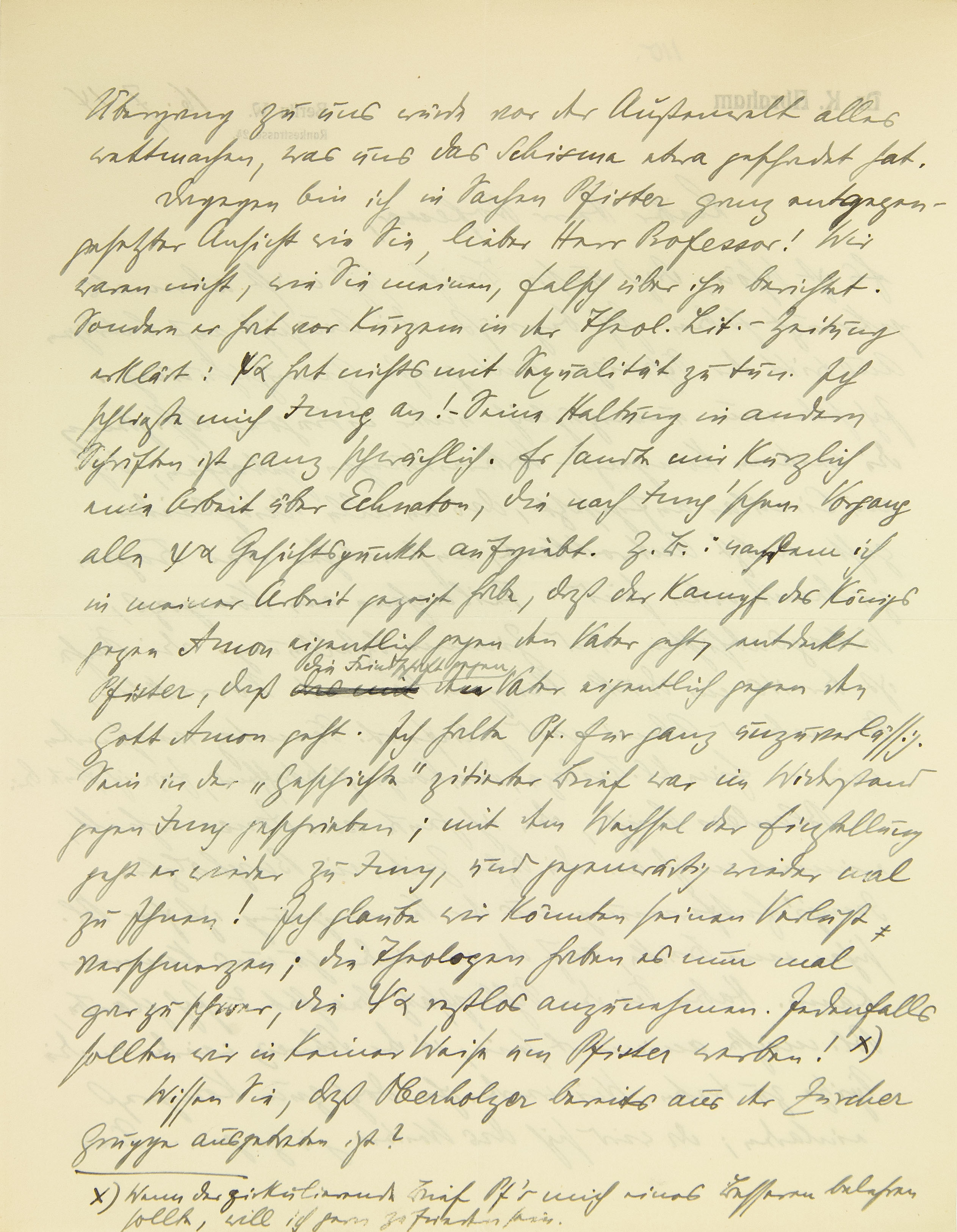 Übergang an uns würde vor der Außenwelt alles wettmachen, was uns das Schisma etwa geschadet hat. Dagegen bin ich in Sachen Pfister ganz entgegengesetzter Ansicht wie Sie, lieber Herr Professor! Wir waren nicht, wie Sie meinen, falsch über ihn berichtet. Sondern er hat vor kurzem in der Theologischen Literatur-Zeitung erklärt: Psychoanalyse hat nichts mit Sexualität zu tun. Ich schließe mich Jung an! – Seine Haltung in andern Schriften ist ganz schwächlich. Er sandte mir kürzlich eine Arbeit über Echnaton, die nach Jungschem Vorgang alle psychoanalytischen Gesichtspunkte aufgibt. Z.B.: nachdem ich in meiner Arbeit gezeigt habe, daß der Kampf des Königs gegen Amon eigentlich gegen den Vater geht, entdeckt Pfister, daß die Feindschaft gegen den Vater eigentlich gegen den Gott Amon geht. Ich halte Pf. für ganz unzuverlässig. Sein in der »Geschichte« zitierter Brief war im Widerstand gegen Jung geschrieben; mit dem Wechsel der Einstellung geht er wieder zu Jung, und gegenwärtig wieder mal zu Ihnen! Ich glaube wir könnten seinen Verlust verschmerzen; die Theologen haben es nun mal gar zu schwer, die Psychoanalyse restlos anzunehmen. Jedenfalls sollten wir in keiner Weise um Pfister werben!*) Wissen Sie, daß Oberholzer bereits aus der Zürcher Gruppe ausgetreten ist?