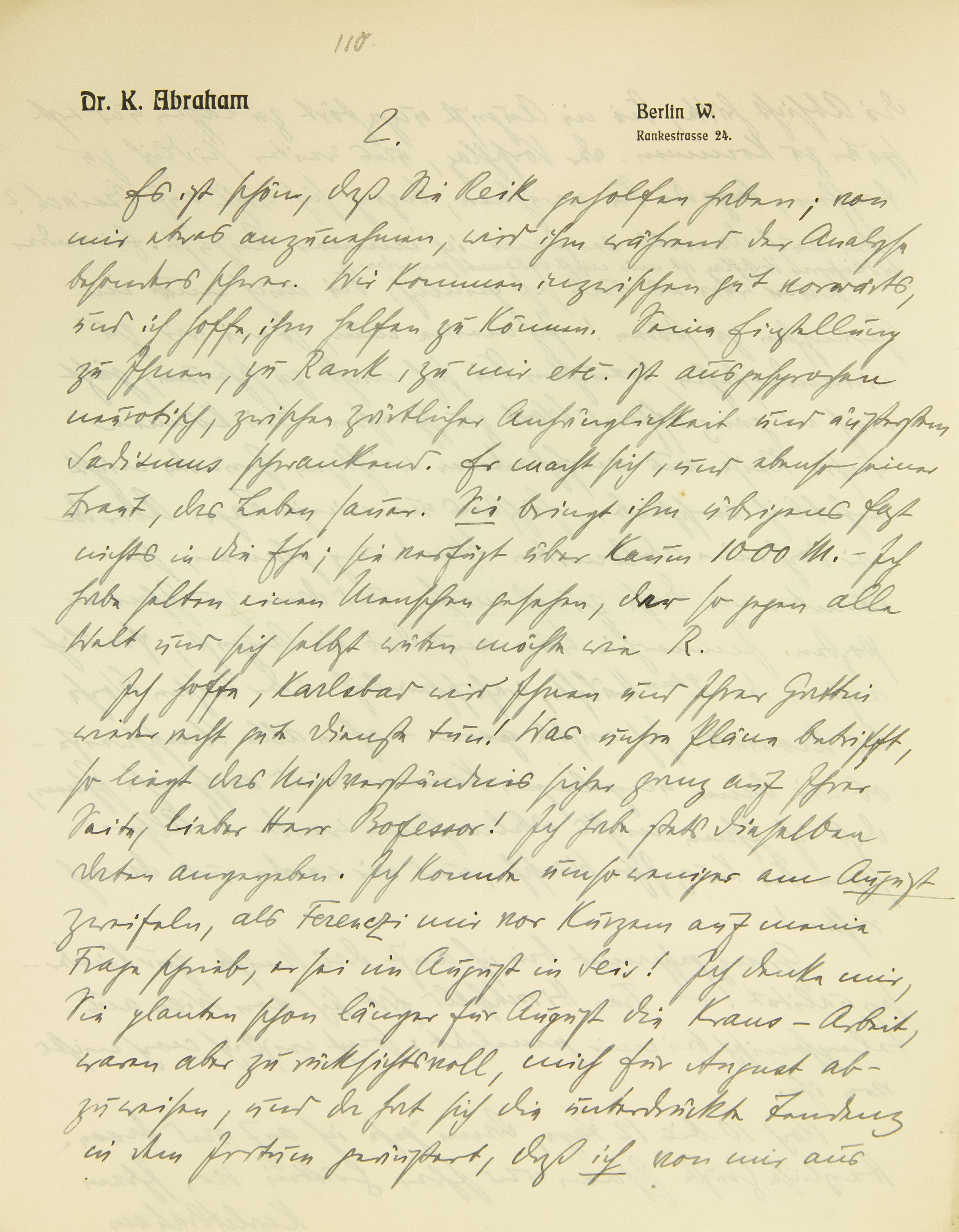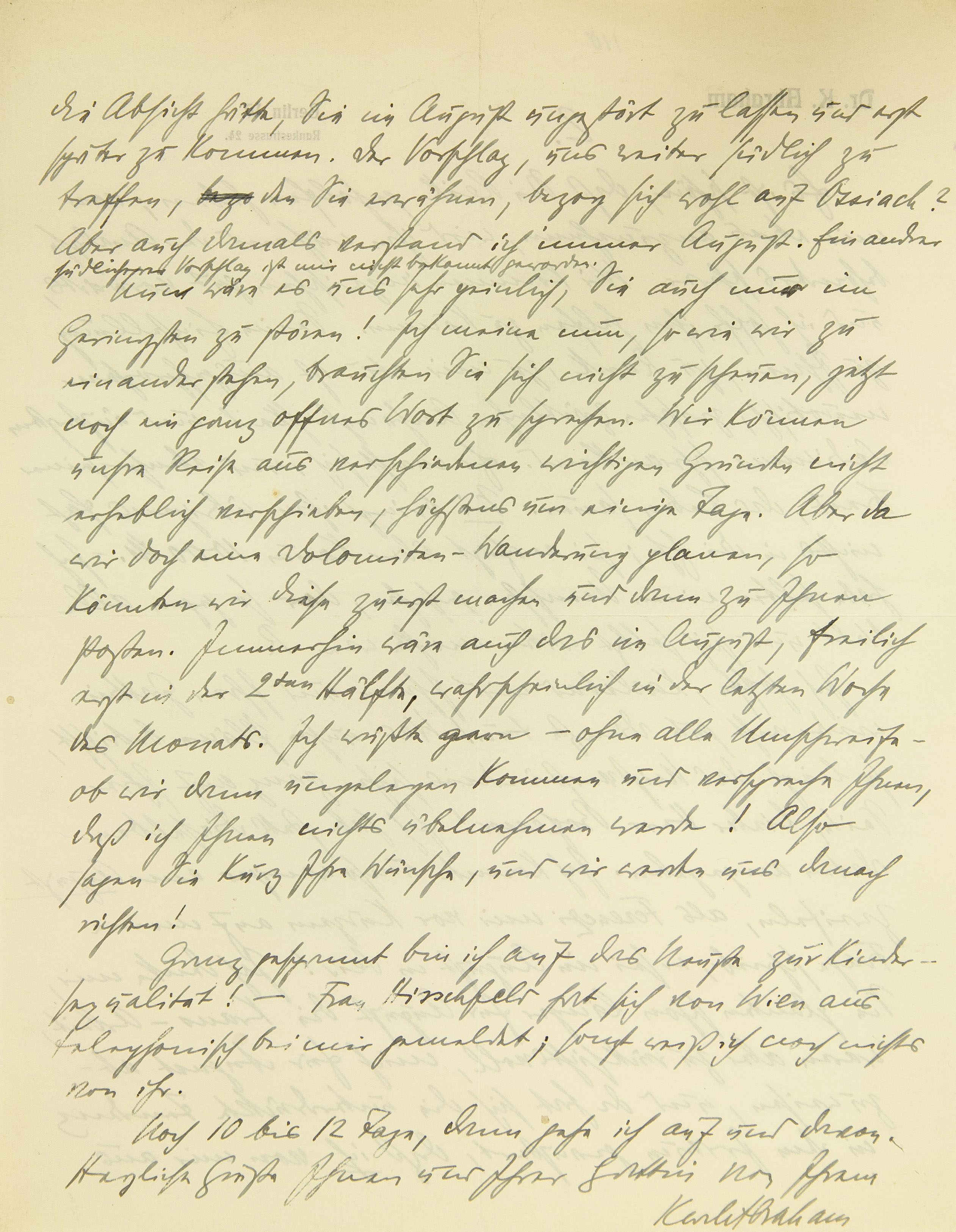 die Absicht hätte, Sie im August ungestört zu lassen und erst später zu kommen. Der Vorschlag, uns weiter südlich zu treffen, den Sie erwähnen, bezog sich wohl auf Ossiach? Aber auch damals verstand ich immer August. Ein andrer südlicherer Vorschlag ist mir nicht bekannt geworden. Nun wäre es uns sehr peinlich, Sie auch nur im geringsten zu stören! Ich meine nun, so wie wir zueinander stehen, brauchten Sie sich nicht zu scheuen, jetzt noch ein ganz offenes Wort zu sprechen. Wir können unsre Reise aus verschiedenen wichtigen Gründen nicht erheblich verschieben, höchstens um einige Tage. Aber da wir doch eine Dolomiten-Wanderung planen, so könnten wir diese zuerst machen und dann zu Ihnen stoßen. Immerhin wäre auch das im August, freilich erst in der 2. Hälfte, wahrscheinlich in der letzten Woche des Monats. Ich wüßte gern – ohne alle Umschweife –, ob wir dann ungelegen kommen und verspreche Ihnen, daß ich Ihnen nichts übelnehmen werde! Also sagen Sie kurz Ihre Wünsche, und wir werden uns danach richten! Ganz gespannt bin ich auf das Neuste zur Kindersexualität! – Frau Hirschfeld hat sich von Wien aus telephonisch bei mir gemeldet; sonst weiß ich noch nichts von ihr. Noch zehn bis zwölf Tage, dann gehe ich auf und davon. Herzliche Grüße Ihnen und Ihrer Gattin von Ihrem Karl Abraham