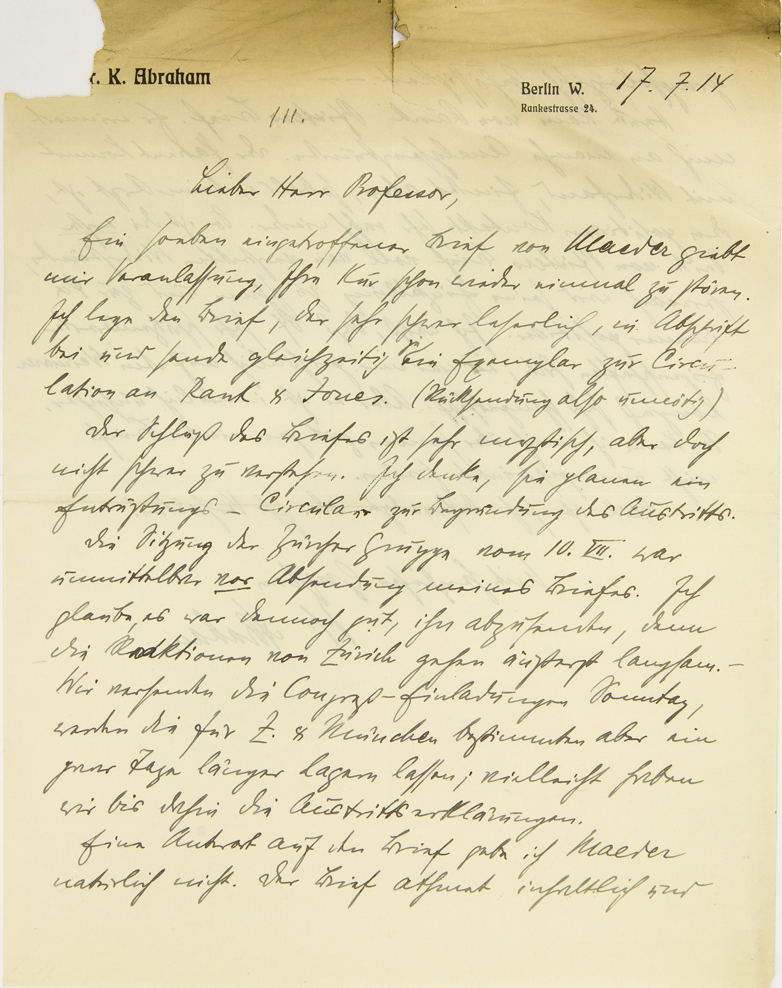 [Briefkopf III Berlin] 17. 7. 14 Lieber Herr Professor, Ein soeben eingetroffener Brief von Maeder gibt mir Veranlassung, Ihre Kur schon wieder einmal zu stören. Ich lege den Brief, der sehr schwer leserlich, in Abschrift bei und sende gleich- zeitig je ein Exemplar zur Zirkulation an Rank und Jones. (Rücksendung also unnötig.) Der Schluß des Briefes ist sehr mystisch, aber doch nicht schwer zu verstehen. Ich denke, sie planen ein Entrüstungs-Zirkular zur Begründung des Austritts. Die Sitzung der Zürcher Gruppe vom 10. VII. war unmittelbar vor Absendung meines Briefes. Ich glaube, es war dennoch gut, ihn abzusenden, denn die Reaktionen von Zürich gehen äußerst langsam. – Wir versenden die Kongreß-Einladungen Sonntag, werden die für Z.[ürich] und München bestimmten aber ein paar Tage länger lagern lassen; vielleicht haben wir bis dahin die Austrittserklärungen. Eine Antwort auf den Brief gebe ich Maeder natürlich nicht. Der Brief atmet inhaltlich und