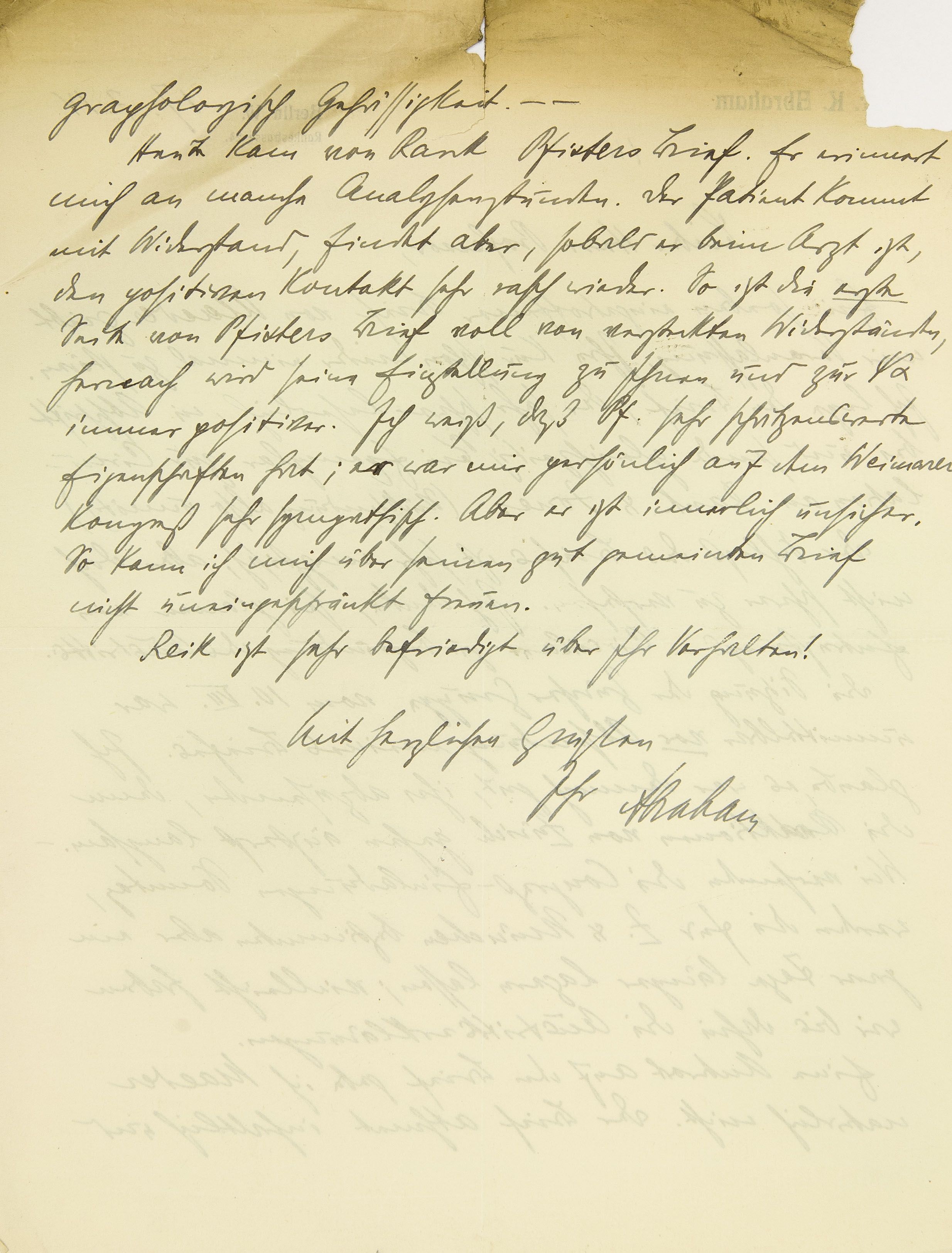 graphologisch Gehässigkeit. – – Heute kam von Rank Pfisters Brief. Er erinnert mich an manche Analysenstunden. Der Patient kommt mit Widerstand, findet aber, sobald er beim Arzt ist, den positiven Kontakt sehr rasch wieder. So ist die erste Seite von Pfisters Brief voll von versteckten Widerständen, hernach wird seine Einstellung zu Ihnen und zur Psychoanalyse immer positiver. Ich weiß, daß Pf. sehr schätzenswerte Eigenschaften hat; er war mir persönlich auf dem Weimarer Kongreß sehr sympathisch. Aber er ist innerlich unsicher. So kann ich mich über seinen gut gemeinten Brief nicht uneingeschränkt freuen. Reik ist sehr befriedigt über Ihr Verhalten! Mit herzlichen Grüßen Ihr Abraham