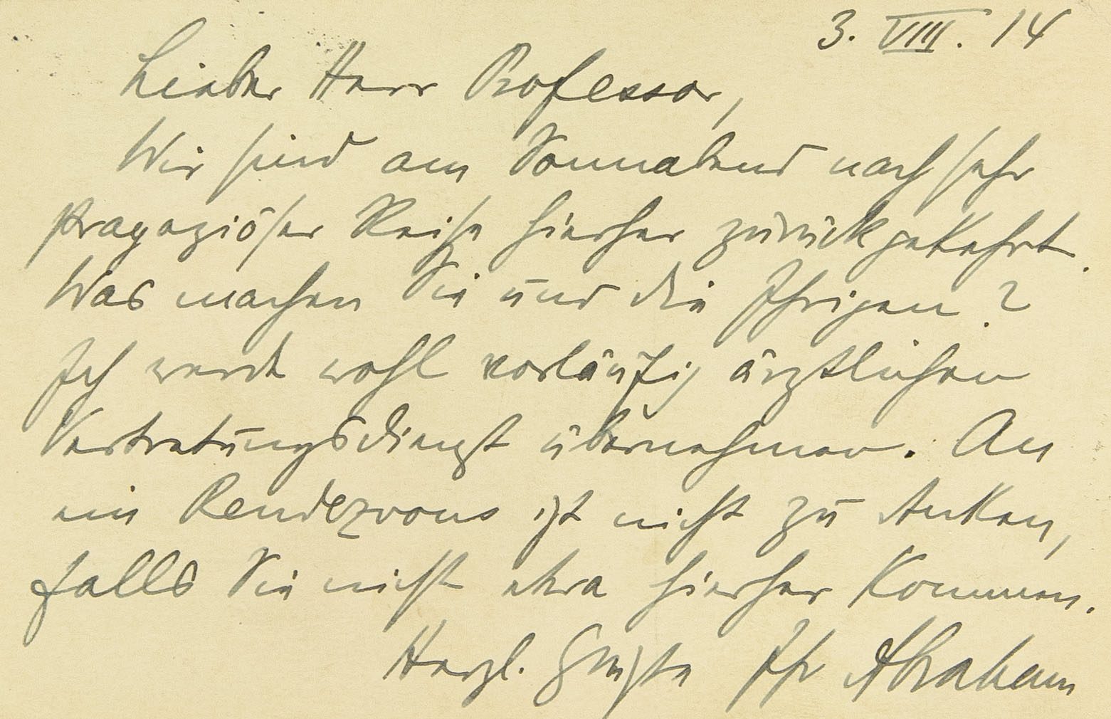 Wir sind am Sonnabend nach sehr strapaziöser Reise hierher zurückgekehrt. Was machen Sie und die Ihrigen? Ich werde wohl vorläufig ärztlichen Vertretungsdienst übernehmen. An ein Rendezvous ist nicht zu denken, falls Sie nicht etwa hierher kommen. Herzlich Grüße