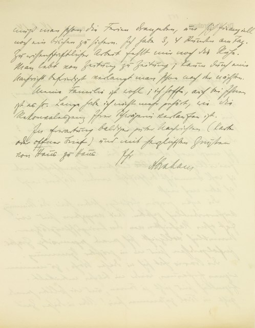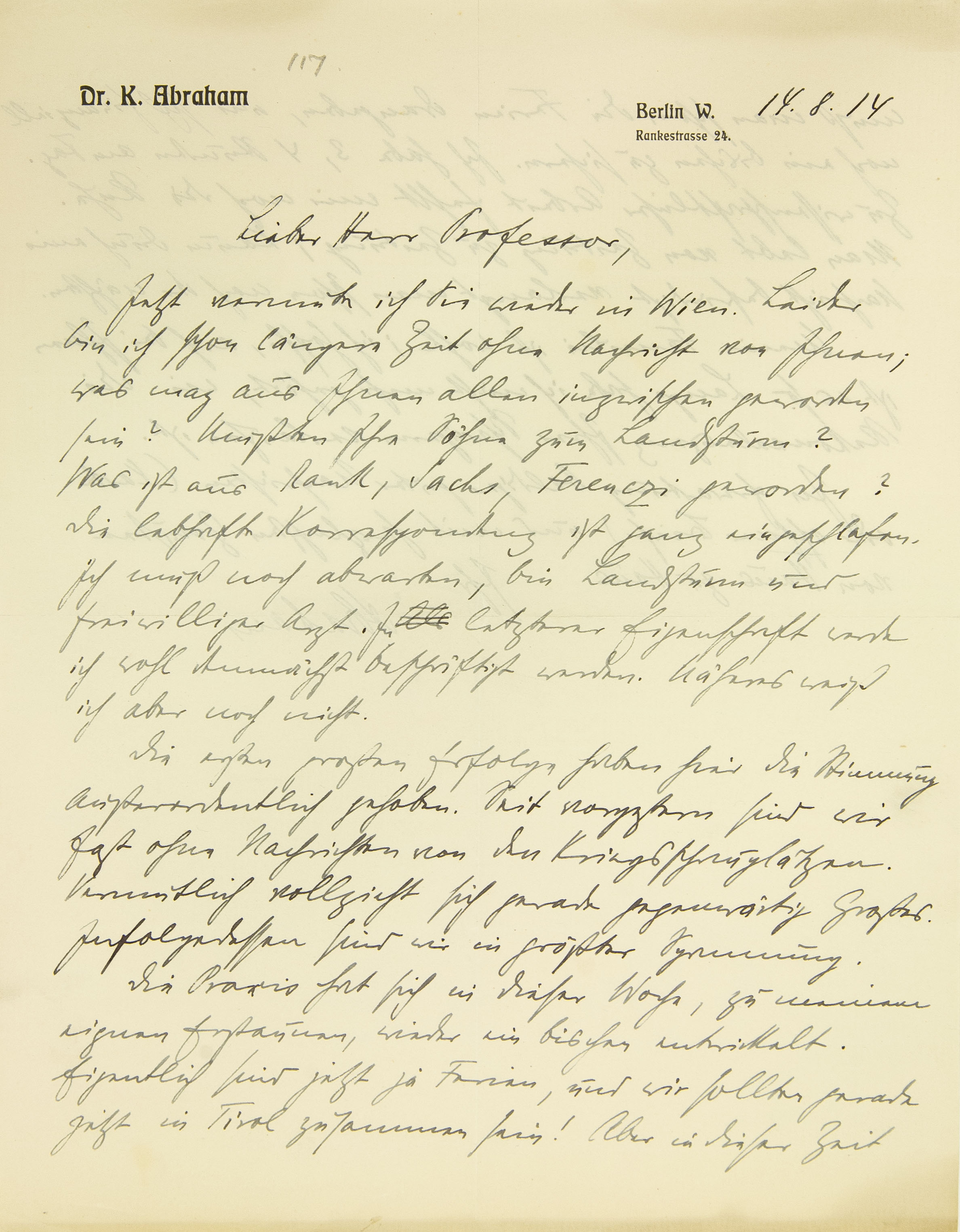 [Briefkopf III Berlin] 14. 8. 14 Lieber Herr Professor, Jetzt vermute ich Sie wieder in Wien. Leider bin ich schon längere Zeit ohne Nachricht von Ihnen; was mag aus Ihnen allen inzwischen geworden sein? Mußten Ihre Söhne zum Landsturm? Was ist aus Rank, Sachs, Ferenczi geworden? Die lebhafte Korrespondenz ist ganz eingeschlafen. Ich muß noch abwarten, bin Landsturm und freiwilliger Arzt. In letzterer Eigenschaft werde ich wohl demnächst beschäftigt werden. Näheres weiß ich aber noch nicht. Die ersten großen Erfolge haben hier die Stimmung außerordentlich gehoben. Seit vorgestern sind wir fast ohne Nachrichten von den Kriegsschauplätzen. Vermutlich vollzieht sich gerade gegenwärtig Großes. Infolgedessen sind wir in größter Spannung. Die Praxis hat sich in dieser Woche, zu meinem eignen Erstaunen, wieder ein bißchen entwickelt. Eigentlich sind jetzt ja Fe- rien, und wir sollten gerade jetzt in Tirol zusammen sein! Aber in dieser Zeit