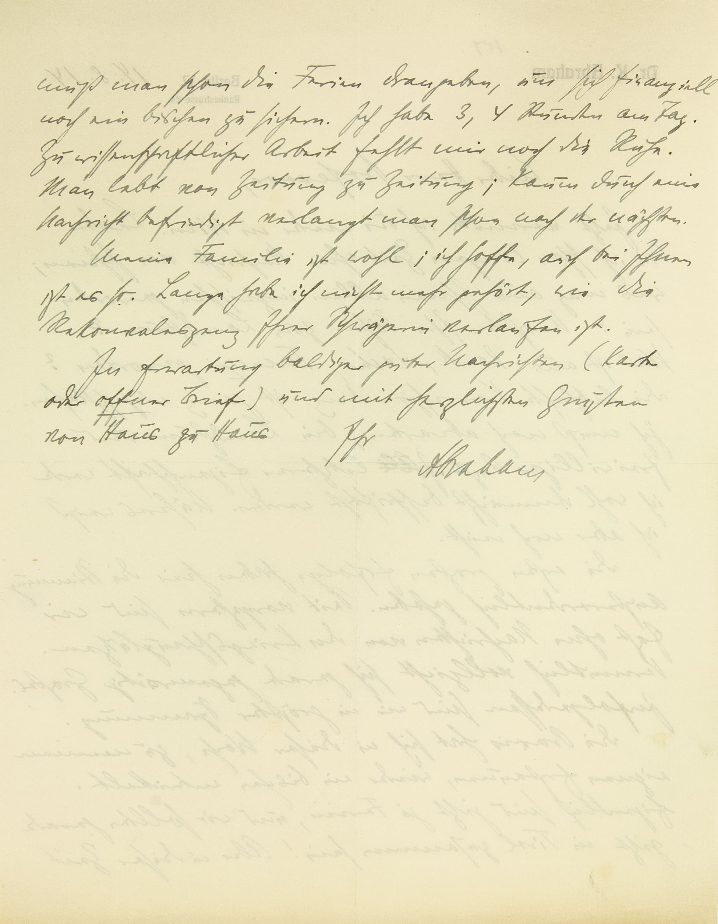 muß man schon die Ferien drangeben, um sich finanziell noch ein bißchen zu sichern. Ich habe drei, vier Stunden am Tag. Zu wissenschaftlicher Arbeit fehlt noch die Ruhe. Man lebt von Zeitung zu Zeitung; kaum durch eine Nachricht befriedigt verlangt man schon nach der nächsten. Meine Familie ist wohl; ich hoffe, auch bei Ihnen ist es so. Lange habe ich nicht mehr gehört, wie die Rekonvaleszenz Ihrer Schwägerin verlaufen ist. In Erwartung baldiger guter Nachrichten (Karte oder offener Brief) und mit herzlichsten Grüßen von Haus zu Haus Ihr Abraham