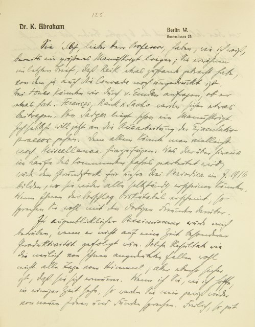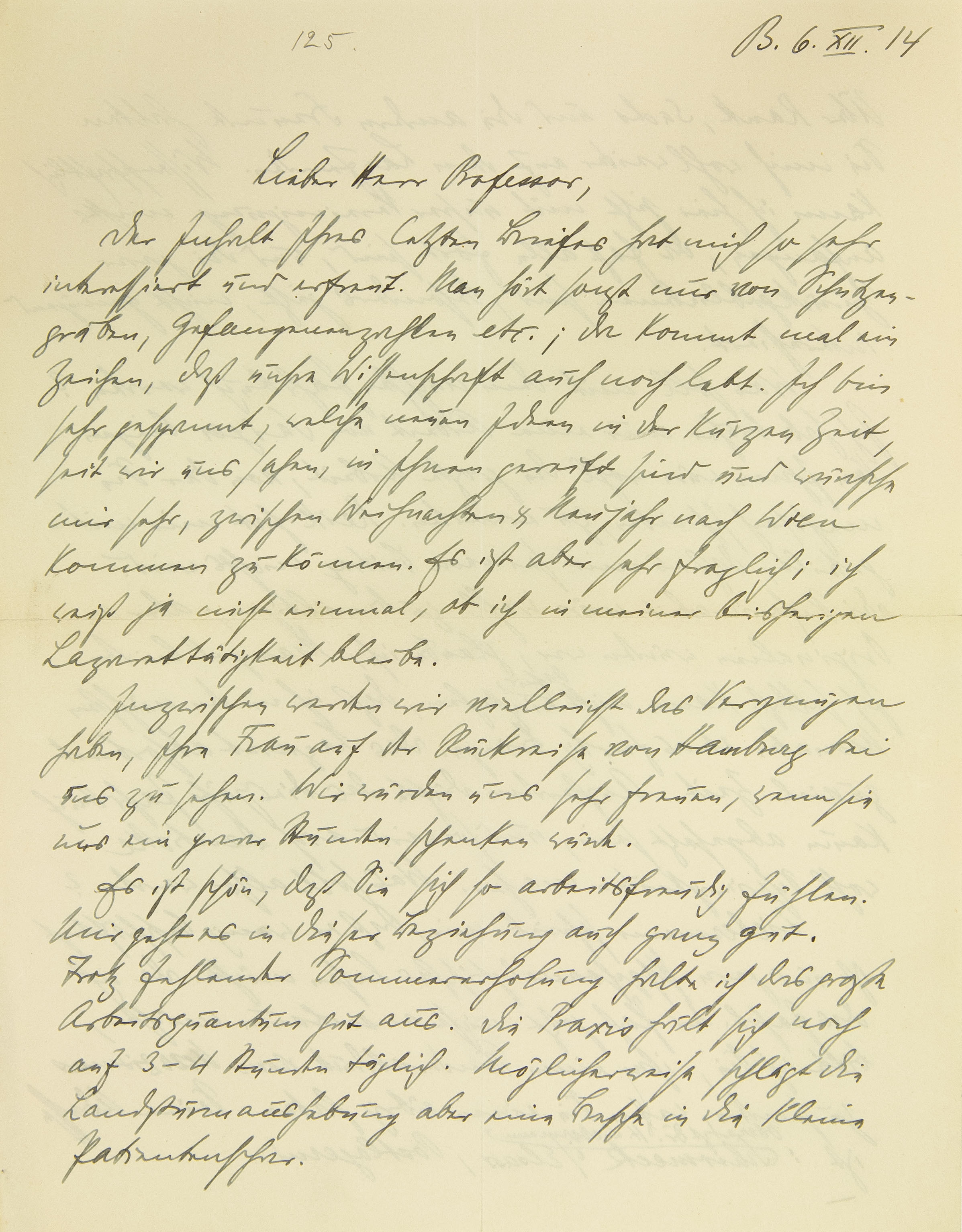 B.[erlin] 6. XII. 14 Lieber Herr Professor, Der Inhalt Ihres letzten Briefes hat mich so sehr interessiert und erfreut. Man hört sonst nur von Schützengräben, Gefangenenzahlen etc.; da kommt mal ein Zeichen, daß unsre Wissen- schaft auch noch lebt. Ich bin sehr gespannt, welche neue Ideen in der kurzen Zeit, seit wir uns sahen, in Ihnen gereift sind und wünsche mir sehr, zwischen Weihnachten und Neujahr nach Wien kommen zu können. Es ist aber sehr fraglich; ich weiß ja nicht einmal, ob ich in meiner bisherigen Lazarettätigkeit bleibe. Inzwischen werden wir vielleicht das Vergnügen haben, Ihre Frau auf der Rückreise von Hamburg bei uns zu sehen. Wir würden uns sehr freuen, wenn sie uns ein paar Stunden schenken würde. Es ist schön, daß Sie sich so arbeitsfreudig fühlen. Mir geht es in dieser Beziehung auch ganz gut. Trotz fehlender Sommererholung halte ich das große Arbeitsquantum gut aus. Die Praxis hält sich noch auf drei bis vier Stunden täglich. Möglicherweise schlägt die Landsturmaushebung aber eine Bresche in die kleine Patientenschar.