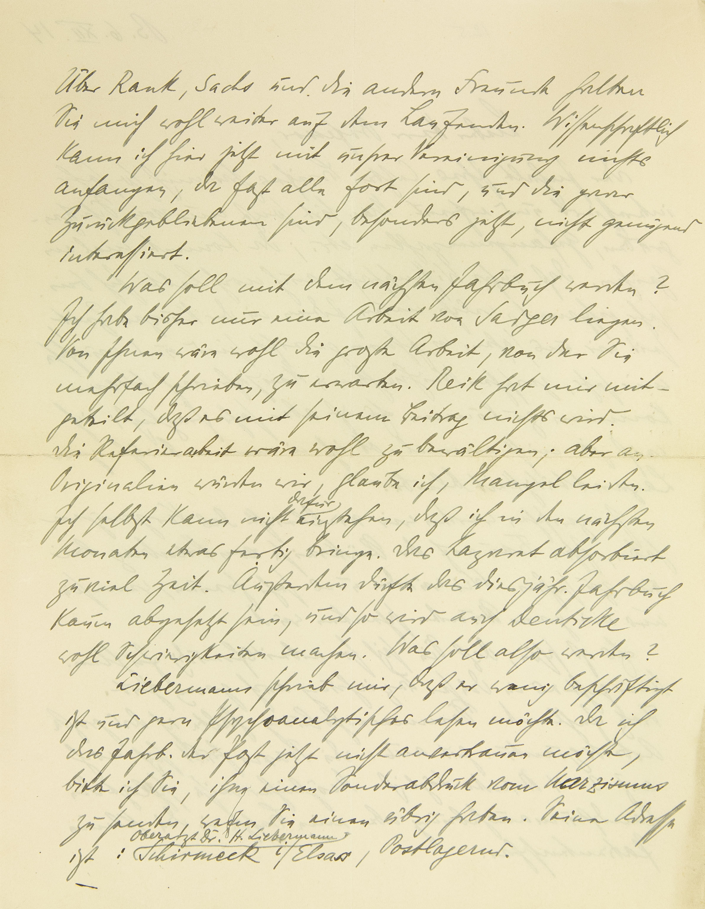 Über Rank und die andern Freunde halten Sie mich wohl weiter auf dem laufenden. Wissenschaftlich kann ich hier jetzt mit unsrer Vereinigung nichts anfangen, da fast alle fort sind, und die paar Zurückgebliebenen sind, besonders jetzt, nicht genügend interessiert. Was soll mit dem nächsten Jahrbuch werden? Ich habe bisher nur eine Arbeit von Sadger liegen. Von Ihnen wäre wohl die große Arbeit, von der Sie mehrfach schrieben, zu erwarten. Reik hat mir mitgeteilt, daß es mit seinem Beitrag nichts wird. Die Referierarbeit wäre wohl zu bewältigen; aber an Originalien würden wir, glaube ich, Mangel leiden. Ich selbst kann nicht dafür einstehen, daß ich in den nächsten Monaten etwas fertig bringe. Das Lazarett absorbiert zuviel Zeit. Außerdem dürfte das diesjährige Jahrbuch kaum abgesetzt sein, und so wird auch Deuticke wohl Schwierigkeiten machen. Was soll also werden? Liebermann schrieb mir, daß er wenig beschäftigt ist und gern Psychoanalytisches lesen möchte. Da ich das Jahrbuch der Post jetzt nicht anvertrauen möchte, bitte ich Sie, ihm einen Sonderabdruck vom Narzißmus zu senden, wenn Sie einen übrig haben. Seine Adresse ist: Oberarzt Dr. H. Liebermann , Schirmeck i/El- sass, Postlagernd.
