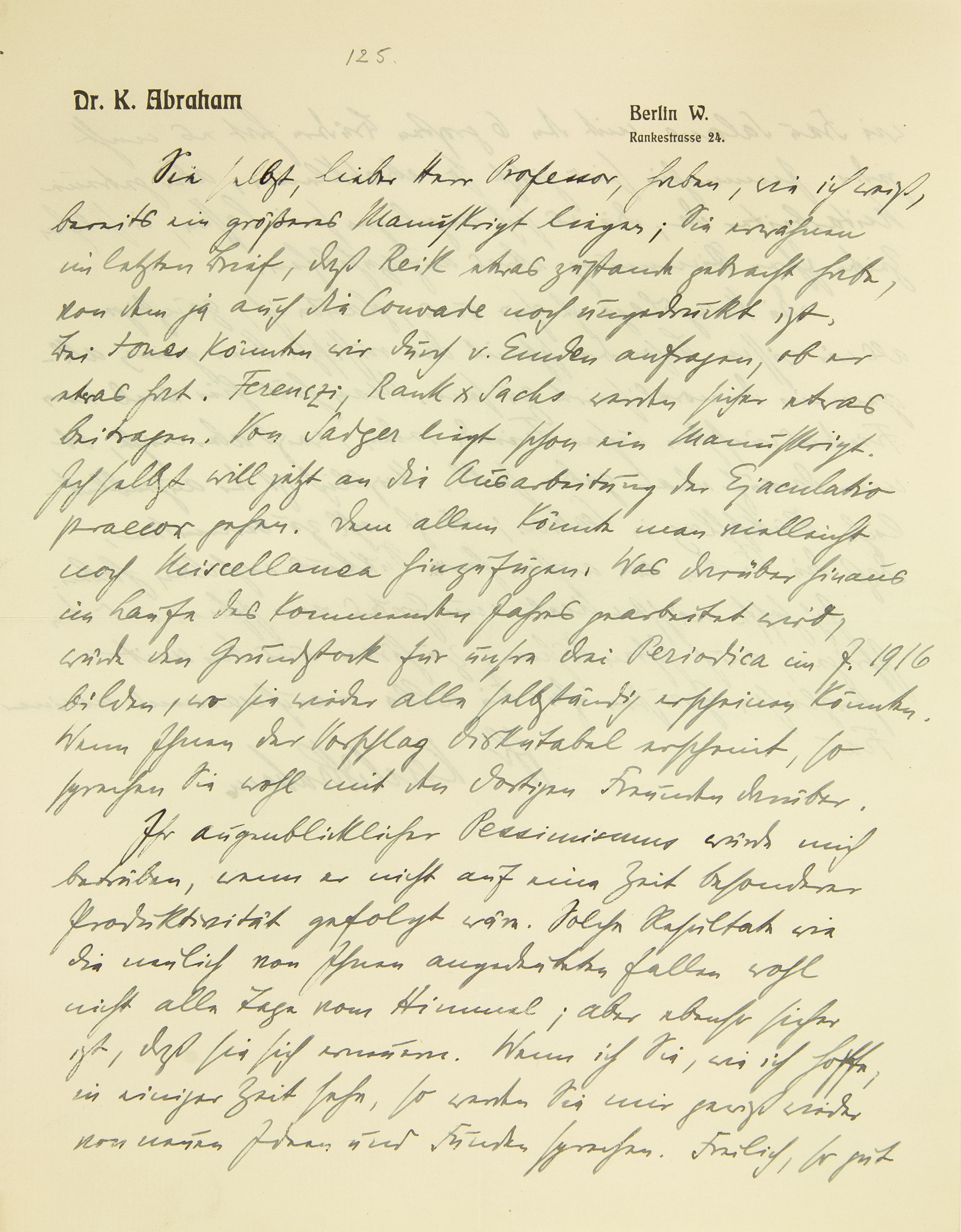 Sie selbst, lieber Herr Professor, haben, wie ich weiß, bereits ein größeres Manuskript liegen; Sie erwähnen im letzten Brief, daß Reik etwas zustande gebracht habe, von dem ja auch die Couvade noch ungedruckt ist. Bei Jones könnten wir durch van Emden anfragen, ob er etwas hat. Ferenczi, Rank und Sachs werden sicher etwas beitragen. Von Sadger liegt schon ein Manuskript. Ich selbst will jetzt an die Ausarbeitung der Ejaculatio praecox gehen. Dem allen könnte man vielleicht Miscellanea hinzufügen. Was darüber hinaus im Laufe des kommenden Jahres gearbeitet wird, würde den Grundstock für unsre drei Periodika im Jahre 1916 bilden, wo sie wieder alle selbständig erscheinen könnten. Wenn Ihnen der Vorschlag diskutabel erscheint, so sprechen Sie wohl mit den dortigen Freunden darüber. Ihr augenblicklicher Pessimismus würde mich betrüben, wenn er nicht auf eine Zeit besonderer Produktivität gefolgt wäre. Solche Resultate wie die neulich von Ihnen angedeuteten fallen wohl nicht alle Tage vom Himmel; aber ebenso sicher ist, daß sie sich erneuern. Wenn ich Sie, wie ich hoffe, in einiger Zeit sehe, so werden Sie mir gewiß wieder von neuen Ideen und Funden sprechen. Freilich, so gut