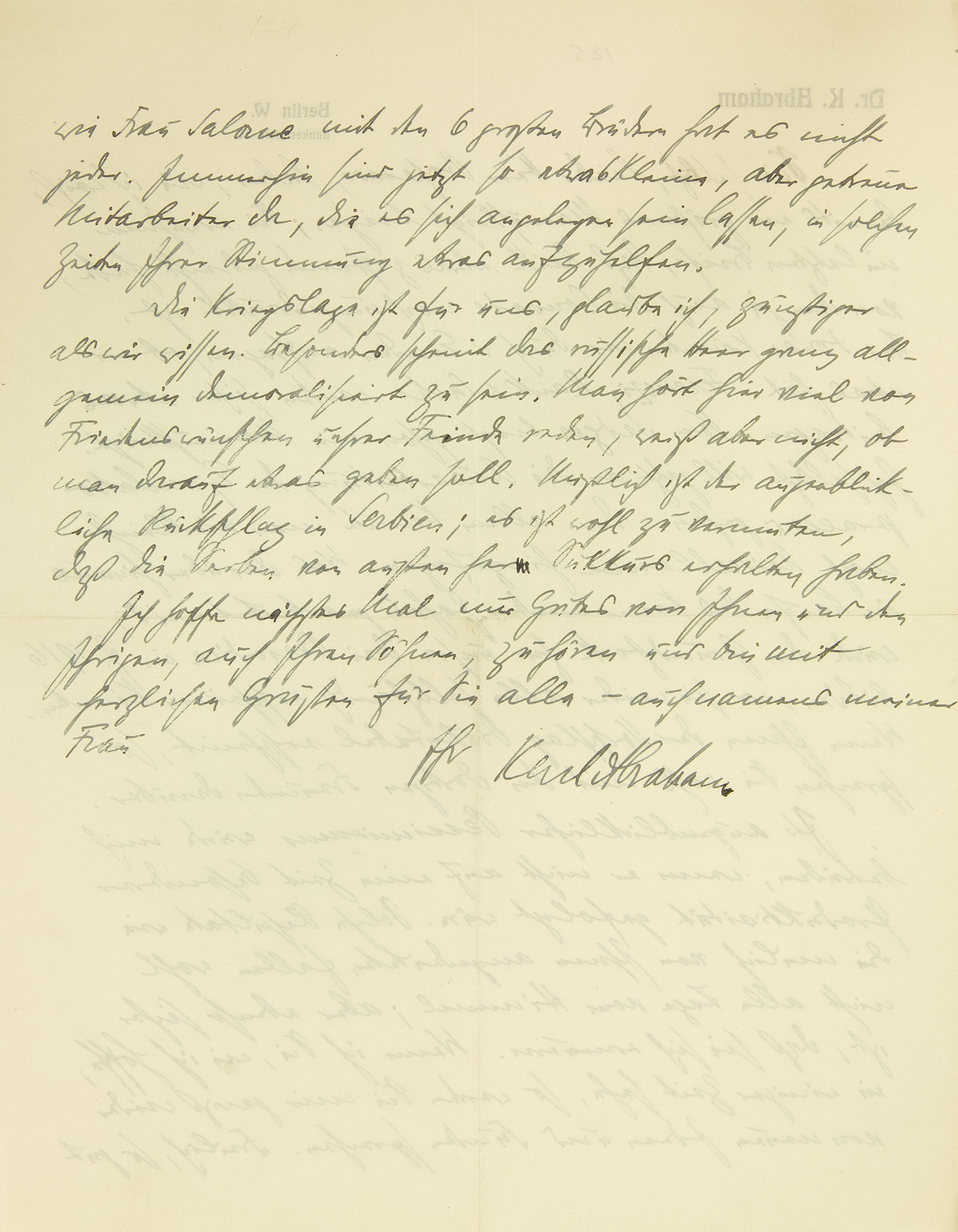 wie Frau Salomé mit den sechs großen Brüdern hat es nicht jeder. Immerhin sind jetzt so etwa sechs kleine, aber getreue Mitarbeiter da, die es sich angelegen sein lassen, in solchen Zeiten Ihrer Stimmung etwas aufzuhelfen. Die Kriegslage ist für uns, glaube ich, günstiger als wir wissen. Besonders scheint das russische Heer ganz allgemein demoralisiert zu sein. Man hört hier viel von Friedenswünschen unsrer Feinde reden, weiß aber nicht, ob man darauf etwas geben soll. Mißlich ist der augenblickliche Rückschlag in Serbien; es ist wohl zu vermuten, daß die Serben von außen her Sukkurs erhalten haben. Ich hoffe nächstes Mal nur Gutes von Ihnen und den Ihrigen, auch Ihren Söhnen, zu hören und bin mit herzlichen Grüßen für Sie alle – auch namens meiner Frau Ihr Karl Abraham