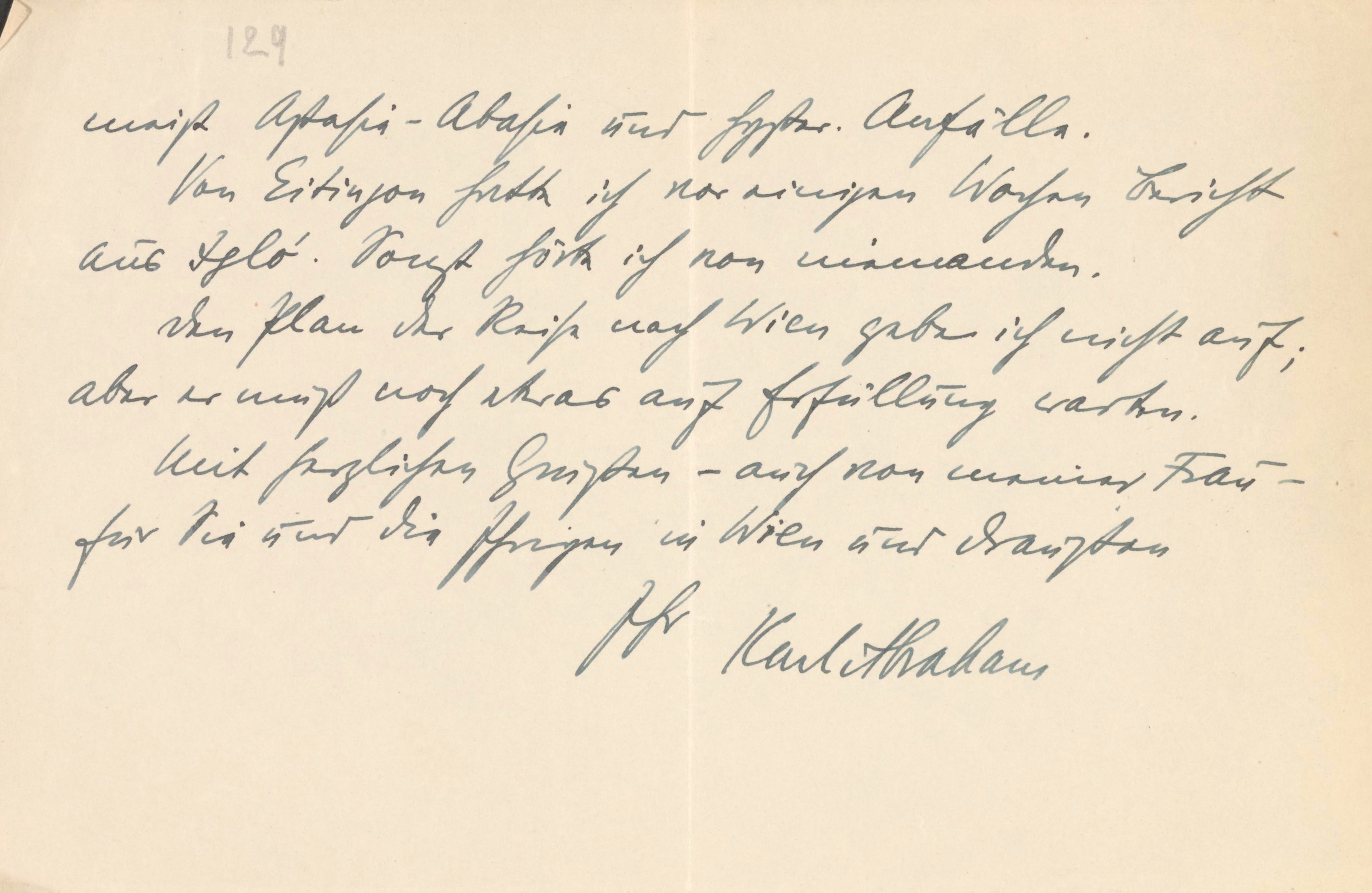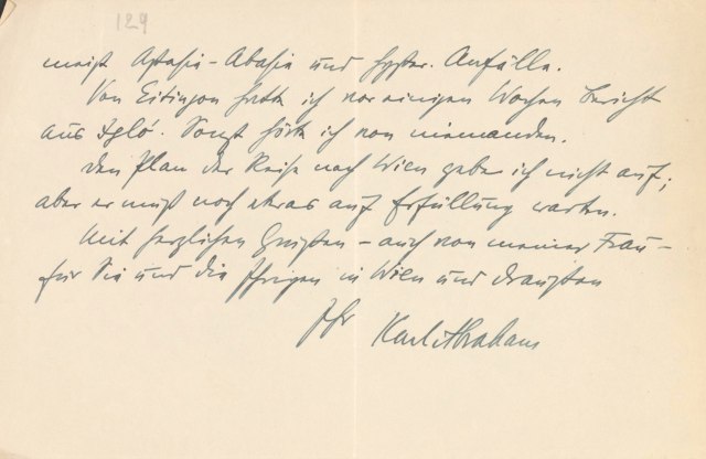 meist Aphasie-Abasie und hysterische Anfälle. Von Eitingon hatte ich vor einigen Wochen Bericht aus Igló. Sonst hörte ich von niemandem. Den Plan der Reise nach Wien gebe ich nicht auf; aber er muß noch etwas auf Erfüllung warten. Mit herzlichen Grüßen – auch von meiner Frau – für Sie und die Ihrigen in Wien und draußen Ihr Karl Abraham