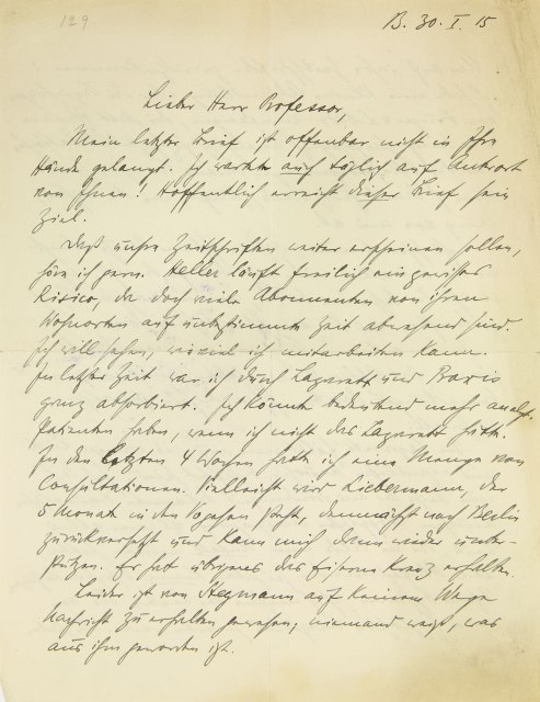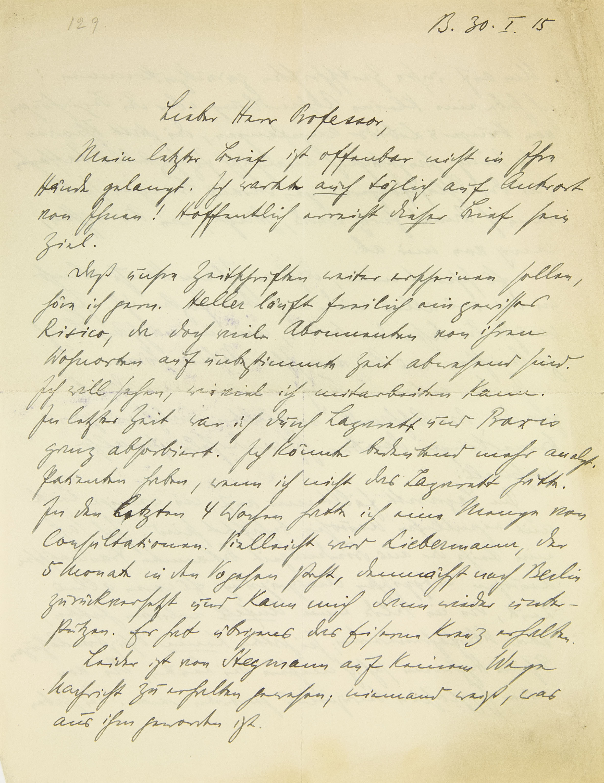 B.[erlin] 30. I. 15 Lieber Herr Professor, Mein letzter Brief ist offenbar nicht in Ihre Hände gelangt. Ich wartete auch täglich auf Antwort von Ihnen! Hoffentlich erreicht dieser Brief sein Ziel. Daß unsre Zeitschriften weiter erscheinen sollen, höre ich gern. Heller läuft freilich ein gewisses Risiko, da doch viele Abonnenten von ihren Wohnorten auf unbestimmte Zeit abwesend sind. Ich will sehen, wieviel ich mitarbeiten kann. In letzter Zeit war ich durch Lazarett und Praxis ganz absorbiert. Ich könnte bedeutend mehr analytische Patienten haben, wenn ich nicht das Lazarett hätte. In den letzten vier Wochen hatte ich eine Menge von Konsultationen. Vielleicht wird Liebermann, der fünf Monate in den Vogesen steht, demnächst nach Berlin zurückversetzt und kann mich dann wieder unterstützen. Er hat übrigens das Eiserne Kreuz erhalten. Leider ist von Stegmann auf keinem Wege Nachricht zu erhalten gewesen; niemand weiß, was aus ihm geworden ist.