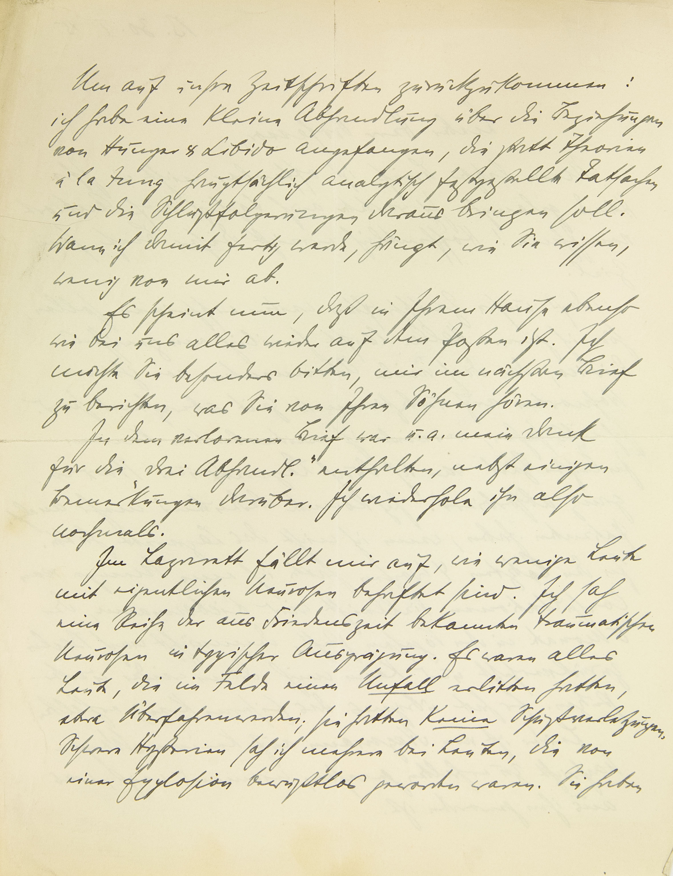 Um auf unsre Zeitschriften zurückzukommen: ich habe eine kleine Abhandlung über die Beziehungen von Hunger und Libido angefangen, die statt Theorien à la Jung hauptsächlich analytisch festgestellte Tatsachen und die Schlußfolgerungen daraus bringen soll. Wann ich damit fertig werde, hängt, wie Sie wissen, wenig von mir ab. Es scheint nun, daß in Ihrem Hause ebenso wie bei uns alles wieder auf dem Posten ist. Ich möchte Sie besonders bitten, mir im nächsten Brief zu berichten, was Sie von Ihren Söhnen hören. In dem verlorenen Brief war u.a. mein Dank für die »Drei Abhandlungen« enthalten, nebst einigen Bemerkungen darüber. Ich wiederhole ihn also nochmals. Im Lazarett fällt mir auf, wie wenige Leute mit eigentlichen Neurosen behaftet sind. Ich sah eine Reihe der aus Friedenszeit bekannten traumatischen Neurosen in typischer Ausprägung. Es waren alles Leute, die im Felde einen Unfall erlitten hatten, etwa Überfahrenwerden; sie hatten keine Schußverletzungen. Schwere Hysterien sah ich mehrere bei Leuten, die von einer Explosion bewußtlos geworden waren. Sie haben