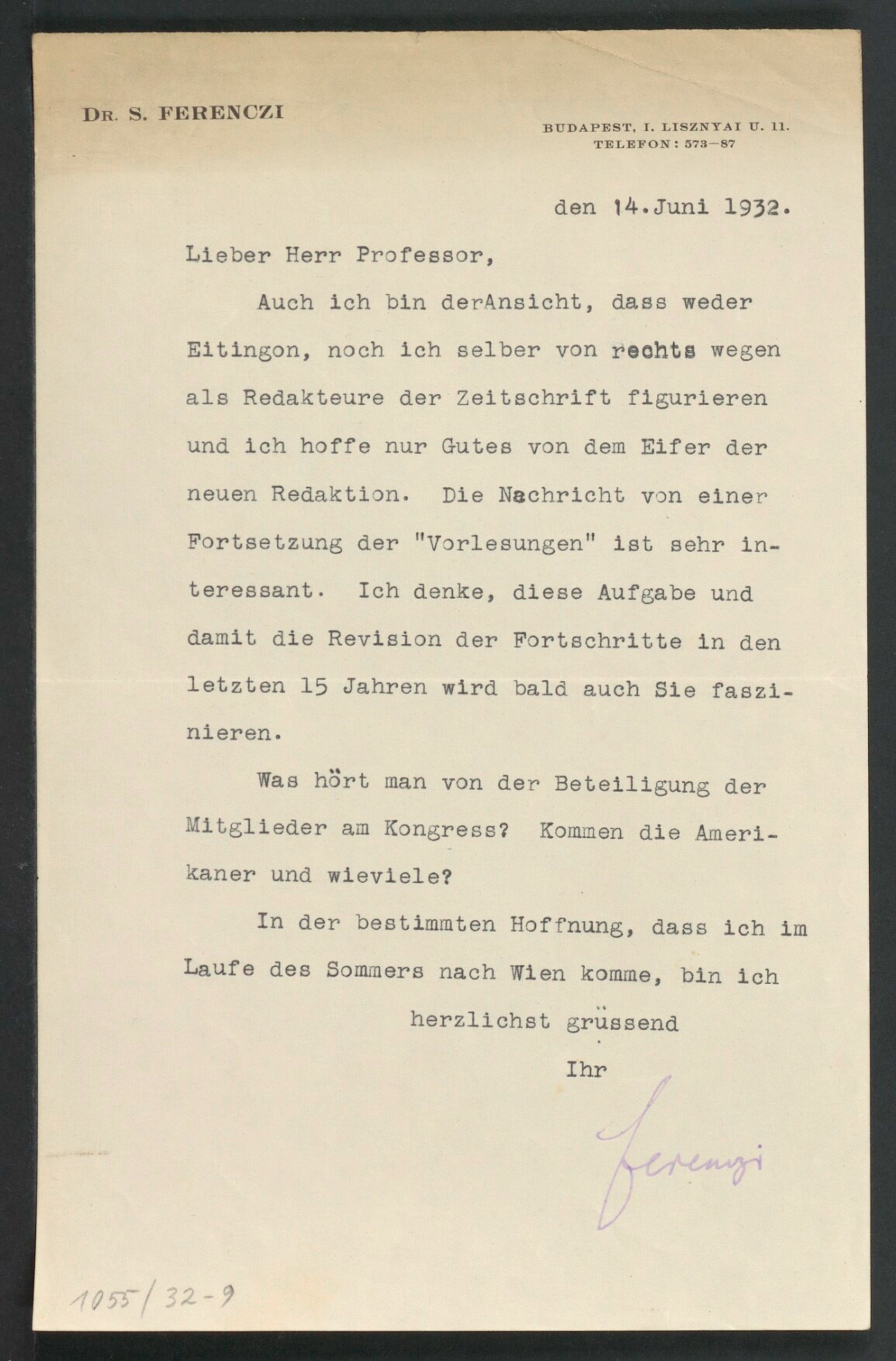 Freud, Sigmund, 1856-1939 [VerfasserIn] ; Ferenczi, Sándor, 1873-1933 [AdressatIn]